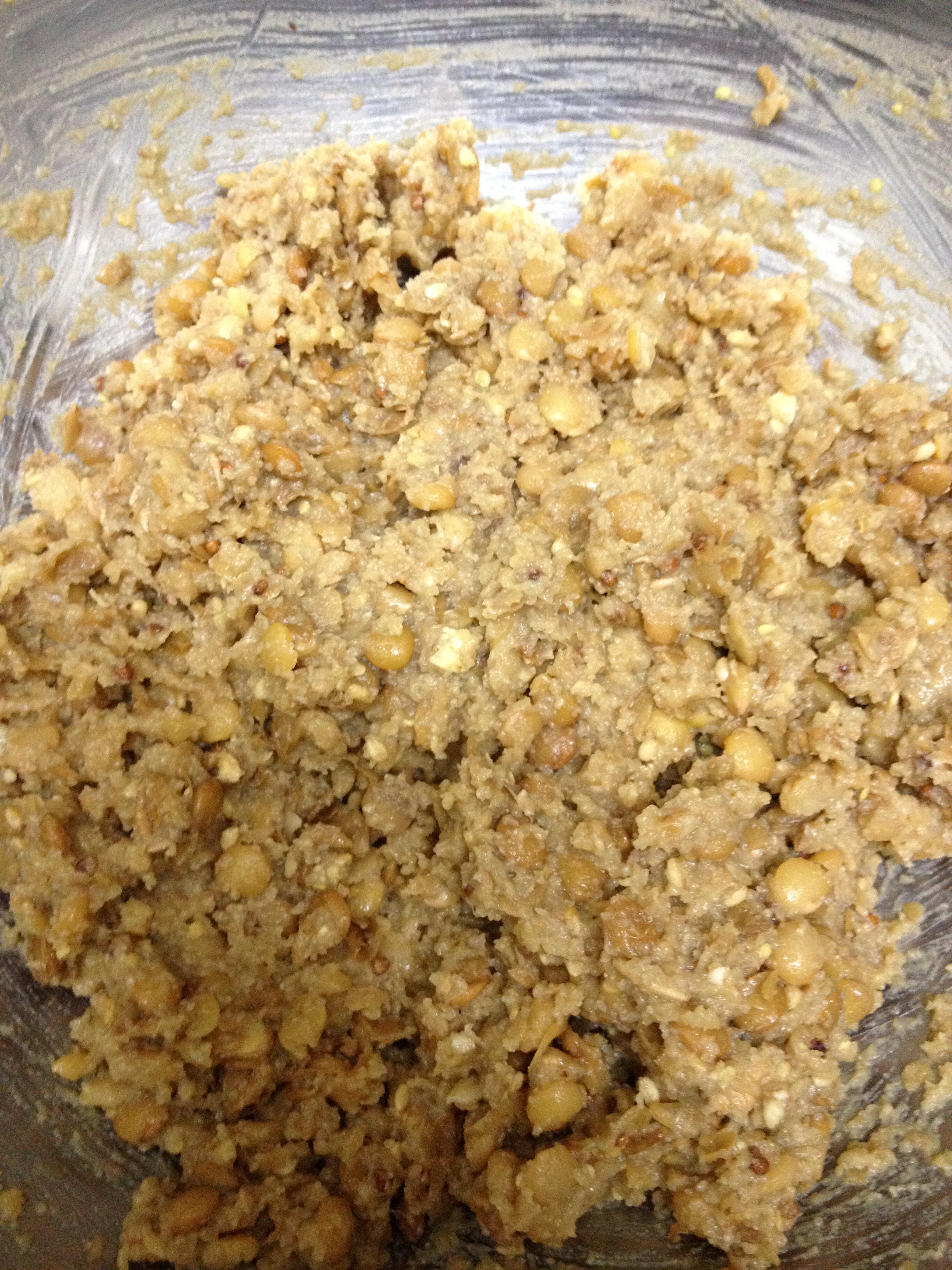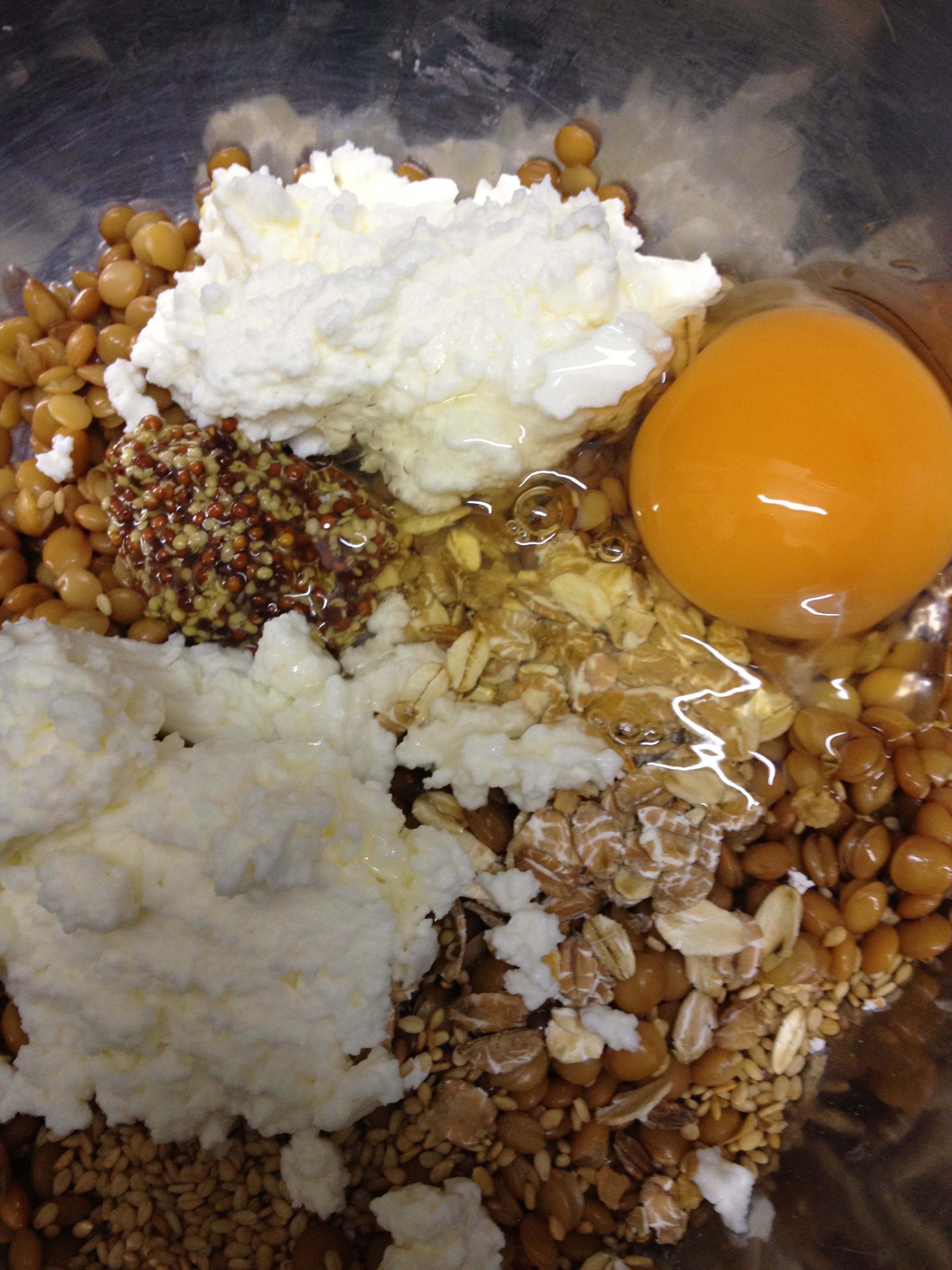 Incorporar el resto de ingredientes: huevos, pan rallado, mostaza, avena, sésamo y el requesón, con cuidado de no perder el conocimiento dada la complejidad del proceso. Descansar si fuera necesario.