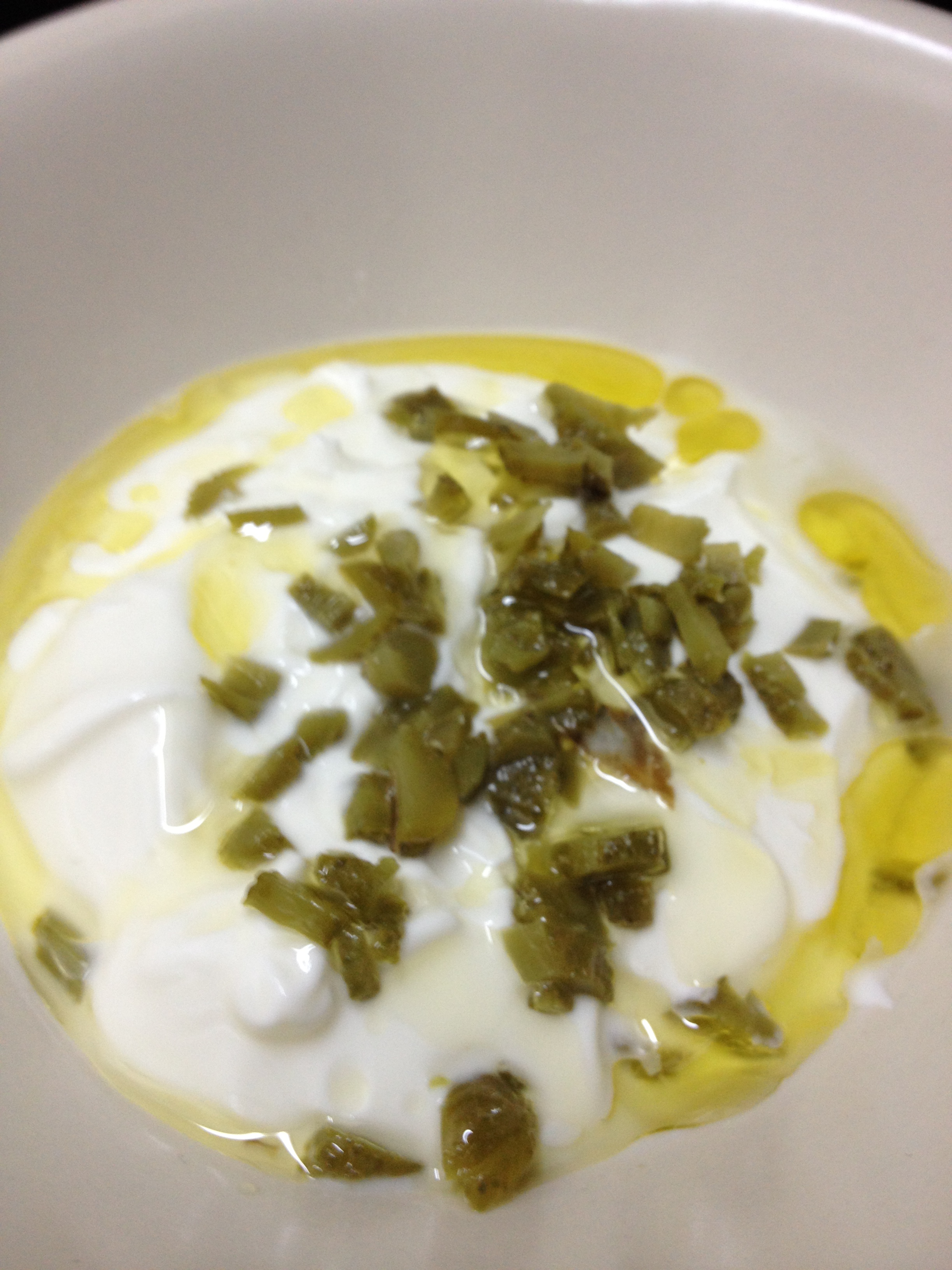 Por otro lado, picamos los pepinillos y los incorporamos al yogur junto con el limón, el aceite (el doble de aceite que de limón) y la sal. Yo además le pongo un par de gotillas de tabasco, que le dan un poco de alegría al plato, pero es opcional. Mezclamos.