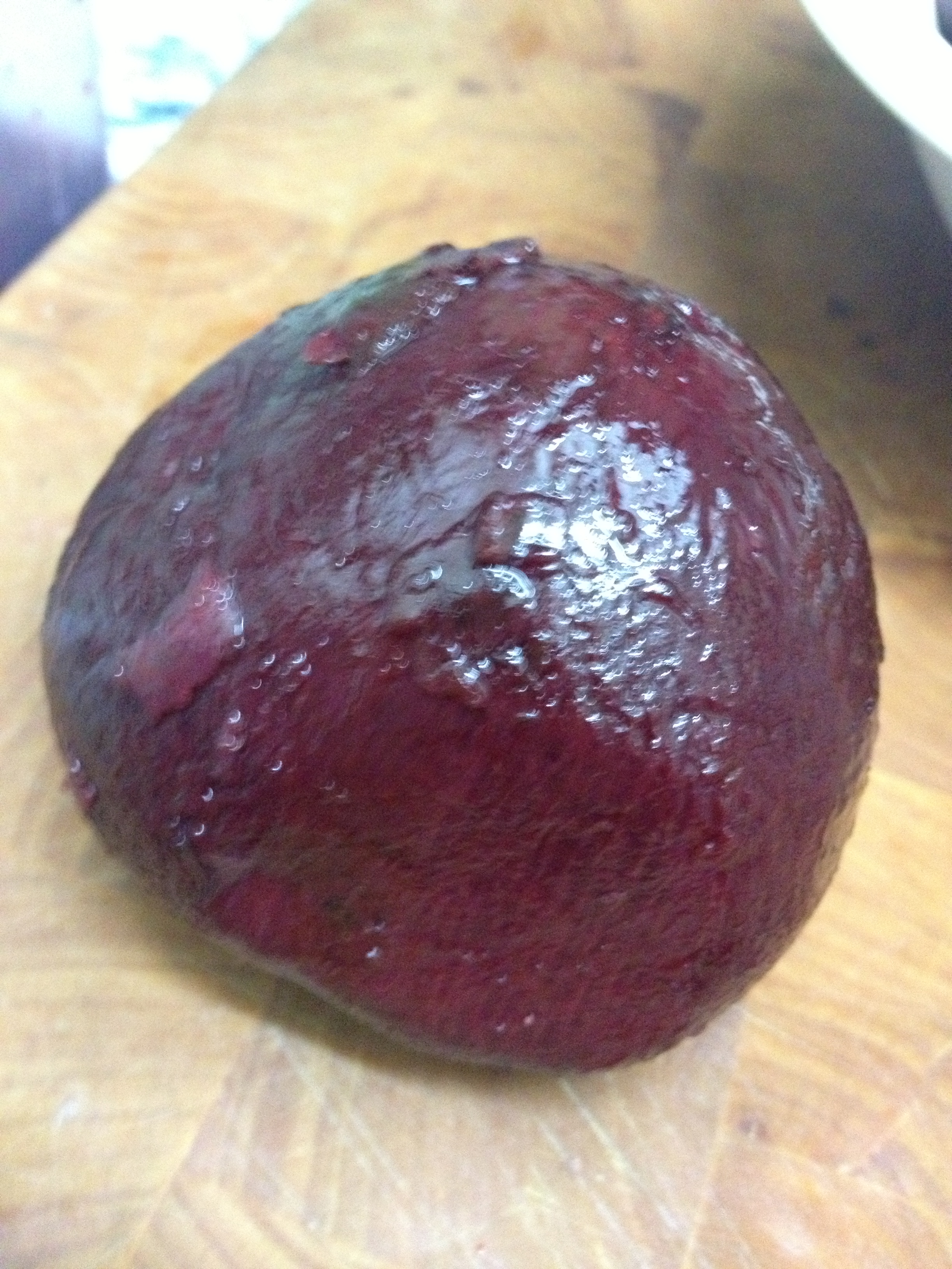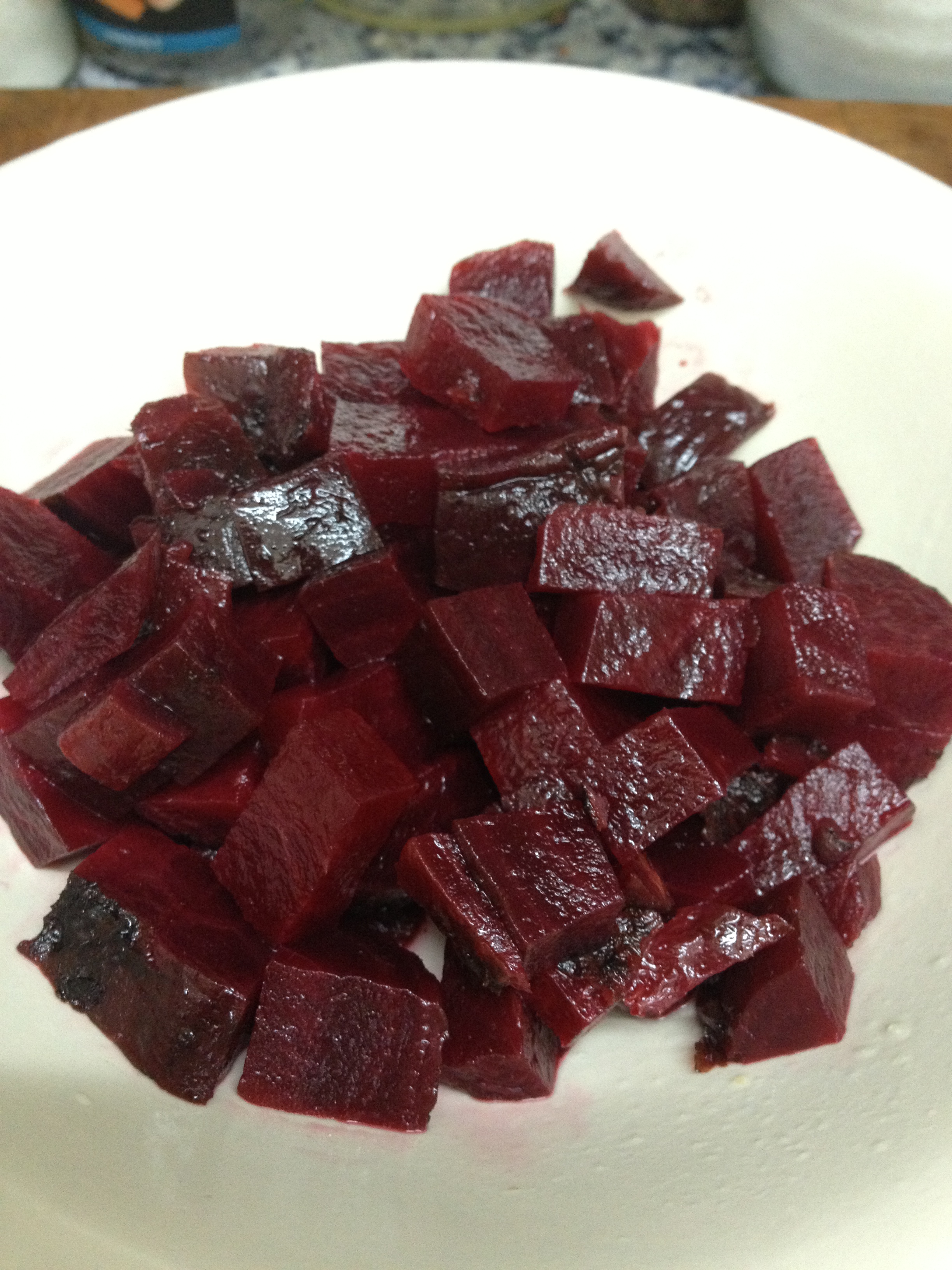 Cortamos la remolacha cocida en dados de 1x1cm y la ponemos en el vaso batidor