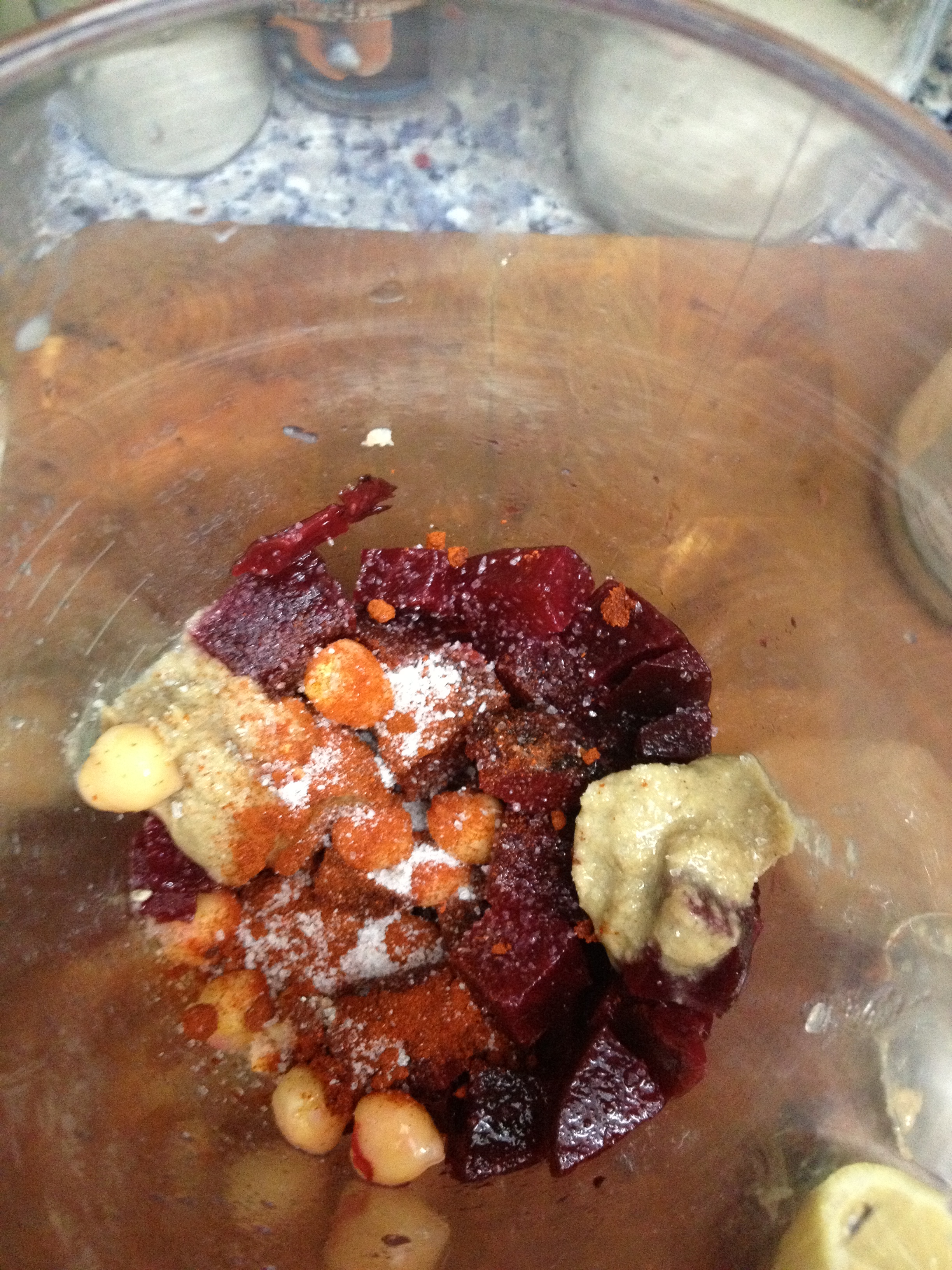 Ahora ponemos el zumo de limón (las pepitas os las podéis guardar para haceros un collar, no hace falta echarlas), el tahín o pasta de sésamo, el pimentón, los ajos partiéndolos longitudinalmente y eliminando el corazón (el que quiera, yo a esta no le puse y sale igual de bueno) y finalmente trituramos.