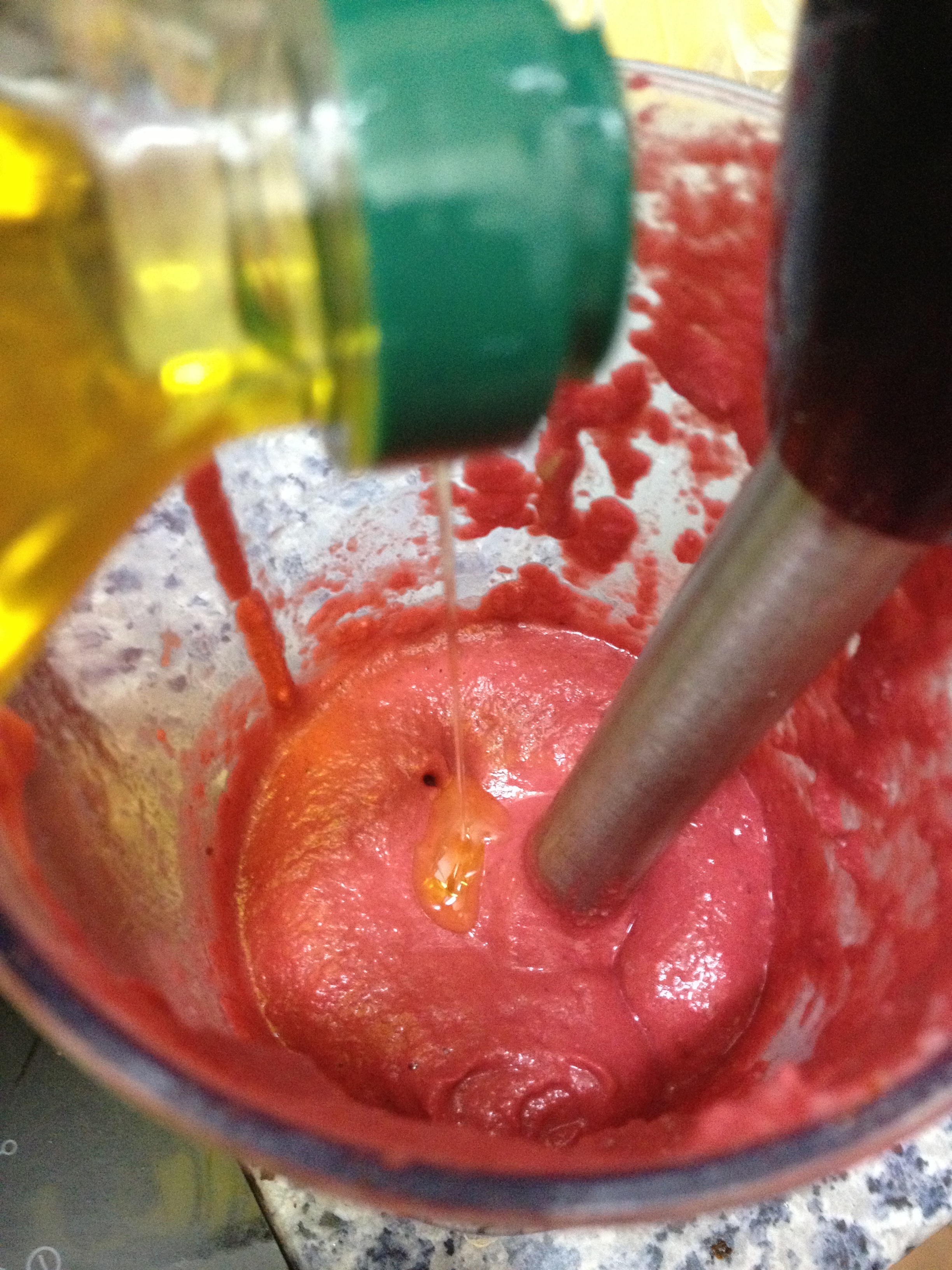 Una vez triturado, echamos aceite al hilo, lo que viene siendo poco a poco, pero dicho correctamente y más moderno. No hay que poner demasiado; como un par de cucharadas (calculadas a ojais).