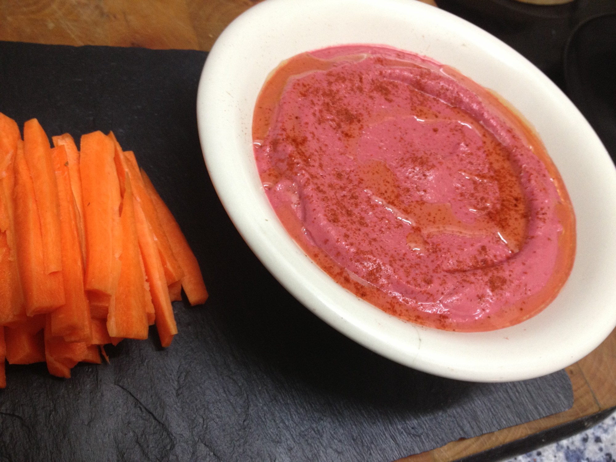 Para acabar, cortamos bastoncitos de zanahoria para comer el plato y también se pueden tostar unas rebanadas de pan. Espolvoreamos pimentón por encima del hummus, regamos con un chorrete de aceite de oliva virgen extra y todos felices como perdices.