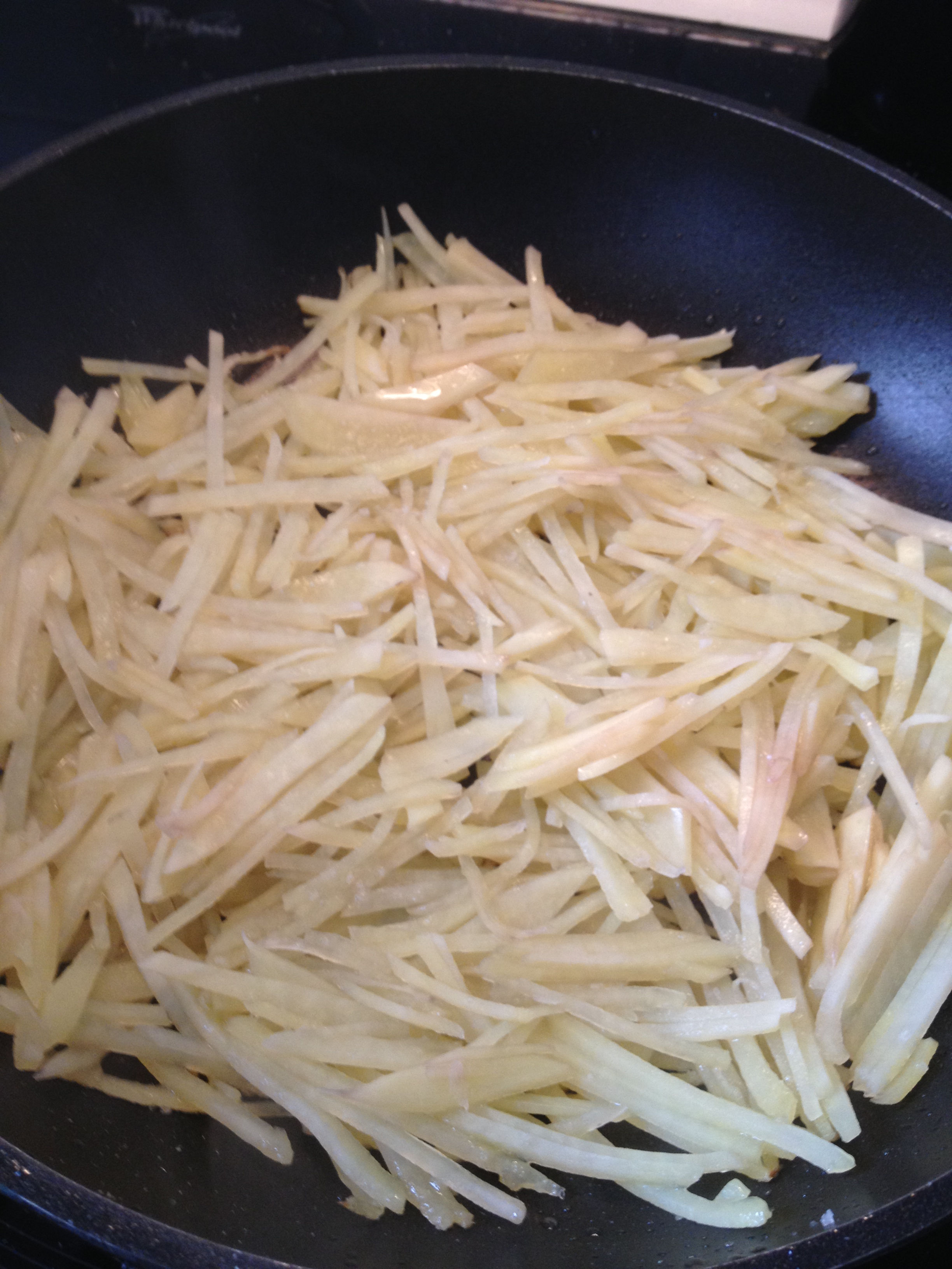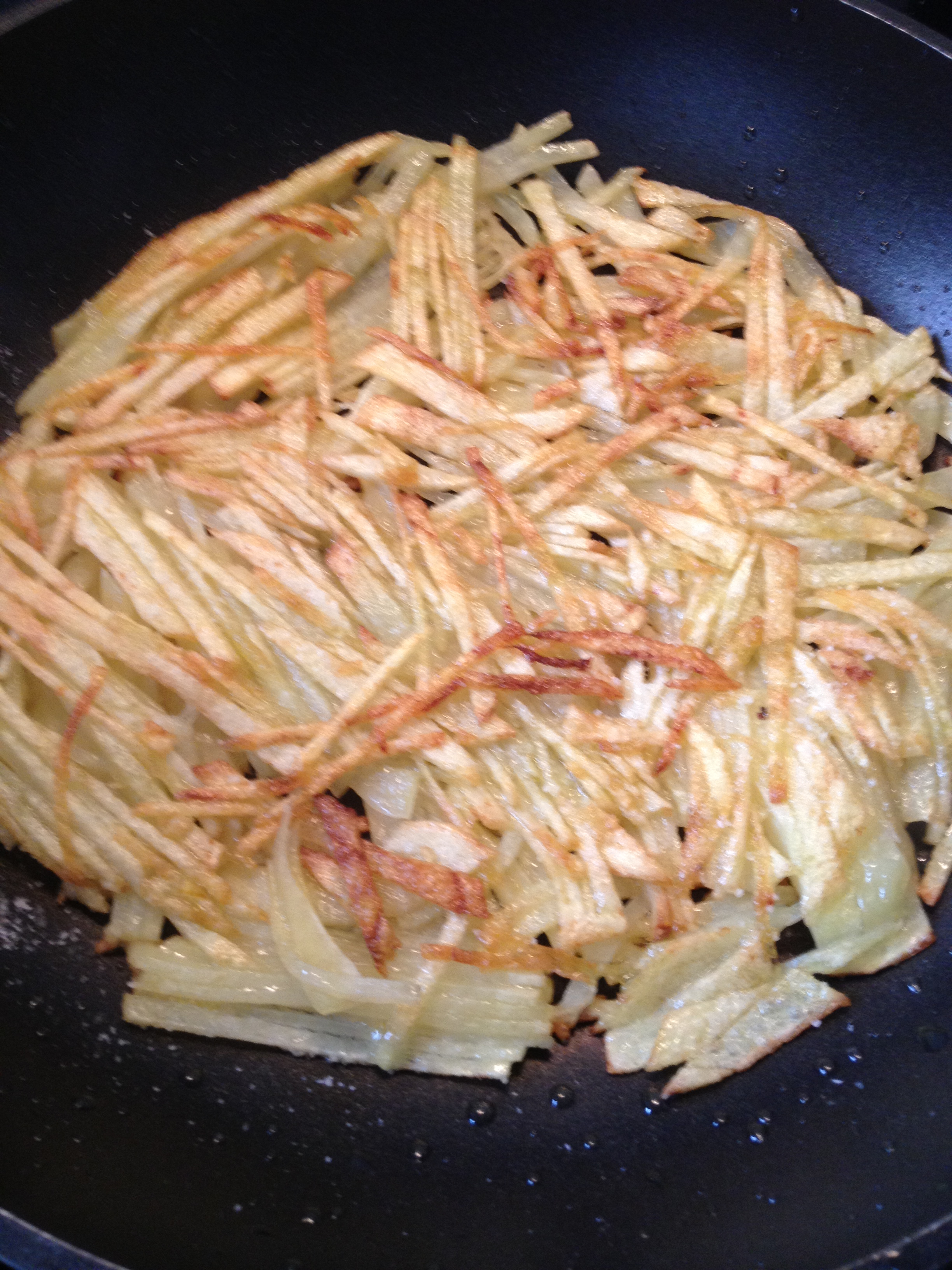 Pelamos las papas y las cortamos en tiras muy finitas, o si vas con un poco de prisa, las rallamos con un rallador grande. Sazonamos antes de echar a la sartén donde habremos puesto un chorrito de aceite de oliva y ponemos una cantidad más o menos como la de la foto para cada comensal. Lo interesante sería que no toqueteárais las patatas para que cuando vayan soltando el almidón, se peguen unas a otras y nos monte la estructura que buscamos, pero ¡¡cuidadito de no carbonizarlas, que os veo venir!!