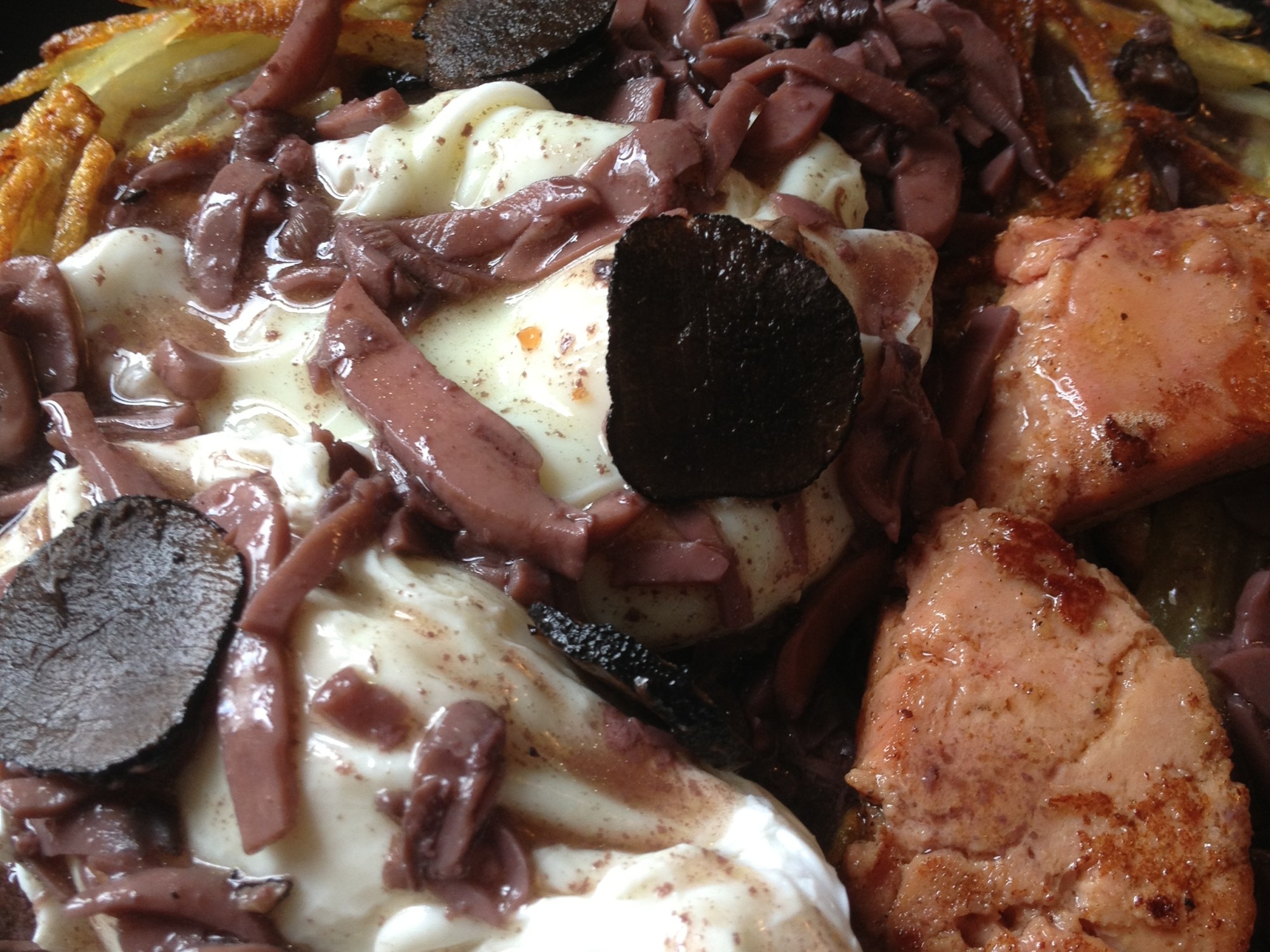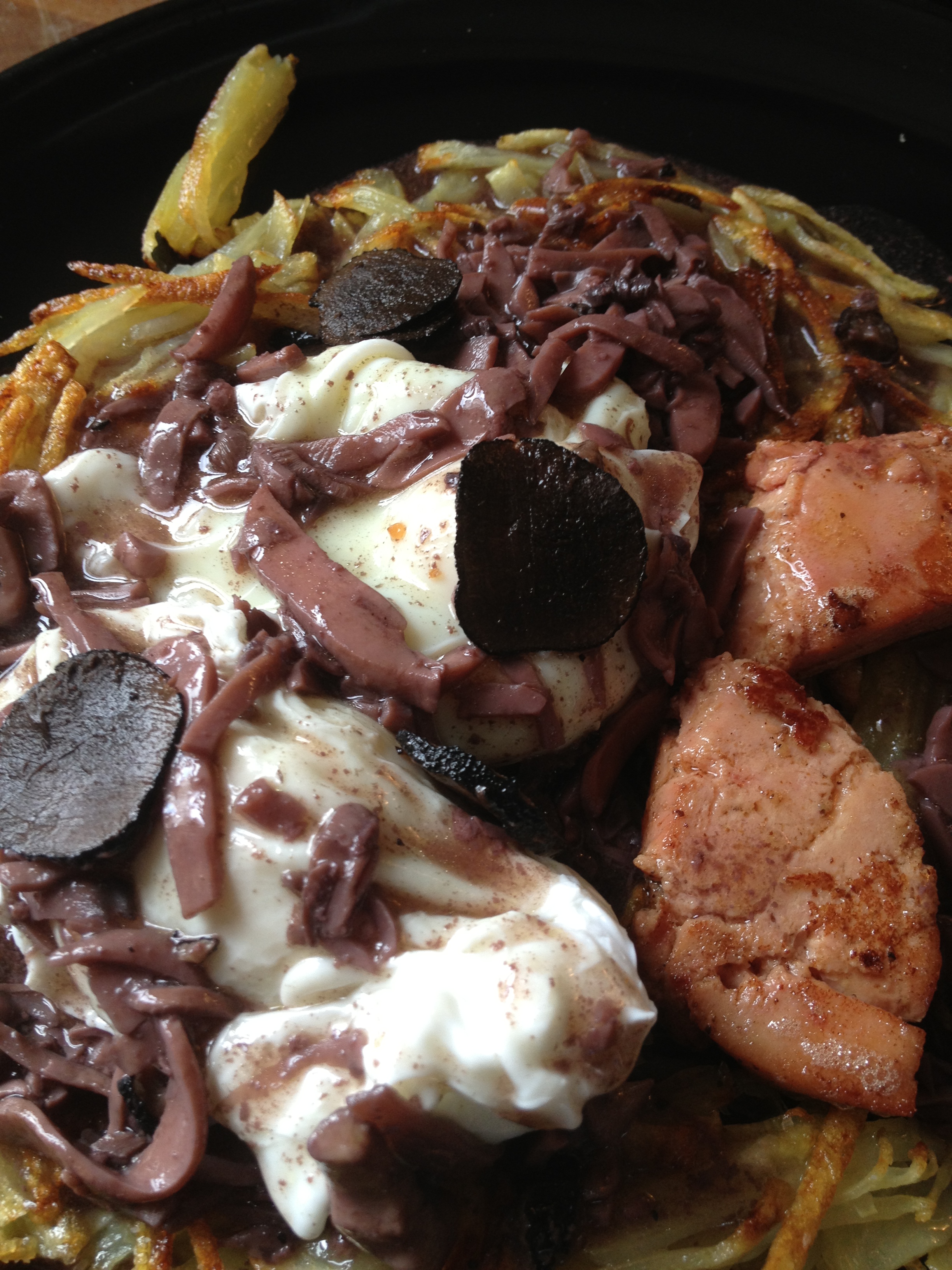 Emplatamos poniendo una camita de patatas, con el huevo encima, el foie, la salsa y unas láminas de la otra trufa que nos quedaba. Cuando abráis el huevo, veréis como sale toda la yema, haciendo un tsunami maravilloso de color y sabor!! Y agarraos a la silla porque este plato hace que te caigas de espaldas. Avisados estáis.