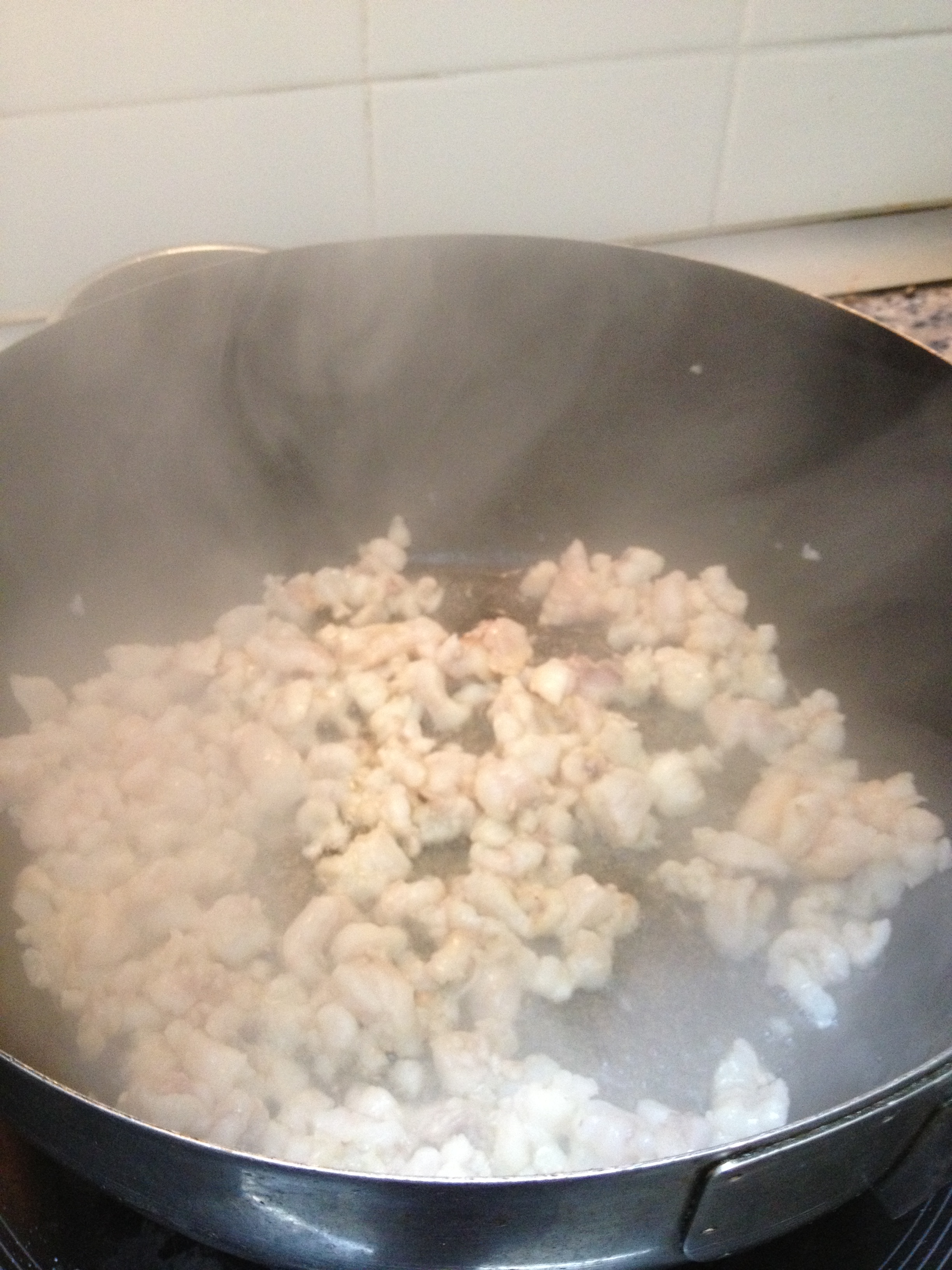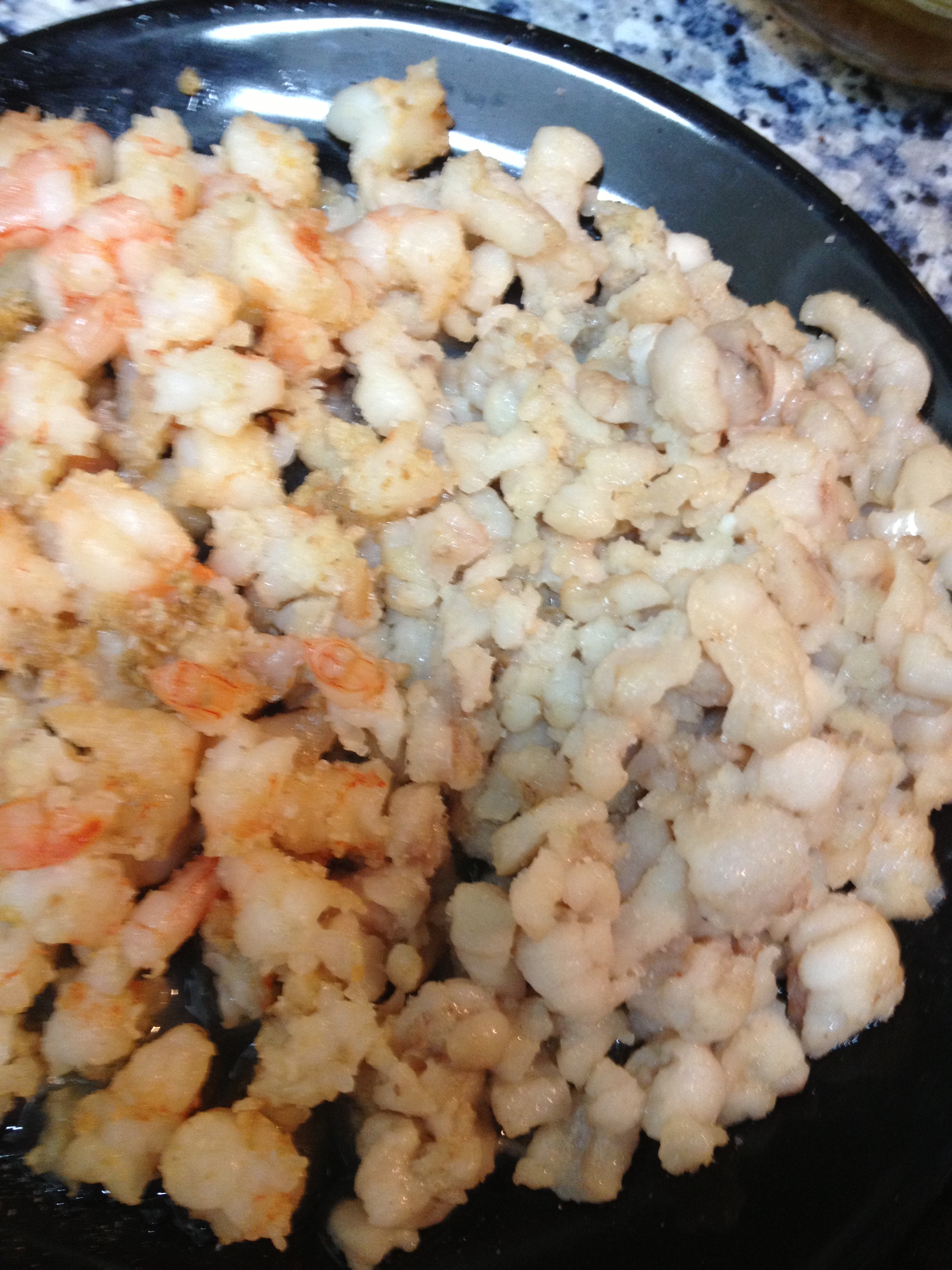 Ahora ponemos las gambas (al ser congeladas, si las ponemos con el rape igual hace que se nos cueza el rape) a fuego máximo también y las removemos un par de minutos. Cuando estén casi hechas, las partimos con la espátula que estemos usándo para que también queden trozos majetes. Sacamos y sazonamos el rape y las gambas.
