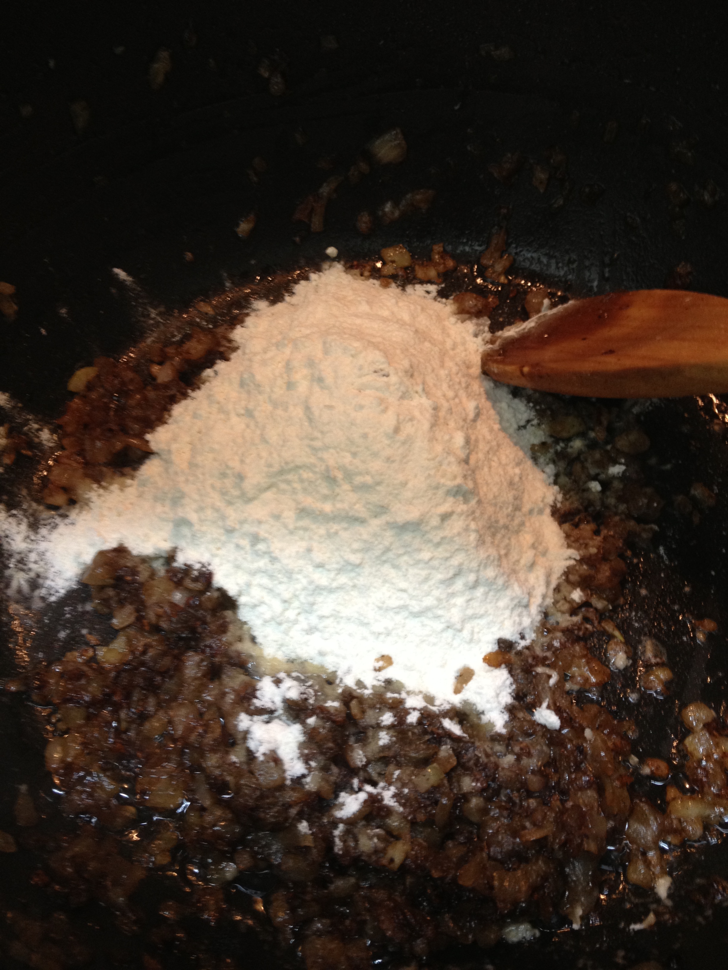 Ahora vamos con la bechamel. Lo primero que hay que hacer para que no nos pille el Toro Montoro es poner a calentar la leche y el caldo. Con templar es suficiente; no queremos la temperatura de la lava. Vamos a aprovechar el aceite donde hemos hecho el rape y las gambas para hacerla ahí. Ponemos una nuez de mantequilla y cuando se derrita echamos la cebolla cortada en brunoise (daditos lo más pequeños posible) a fuego medio-alto. Cuando esté transparente y empiece a coger color, echamos la harina para que se dore. No me seáis garrulas y me echéis la harina cruda encima de la leche porque os quedarán unos grumacos del tamaño de África.