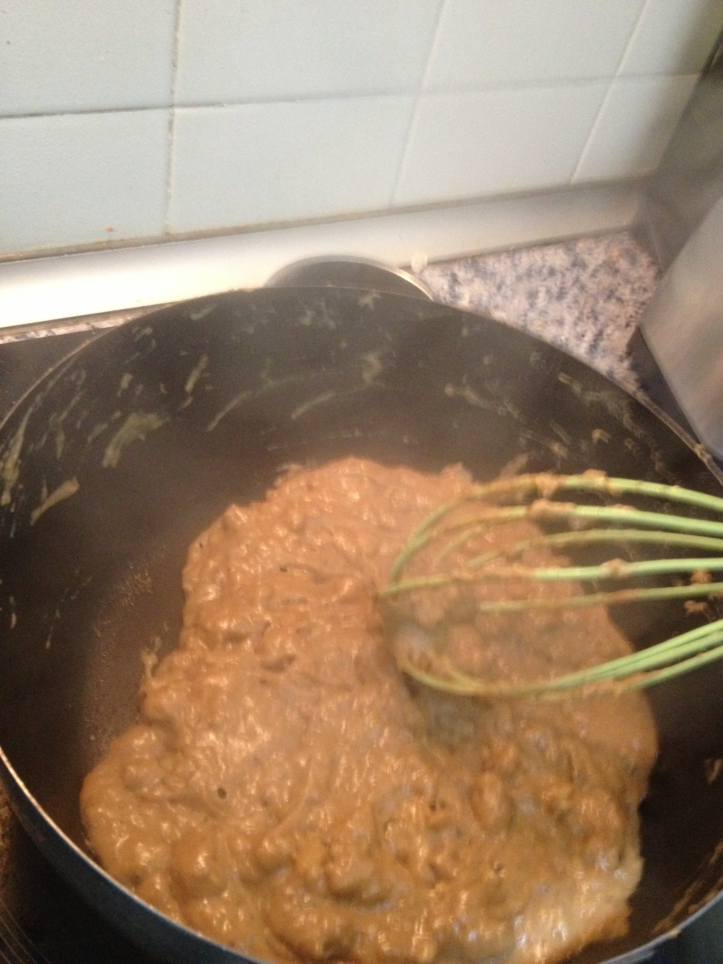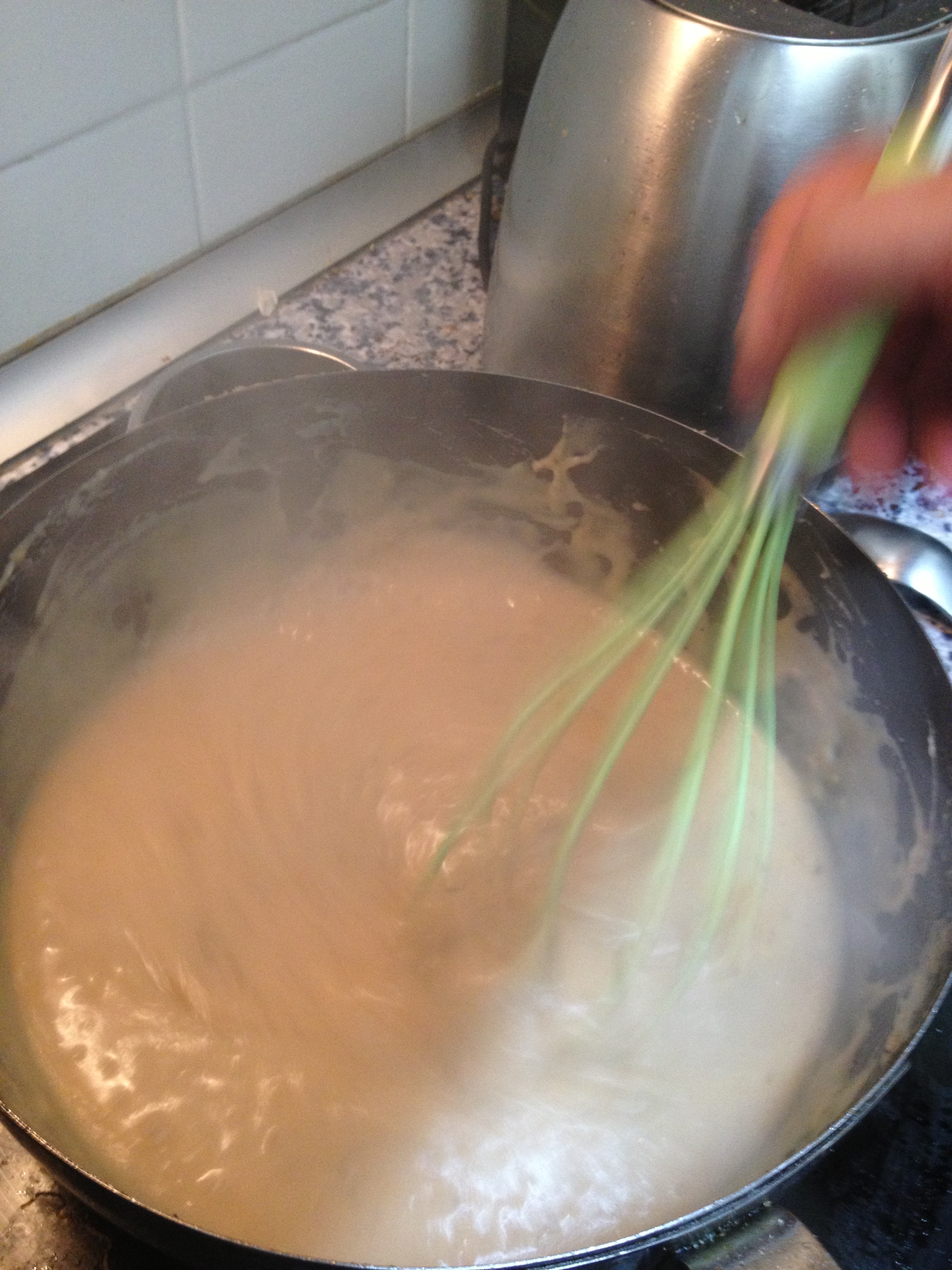 Ahora vamos añadiendo la leche y el caldo calientes poco a poco sin dejar de remover con un batidor de varillas. Añadir la nuez moscada y rectificar de sal.