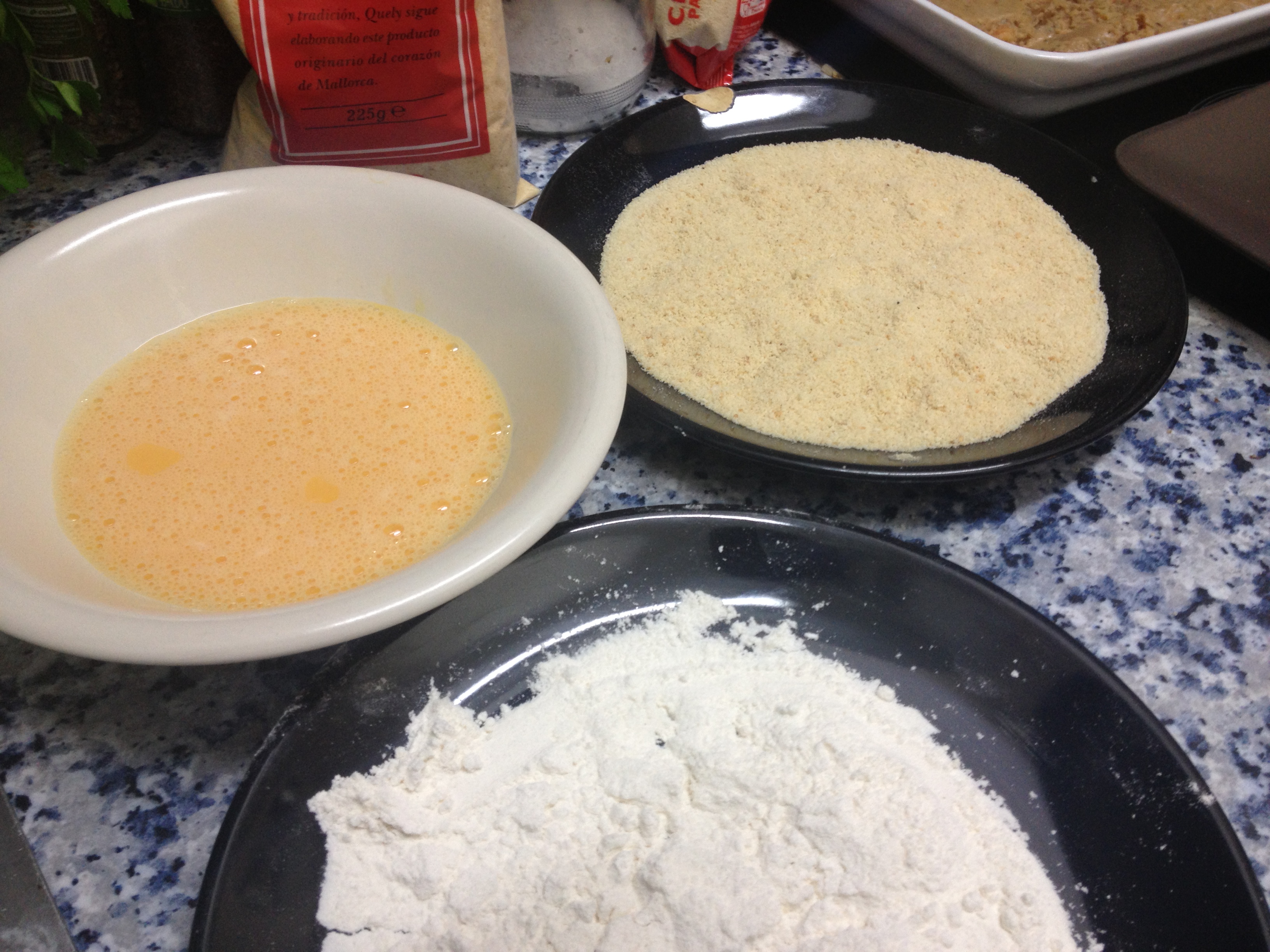 Después de unas horas de reposo, ahora llega el mágico momento de hacer las croquetas. Para el proceso, vamos a utilizar harina, huevo y pan (secar, mojar, secar).