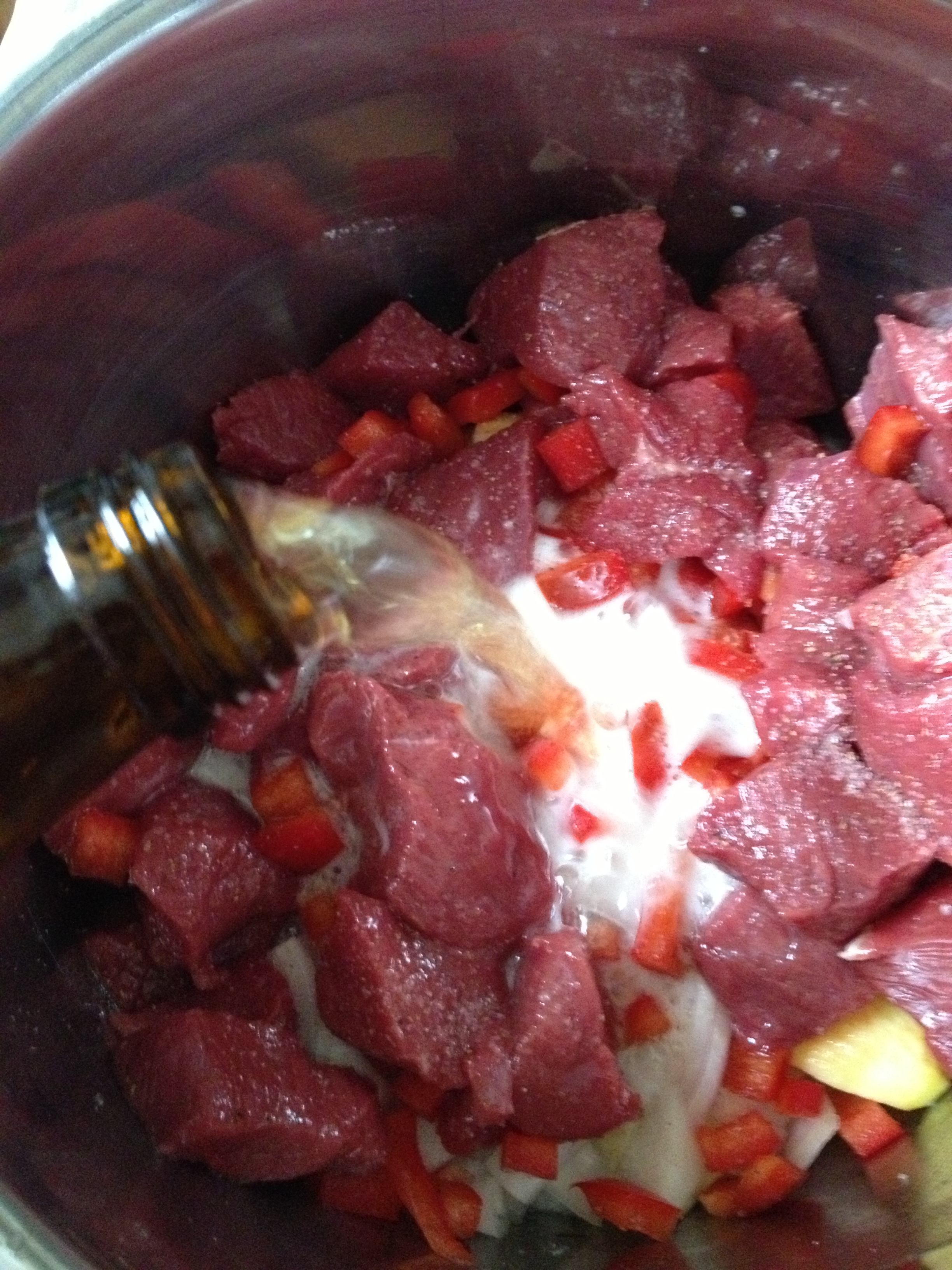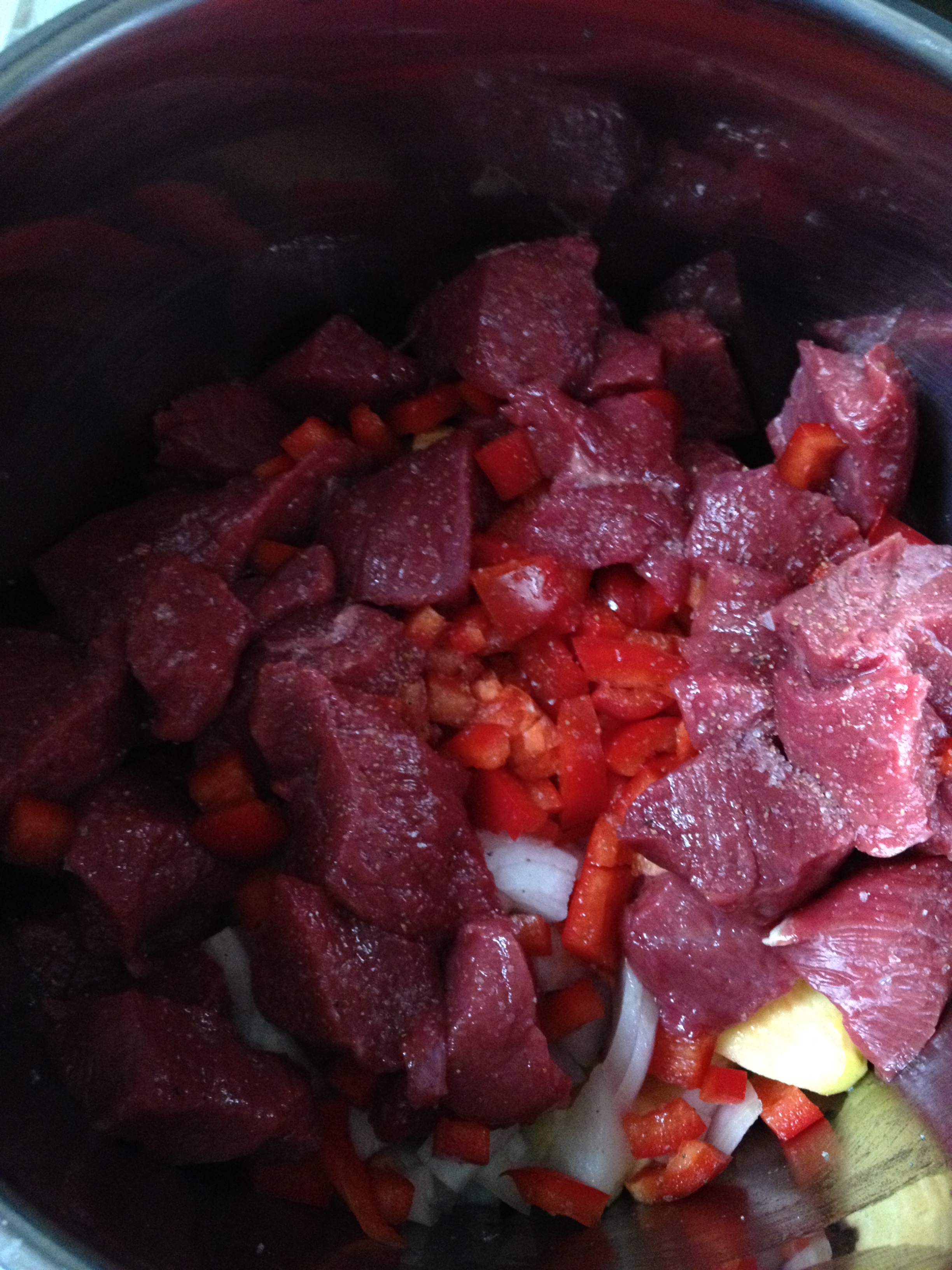 Vamos a macerar el ciervo durante 48h. Deberíais comprar la carne de ciervo que viene cortada en dados (ellos, los nobles, le llaman ragú y así lo pone en el envase). Estos dados, los partiremos por la mitad, dejando taquitos de 2x2cm. aprox. y los echamos en una olla o cazuela, después de salpimentarlos. Partimos la cebolla, la manzana y el pimiento en dados majos de unos 3 cm y los echamos a la olla con la carne. Partimos los ajos también, ponemos la mitad en el macerado y reservamos la otra mitad.