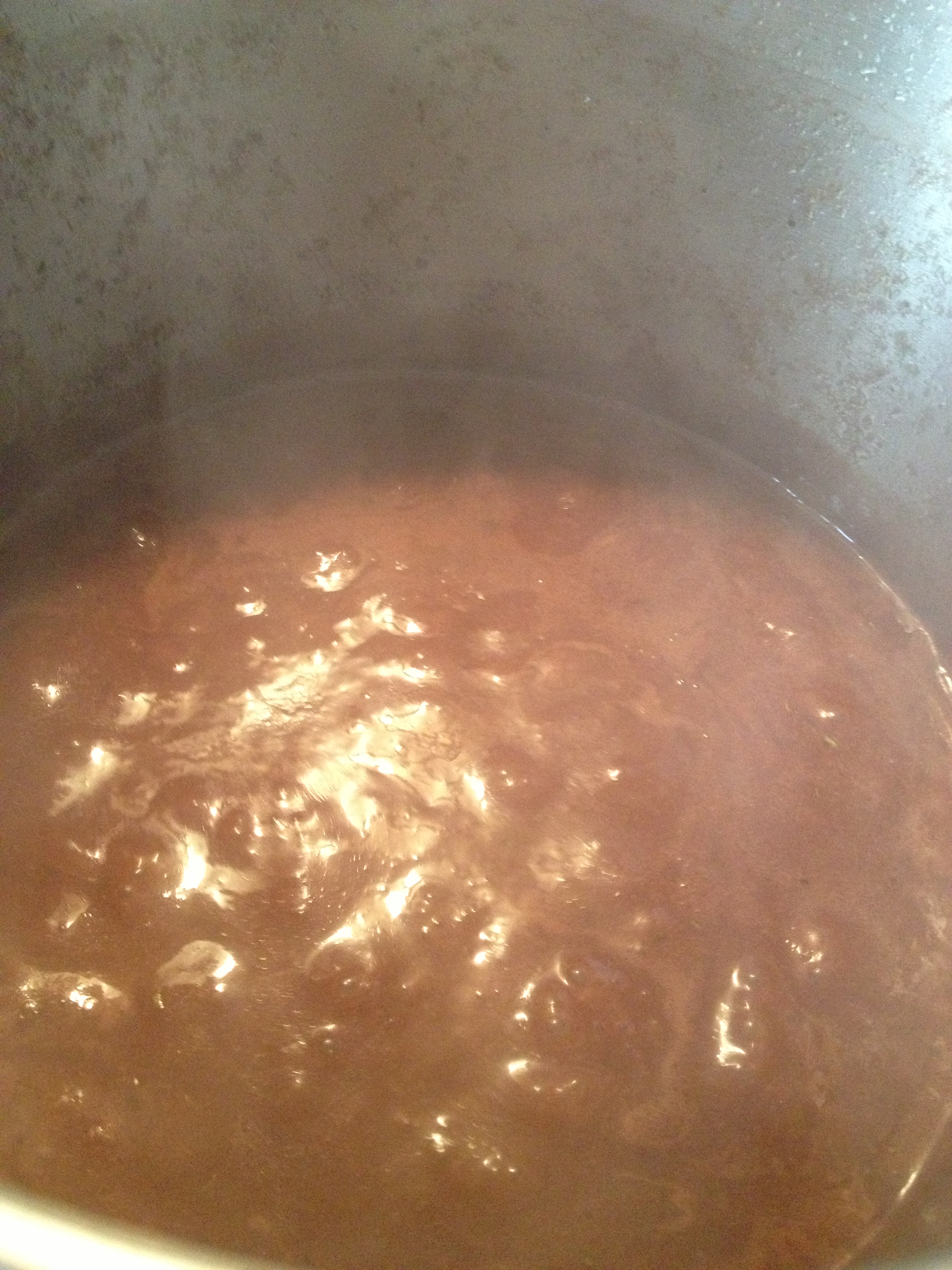 En la misma olla donde has marcado el ciervo (yo lo hice a parte por problemas de tiempo) echamos el resto de ingredientes de la maceración salpimentados y salteamos durante 15 minutos aprox. Pasado ese tiempo, añadimos la carne y los ajos, damos un par de vueltas y echamos un buen chorrete de brandy para rescatar el fondo. Removemos un minuto y añadimos los líquidos del macerado, que dejaremos durante unos 15 min. para que reduzcan a la mitad. Entonces cubrimos de agua hasta pasar un par de dedos los ingredientes e incorporamos el chocolate, dejándolo a fuego medio-bajo durante 1’5h aprox, que es lo que tardará Bambi en estar tierno.