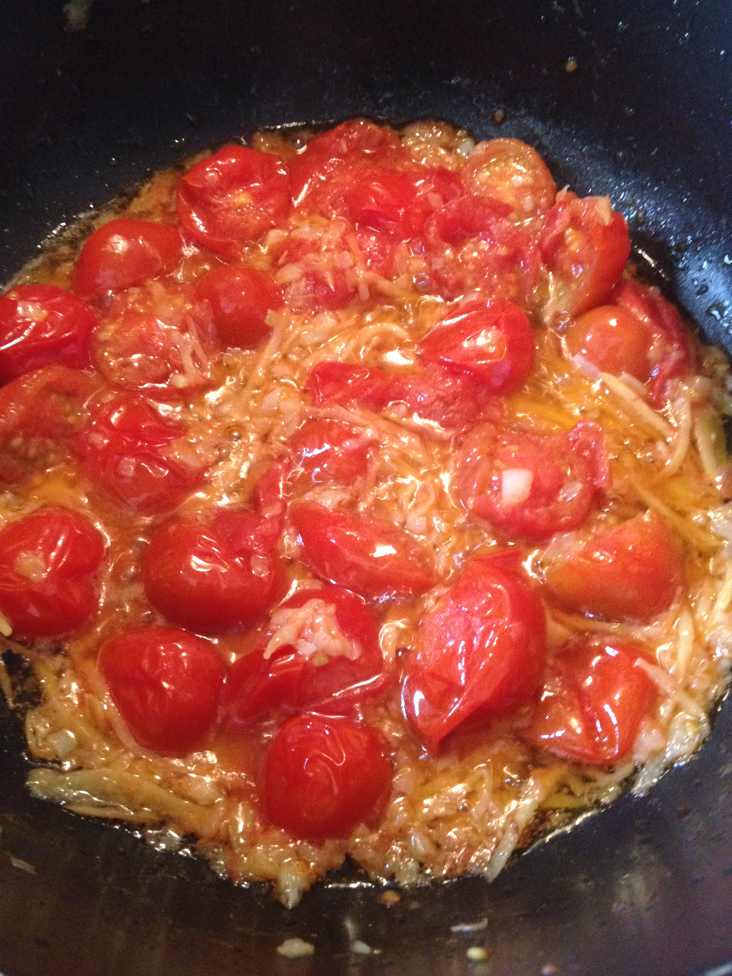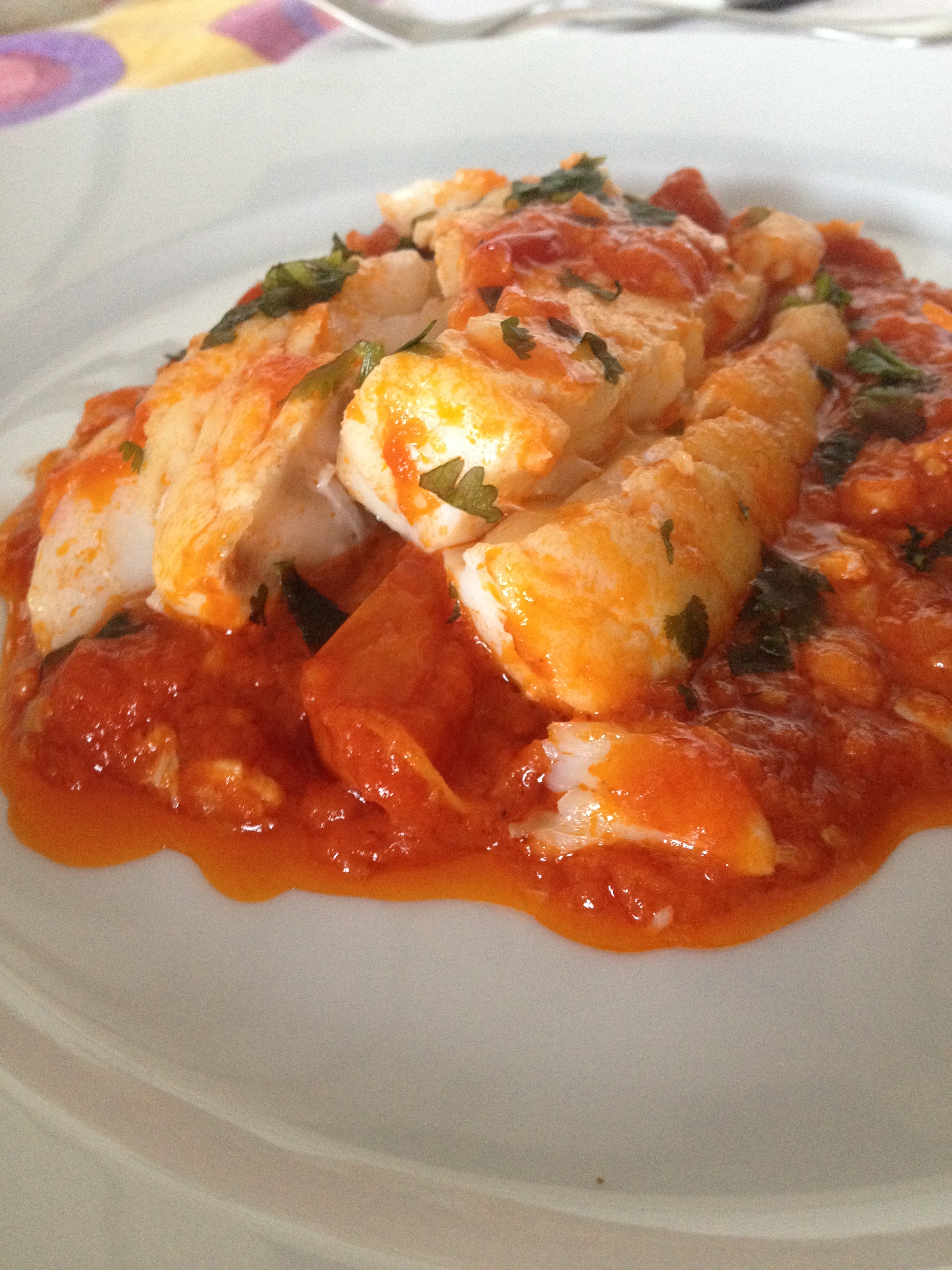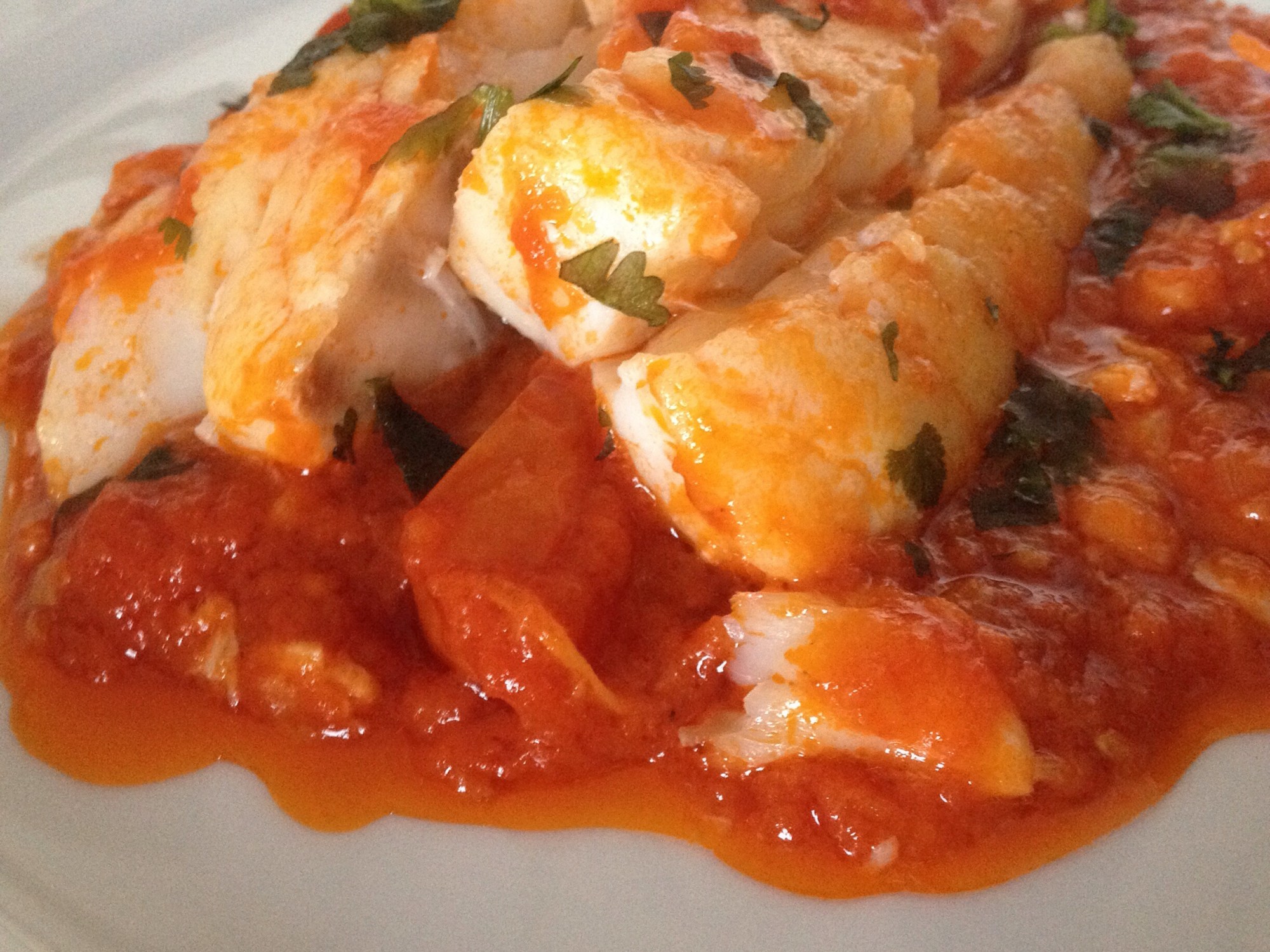 Ahora sólo falta poner el bote de tomate frito de calidad (en mercadona venden uno que se llama Tomate Frito estilo casero que está de escándalo), le damos un par de vueltas para unir los sabores y ponemos el bacalao en la cazuela ya fuera del fuego dos minutos y medio por cada lado, dándole una vuelta con cuidado para no hacer como yo y destruir el pescado
