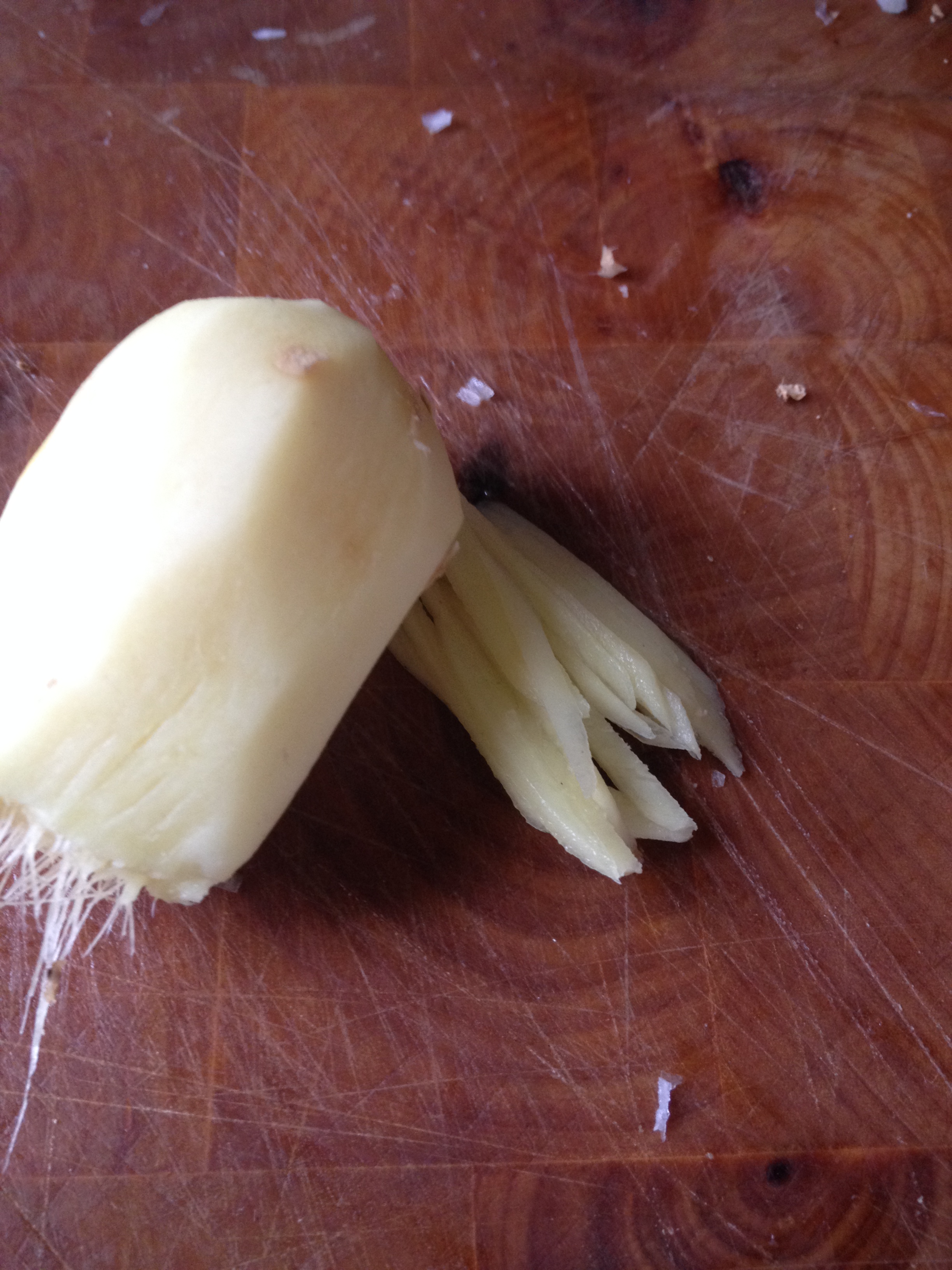 Pelamos el jengibre y lo cortamos en láminas y estas en tiras finitas (lo que vendría siendo juliana).