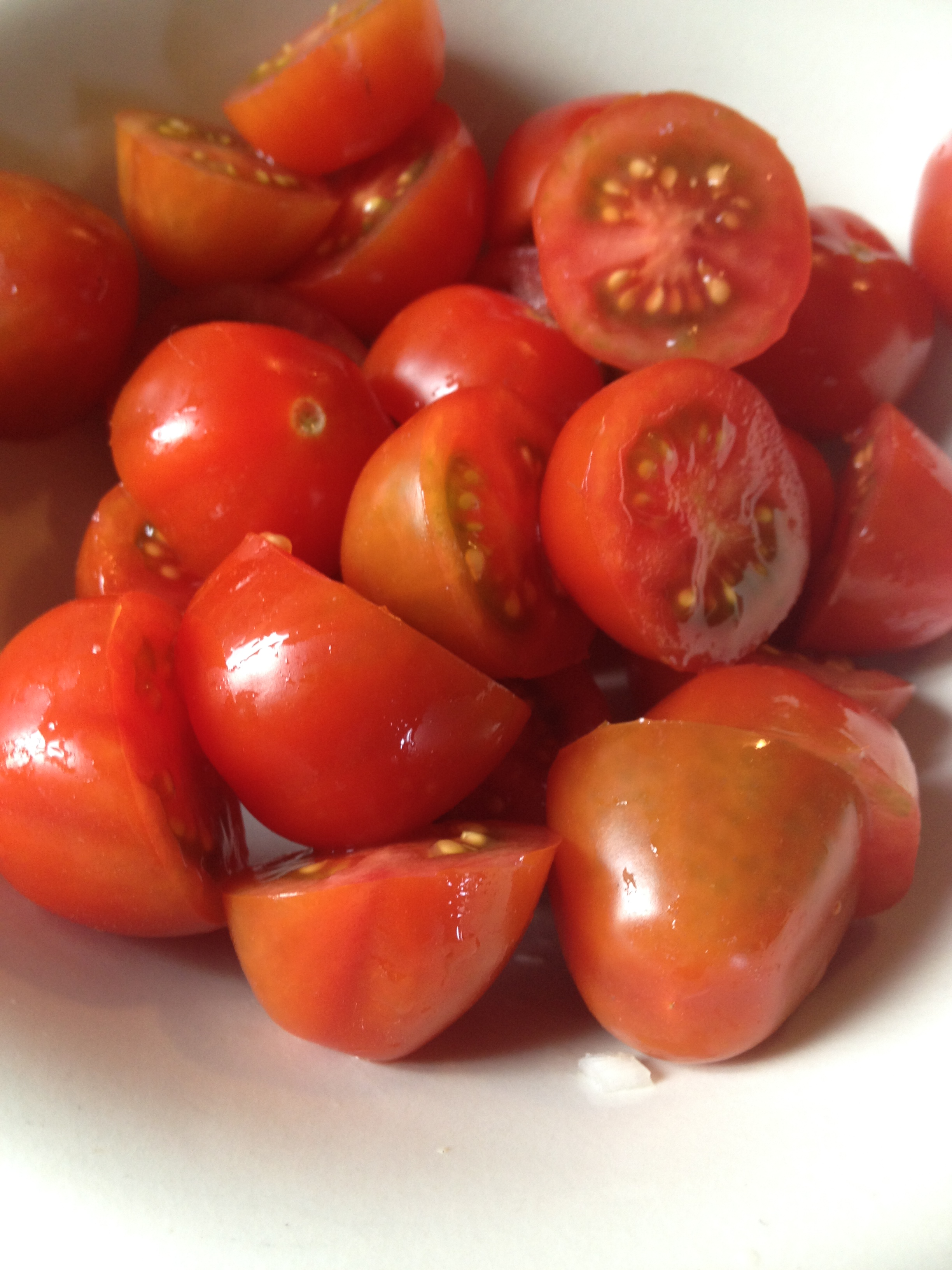 En estos 10 minutos vamos a pasarles un agua a los tomates cherry y los cortamos por la mitad.