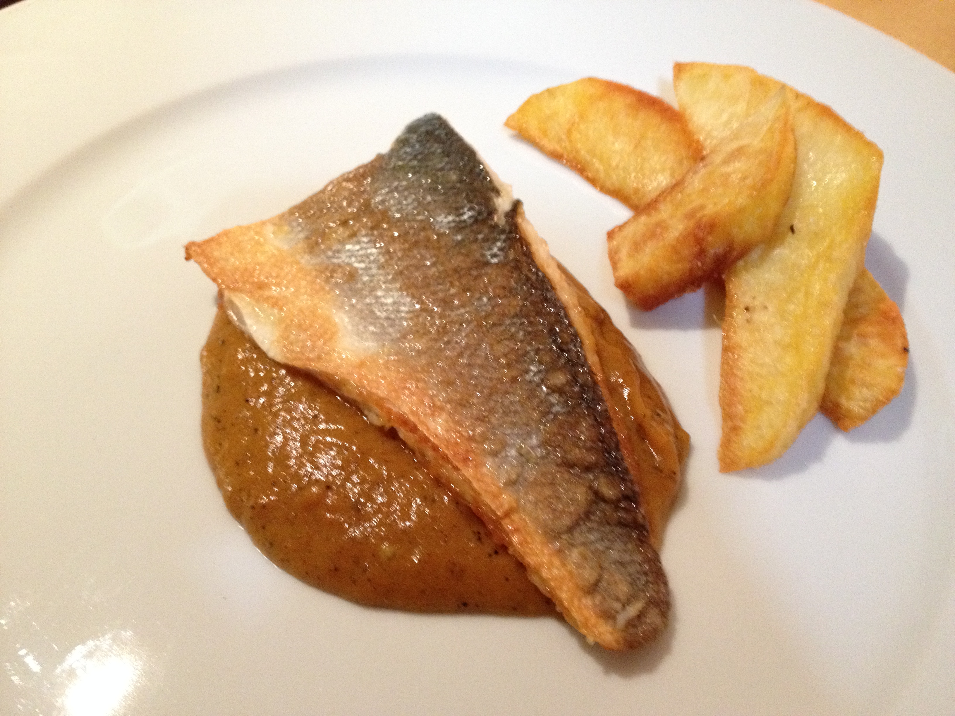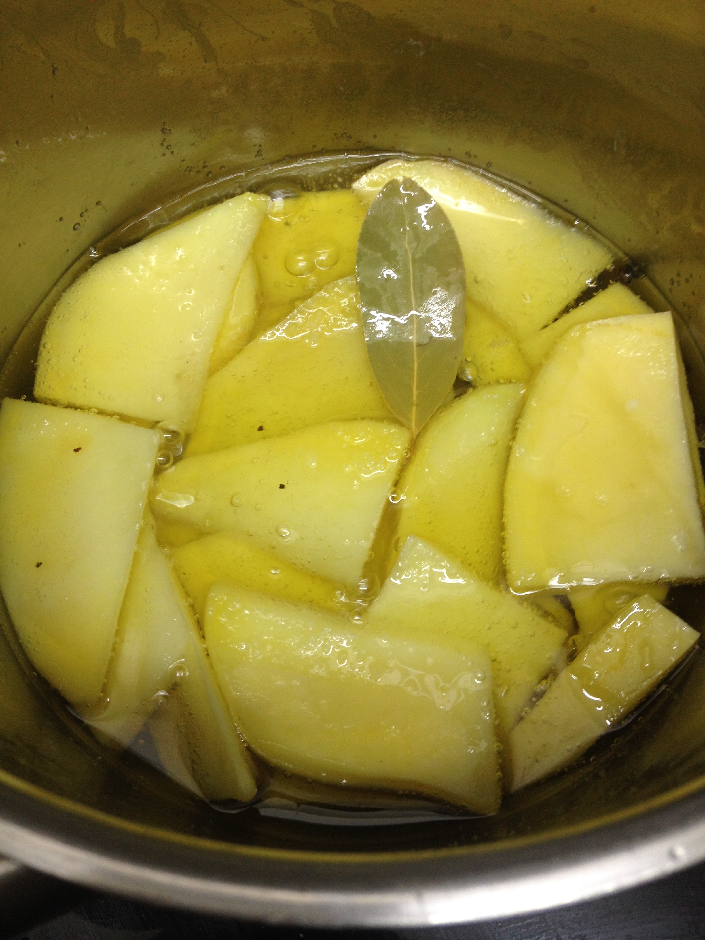Las patatas de acompañamiento son confitadas, es decir, a fuego muy bajo, que casi no salgan burbujas, durante unos 45 minutos aprox. Las cortamos en gajos y las ponemos en aceite templado con unos granos de pimienta, sal y una hoja de laurel. Hacedlas antes de empezar a hacer el pescado, que se van haciendo solas, como las artistas que se hacen a sí mismas. Cuando pasen los 45, subimos a fuego fuerte para que se sellen y se doren un poquito.
