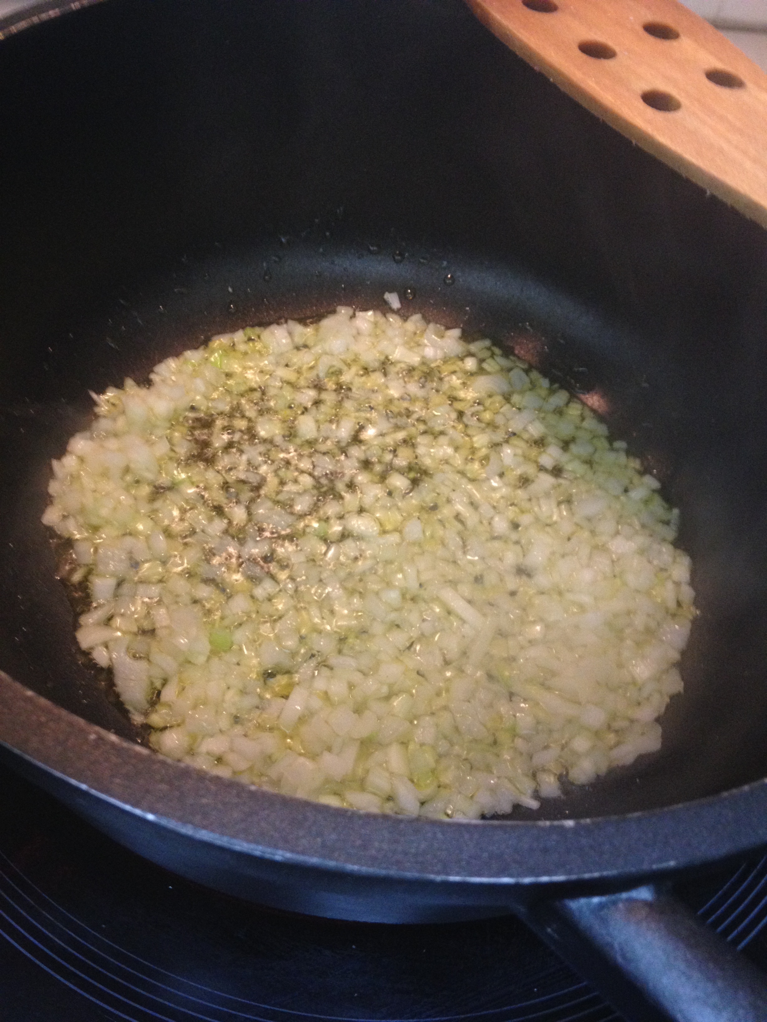 Cortamos la cebolla en brunoise (cuadratitos pequeños) y la ponemos a fuego medio-alto con un pelín de aceite caliente y sal en una cazuela.