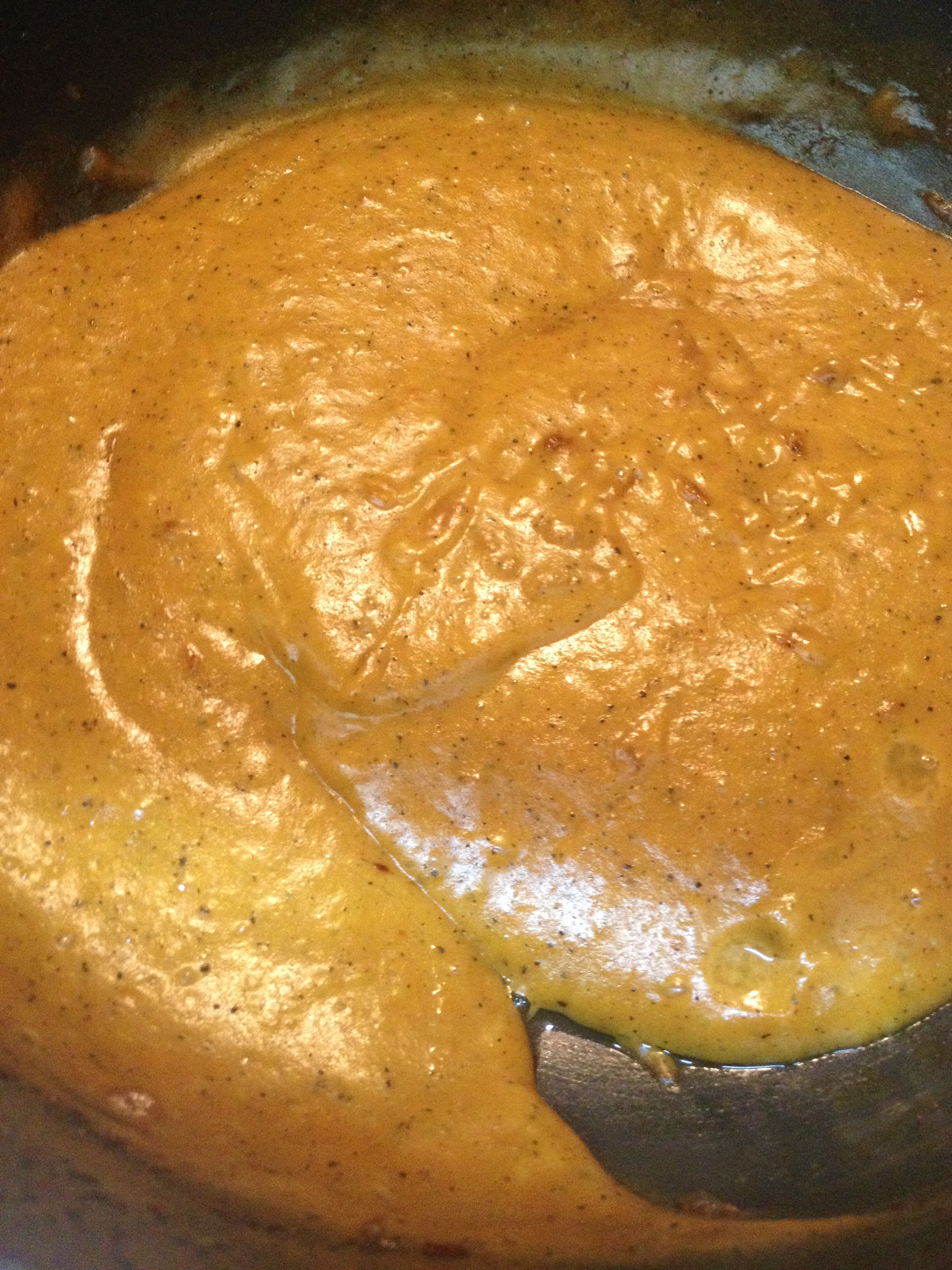 Cuando el mango se pueda chafar un poquito, añadimos las dos cucharadas de pasta de curry a la preparación y damos vueltas durante un par de minutos. Pasamos a un vaso batidor y lo trituramos con rabia durante un minuto o dos, como si tuviéramos a (Rellena este hueco con tu enemigo) delante. Veréis que queda una pasta muy densa. Incorporamos agua en un hilo muy fino hasta que quede una textura de crema gruesa. Volvemos a la cazuela, y damos un par de vueltas más.