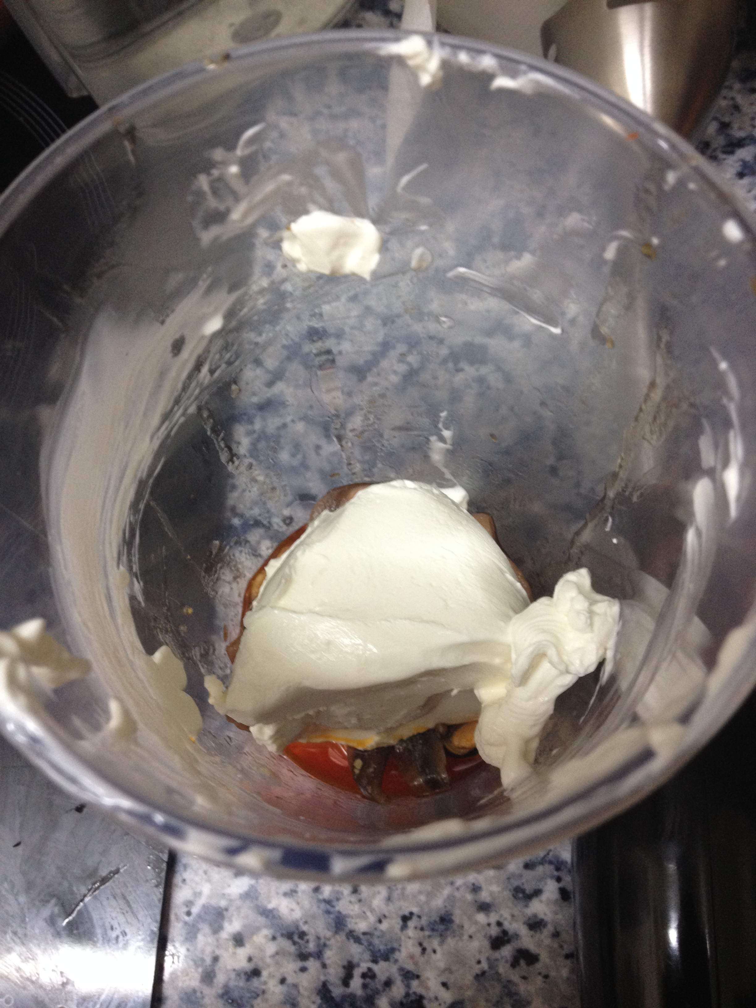 Lo primero que hacemos es preparar la mousse. Introducimos en el vaso de la batidora los mejillones con su escabeche, las anchoas, el queso para untar y trituramos.