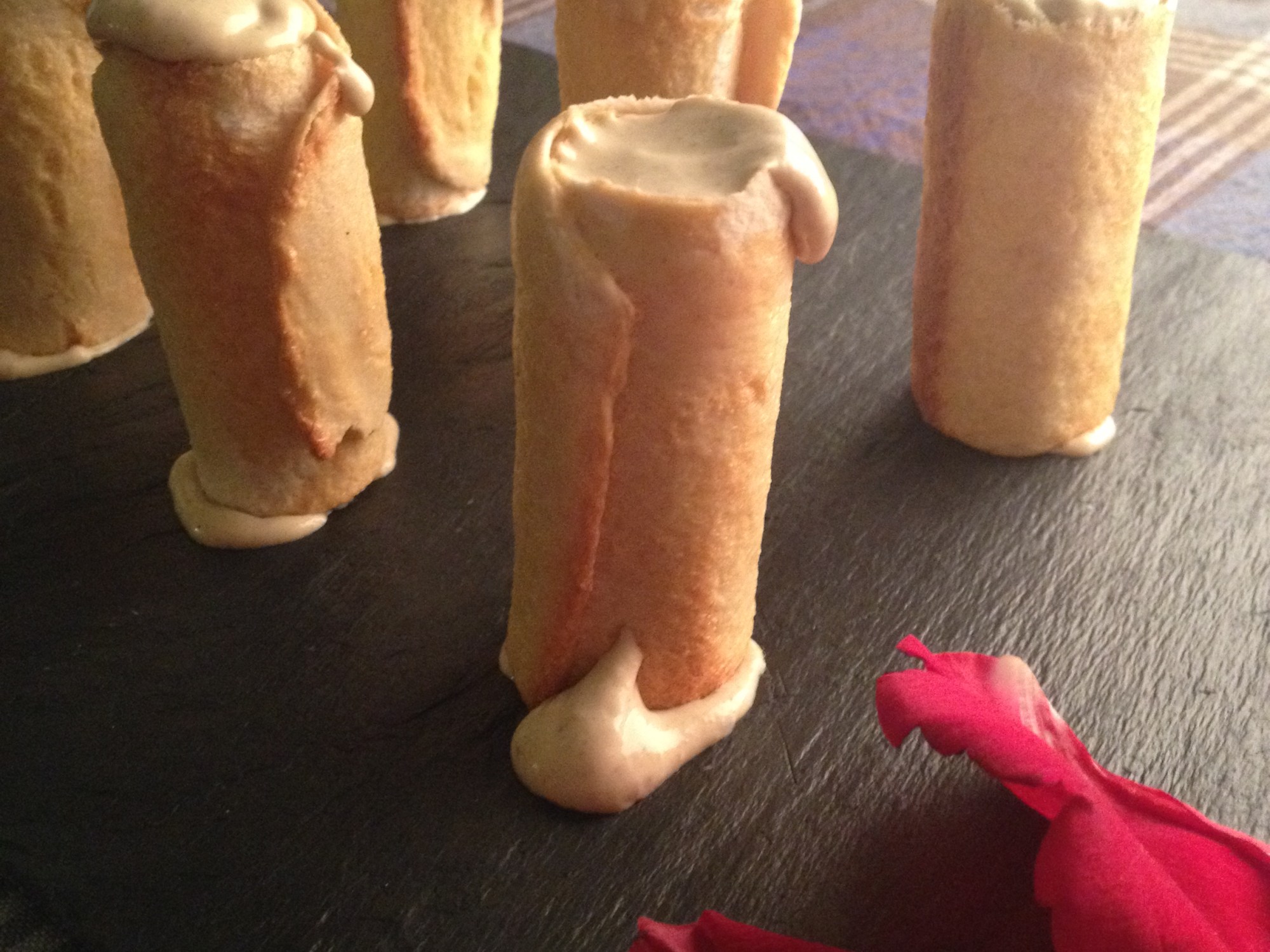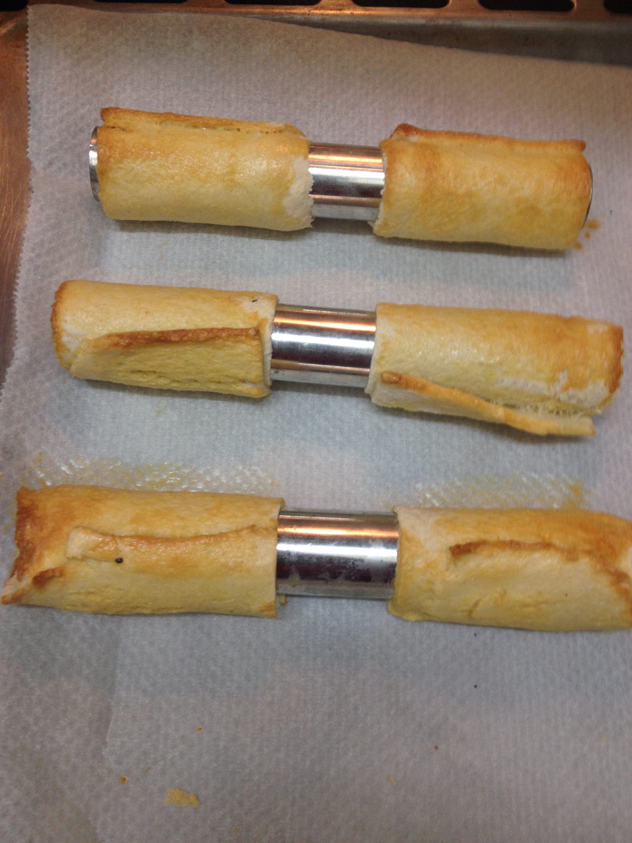 Cuando estén enrollados, pintamos con huevo por fuera y metemos al horno ya precalentado a 180º. Mantenemos hasta que queden dorados (en mi caso no sé si tardaron como 12-15 minutos). Retiramos del horno cuando estén y deberían tener este aspecto aprox.