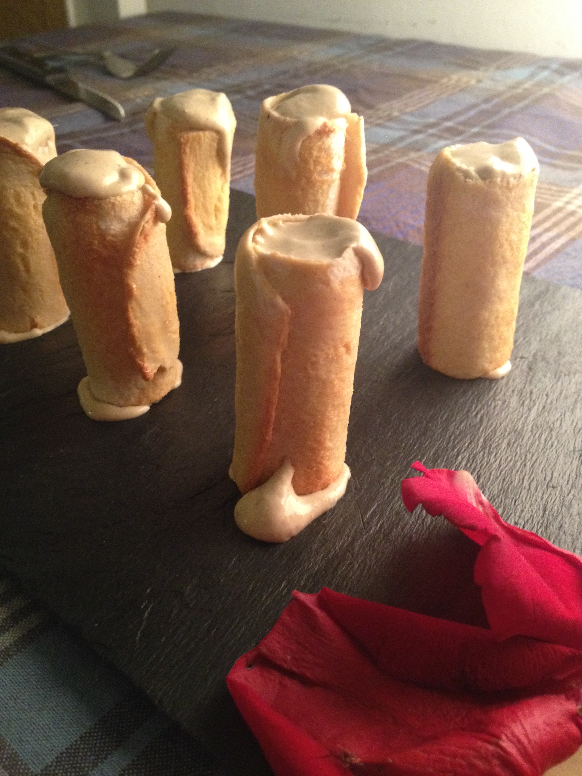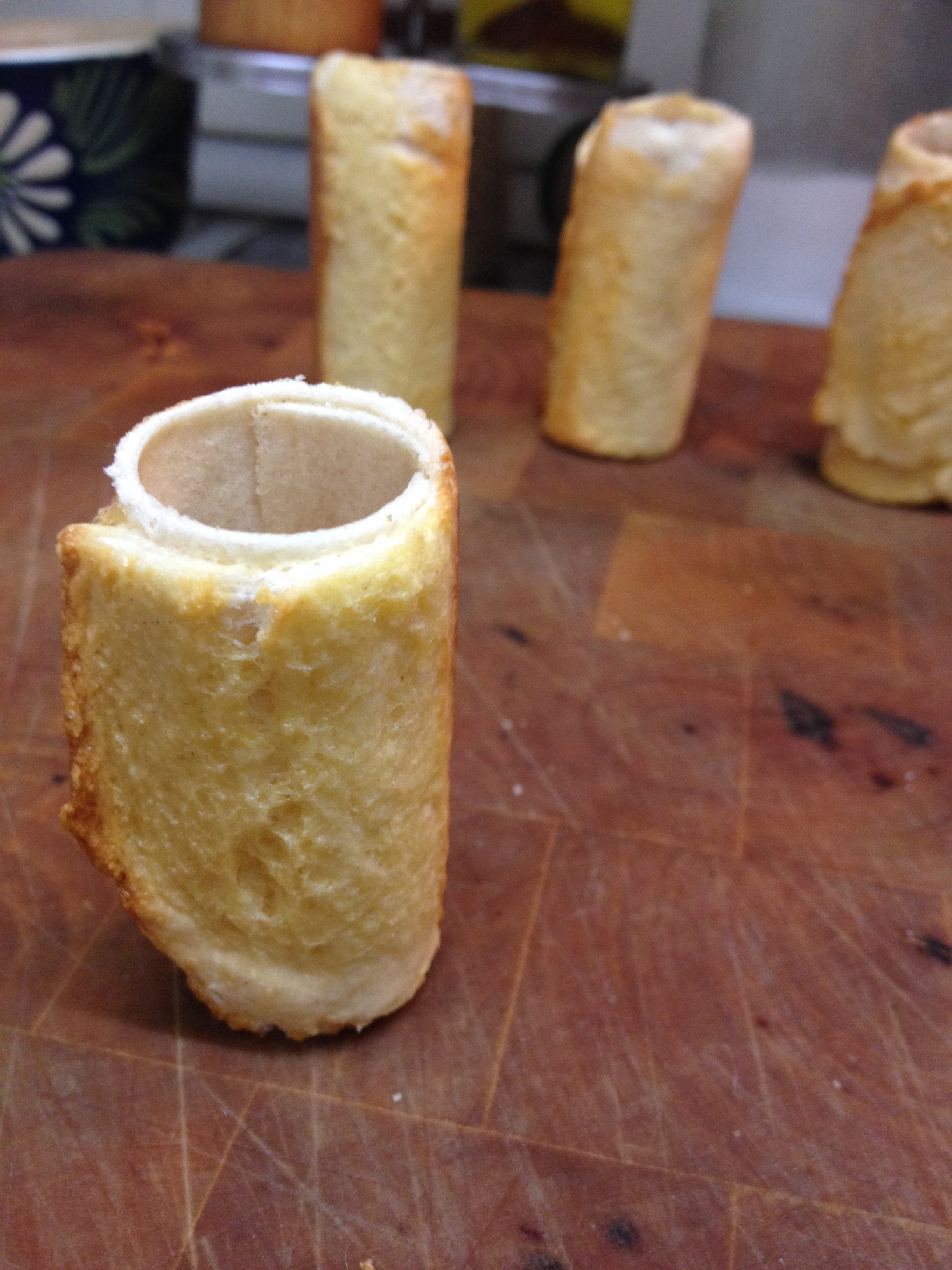 Lo primero que hacemos es estirar las rebanadas de pan de molde con un rodillo, dejándolas bien finas (ojo que el pan se rompe más fácil que el copón). Una vez estiradas (no tanto como Cher), partimos cada rodaja en dos y las pondremos en el canutillo metálico enrolladas. Batimos huevo previamente para untar los canutillos y además usarlo de pegamento.