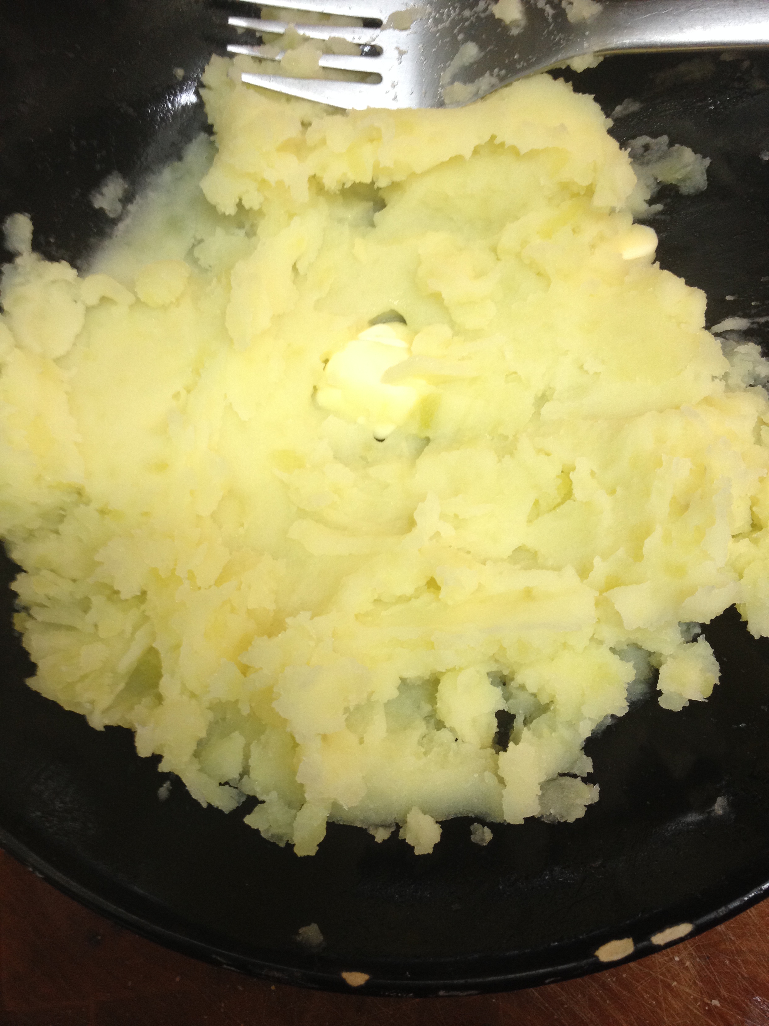 Empezamos cortando la patata a daditos de 1×1 cm, para que le cueste menos hervir. Ponemos una olla con agua y cuando arranque a hervir, ponemos una cucharadita de sal en el agua y echamos la patata. Hervimos durante 15 min aprox, o hasta que la patata se chafe bien. Escurrimos, ponemos en un plato y con un tenedor la machacamos como si estuviéramos castigando a nuestro vecino gritón y coñazo. Cuando esté chafadita, ponemos una cucharada de mantequilla y unimos todo bien.