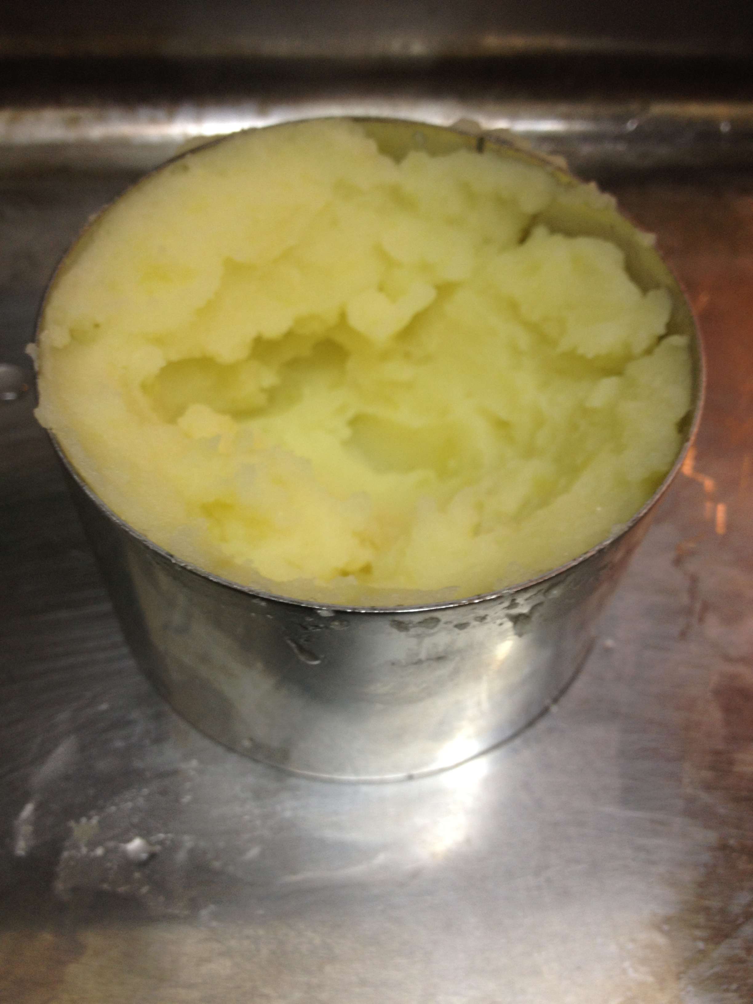 Ahora cogemos el aro de emplatar y untamos su interior con un poco de aceite (para que luego se pueda sacar bien). Lo colocamos en una bandeja de horno y rellenamos con la patata, dejando un hueco en el centro, como si fuera un volcán.