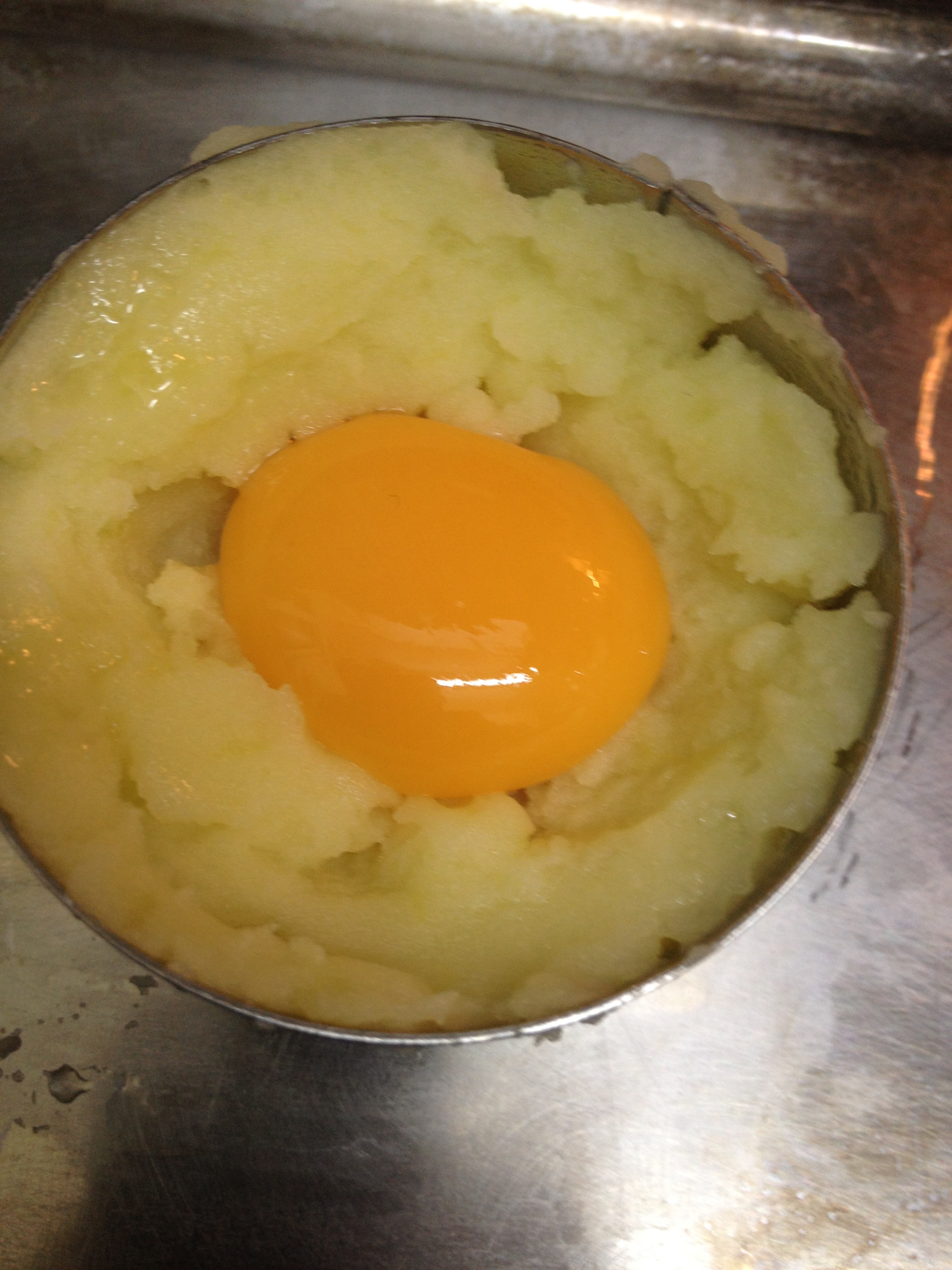 Ahora cascamos el huevo, desechamos la clara y con cuidadérrimo dejamos la yema en el centro del volcán (parece un relato de Corín Tellado).