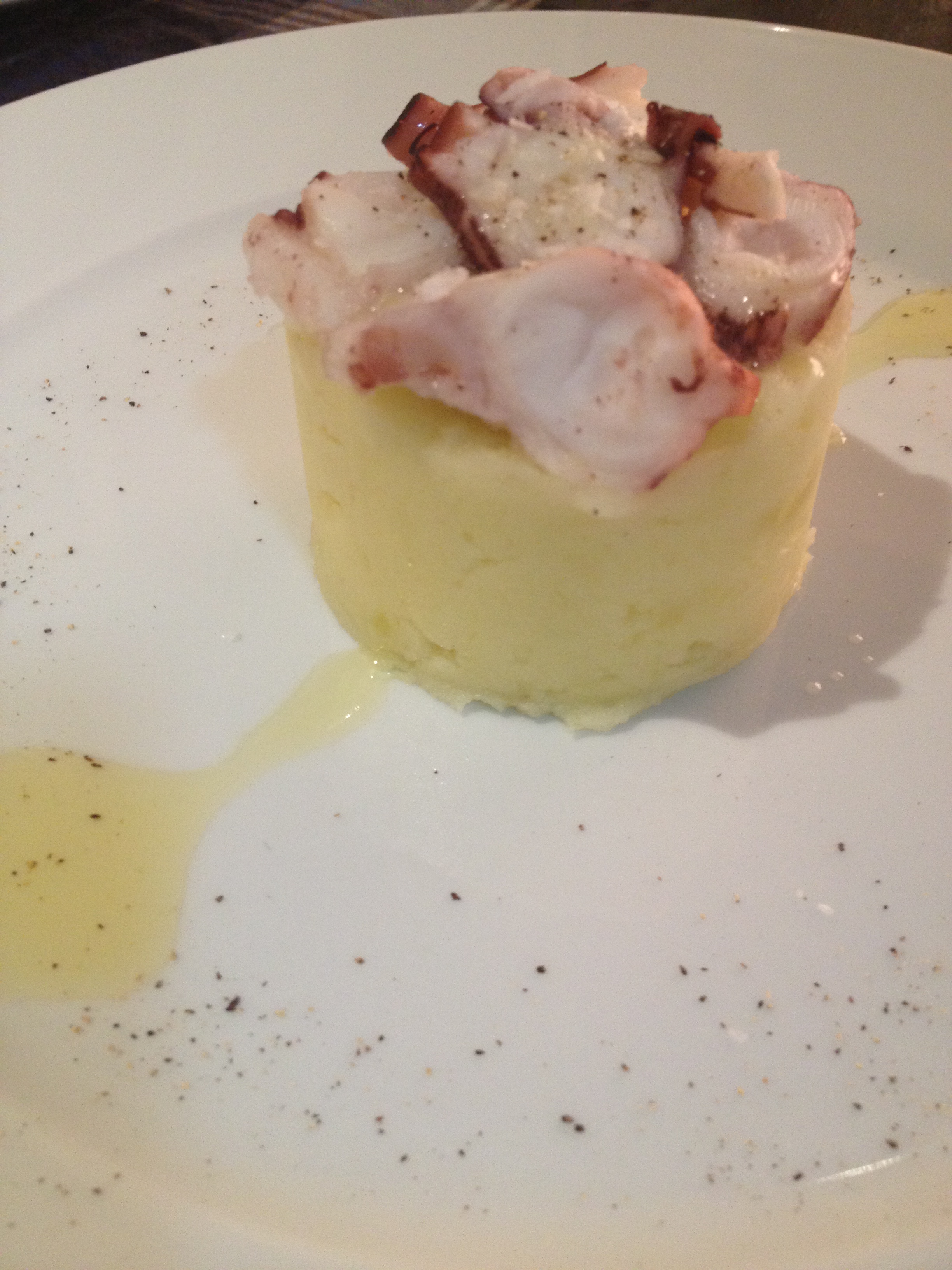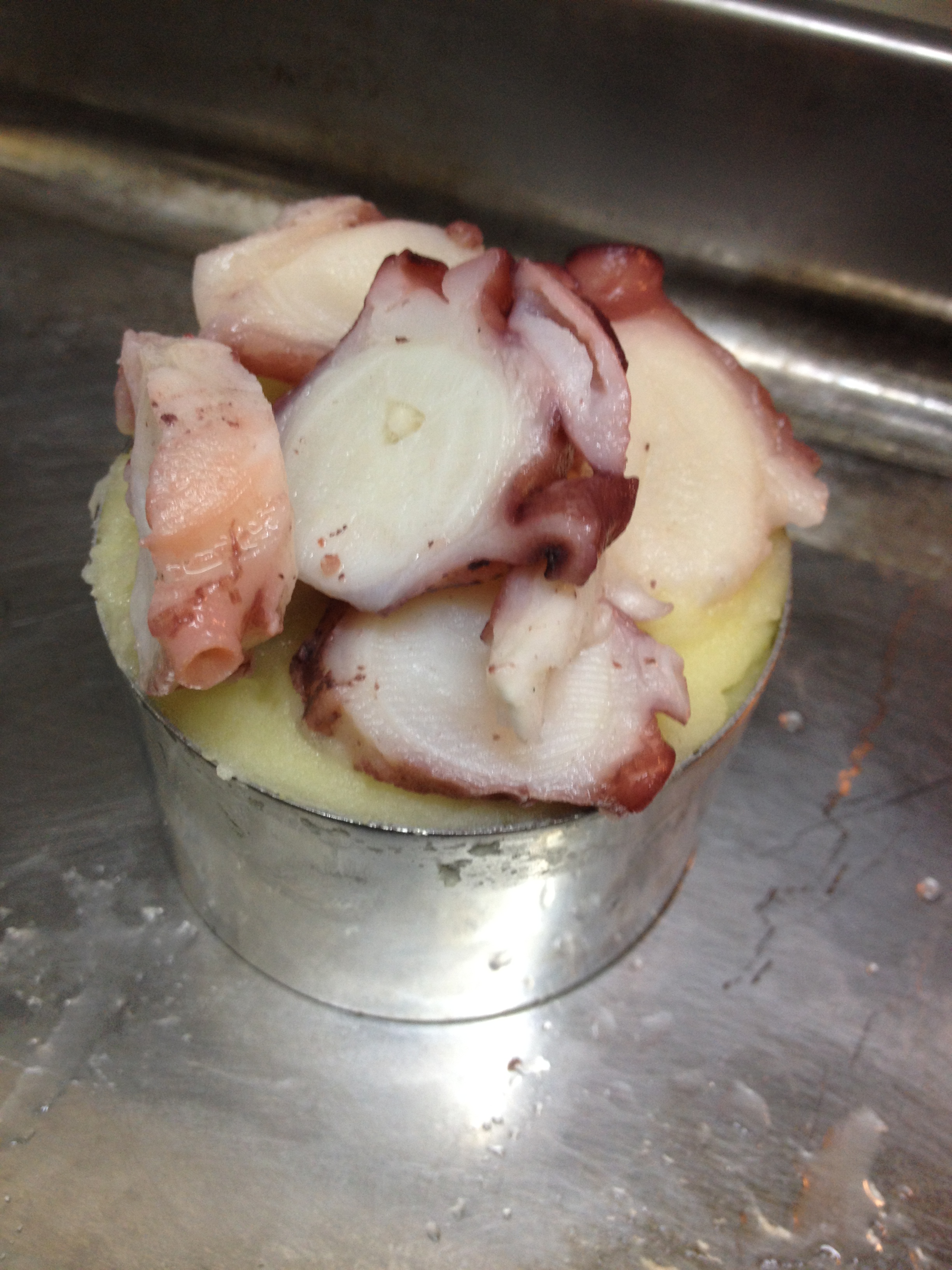 Decoramos con pimienta, sal maldon encima del pulpo, un chorrito de aceite de oliva virgen, y pimentón, que a mí se me olvidó. Y listos para el espectáculo, porque la cosa es de traca!