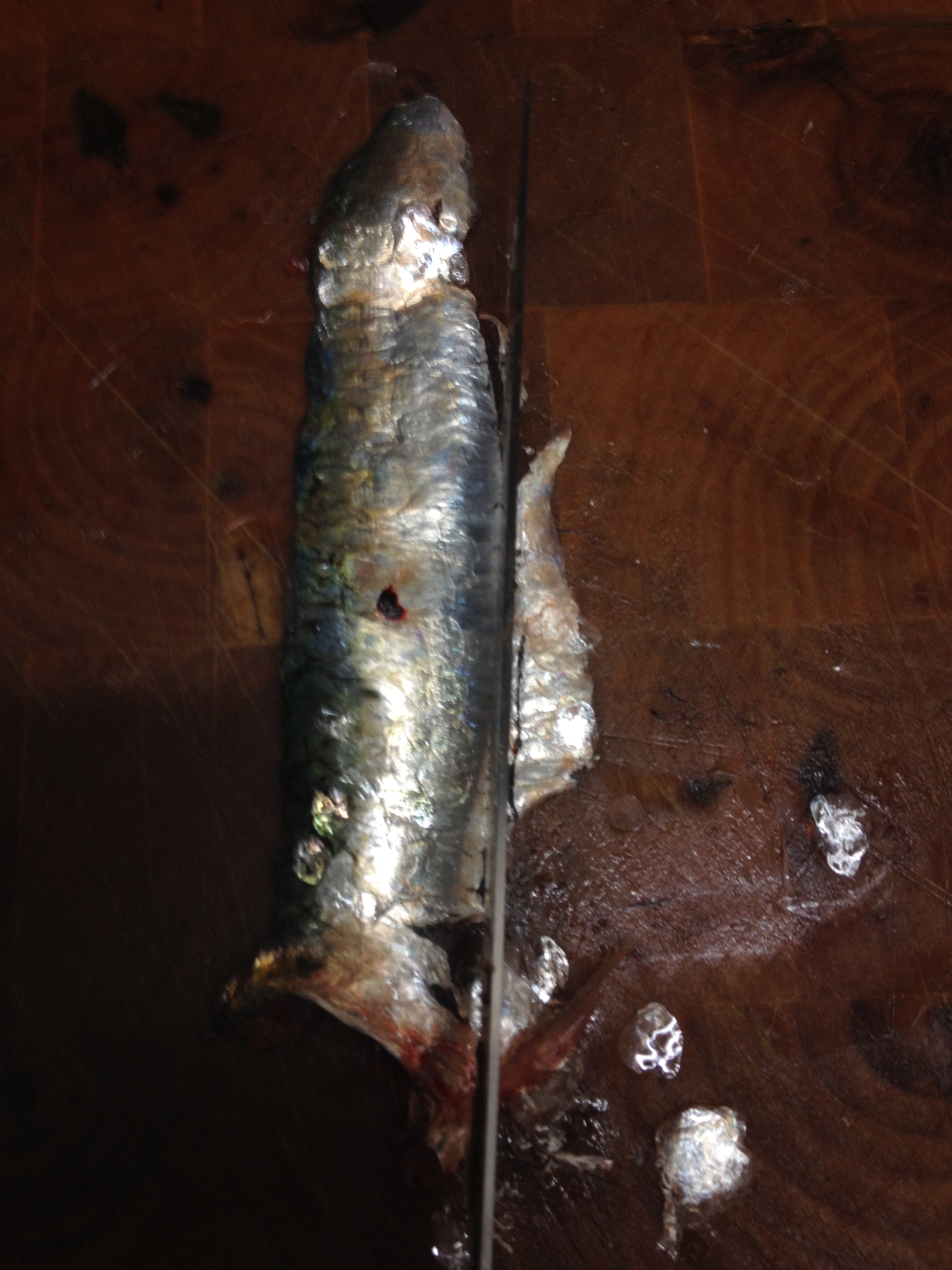 Empezamos sacando los filetes de la sardina. Para ello tenemos que hacer un corte desde la línea del cuello en diagonal hacia el morro y luego girar el cuchillo siguiendo en linea recta hasta el final de la cola, con cuidado de no coger espinas. En las siguientes fotos lo veréis mejor: