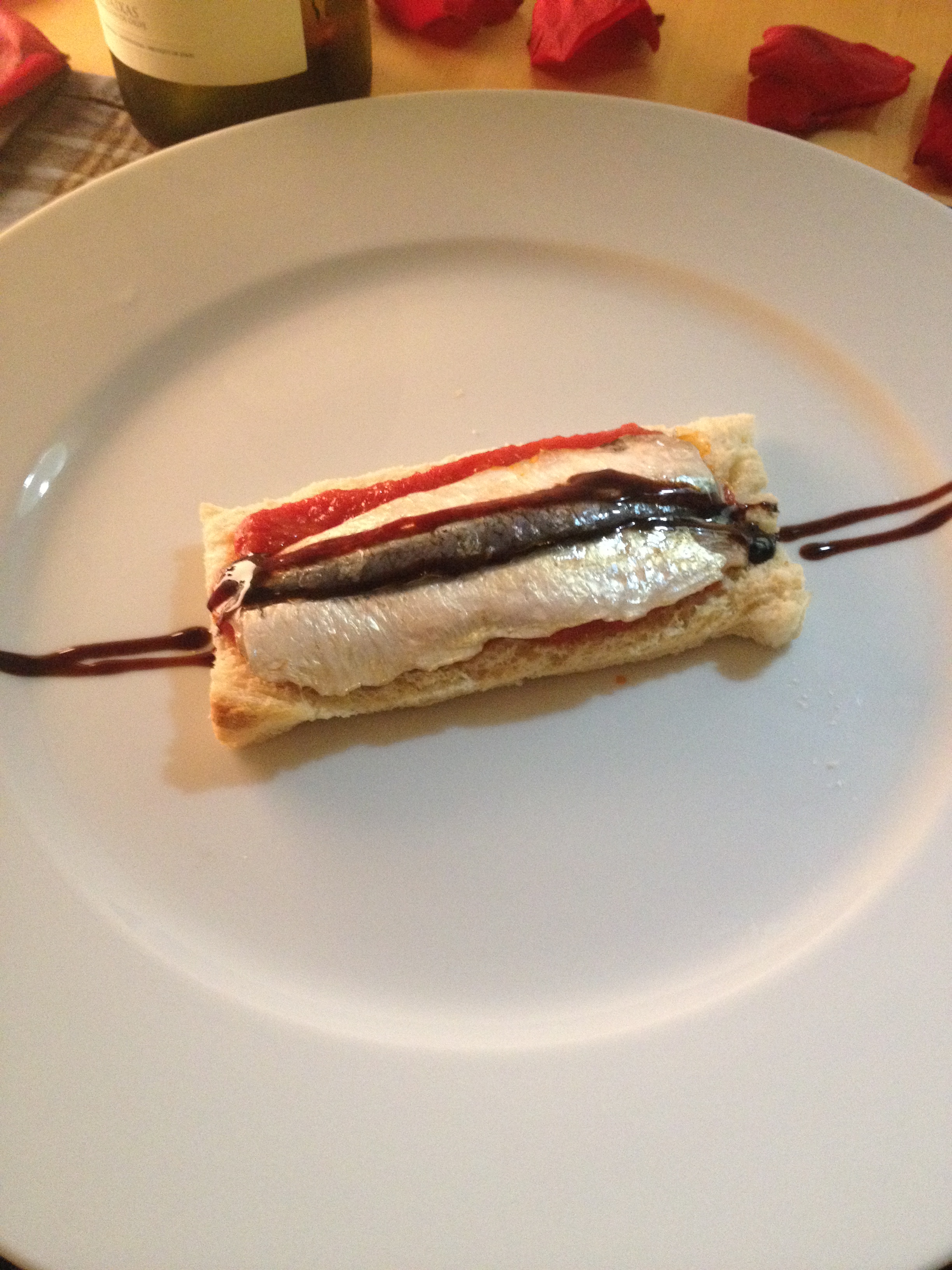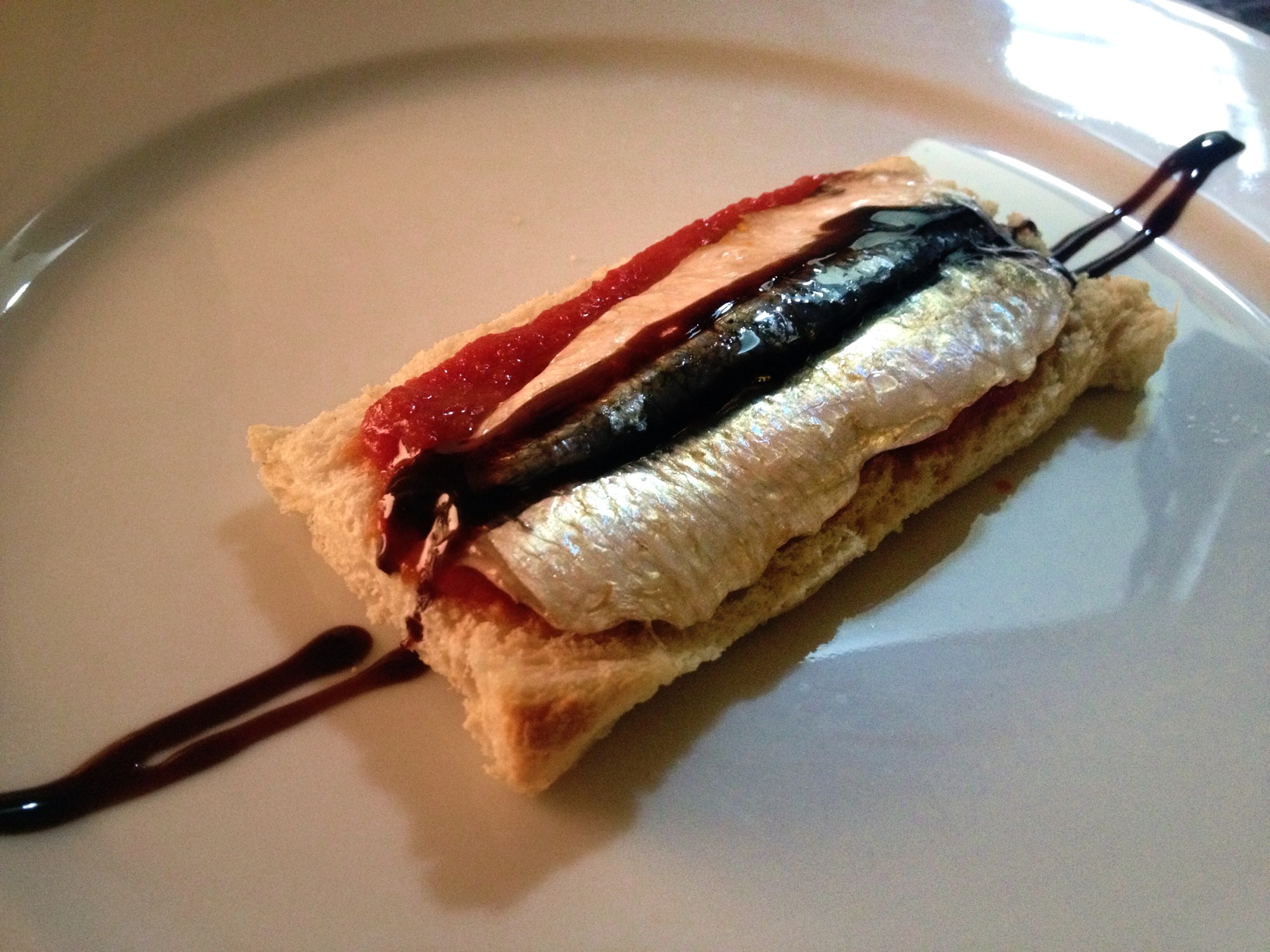 Para acabar, ponemos una base de tomate en el pan, dos lomos de sardina, decoramos con la reducción de vinagre de jerez y ¡a gosar!