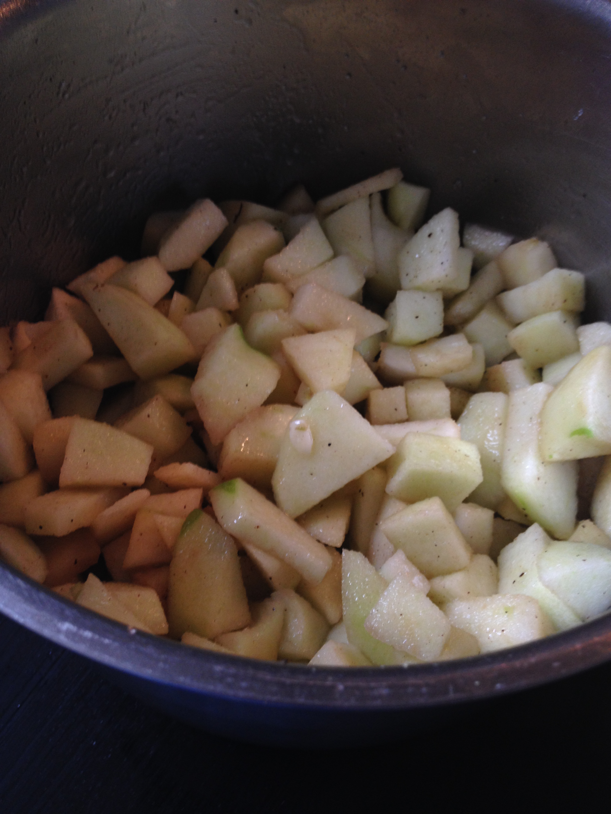En una cazuela ponemos a calentar la mantequilla y cuando empiece a derretirse ponemos la manzana cortada en dados de 2×2 cm. aprox (si la partes más pequeña, antes se hará) y salpimentamos. Mantenemos a fuego medio-alto durante 20 min aprox y vamos dando vueltas hasta que la manzana se deshaga.