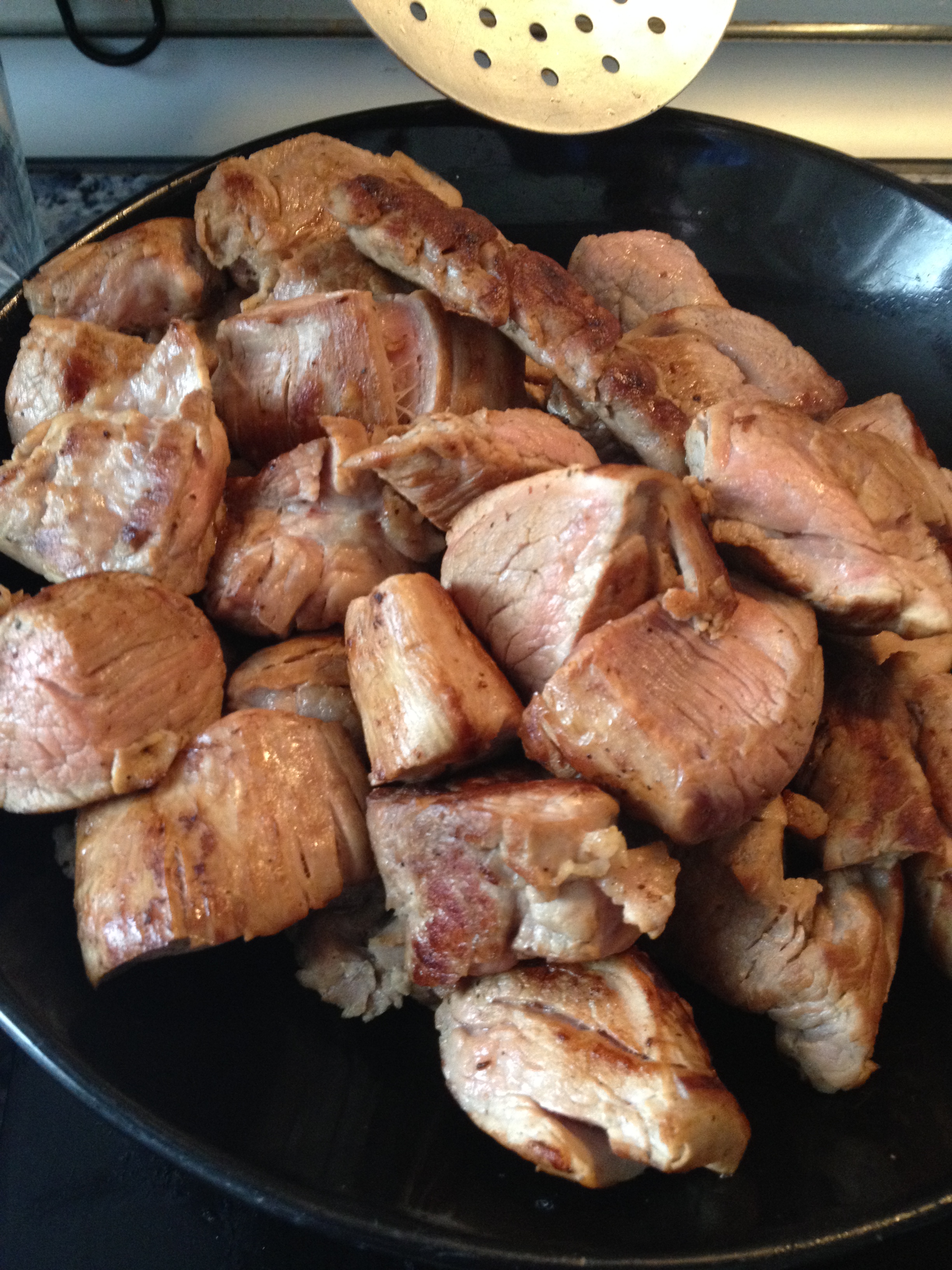 Mientras tanto, ponemos a precalentar el hon-no a 180º. Ahora partimos el solomillo en dados asequibles al bocado, es decir, que no haya que desencajarse la boca como las cobras esas que se comen caballos enteros, con rancho y todo. Ponemos una sartén al fuego máximo y cuando esté bien caliente, ponemos dos átomos de aceite de oliva y marcamos el solomillo. Lo que pretendemos es sellar la carne y que no pierda líquidos, por lo que salpimentaremos al sacar. La carne necesitará 2 minutos por cada lado como mucho, no os paséis, que si no os quedará muy zapatera.