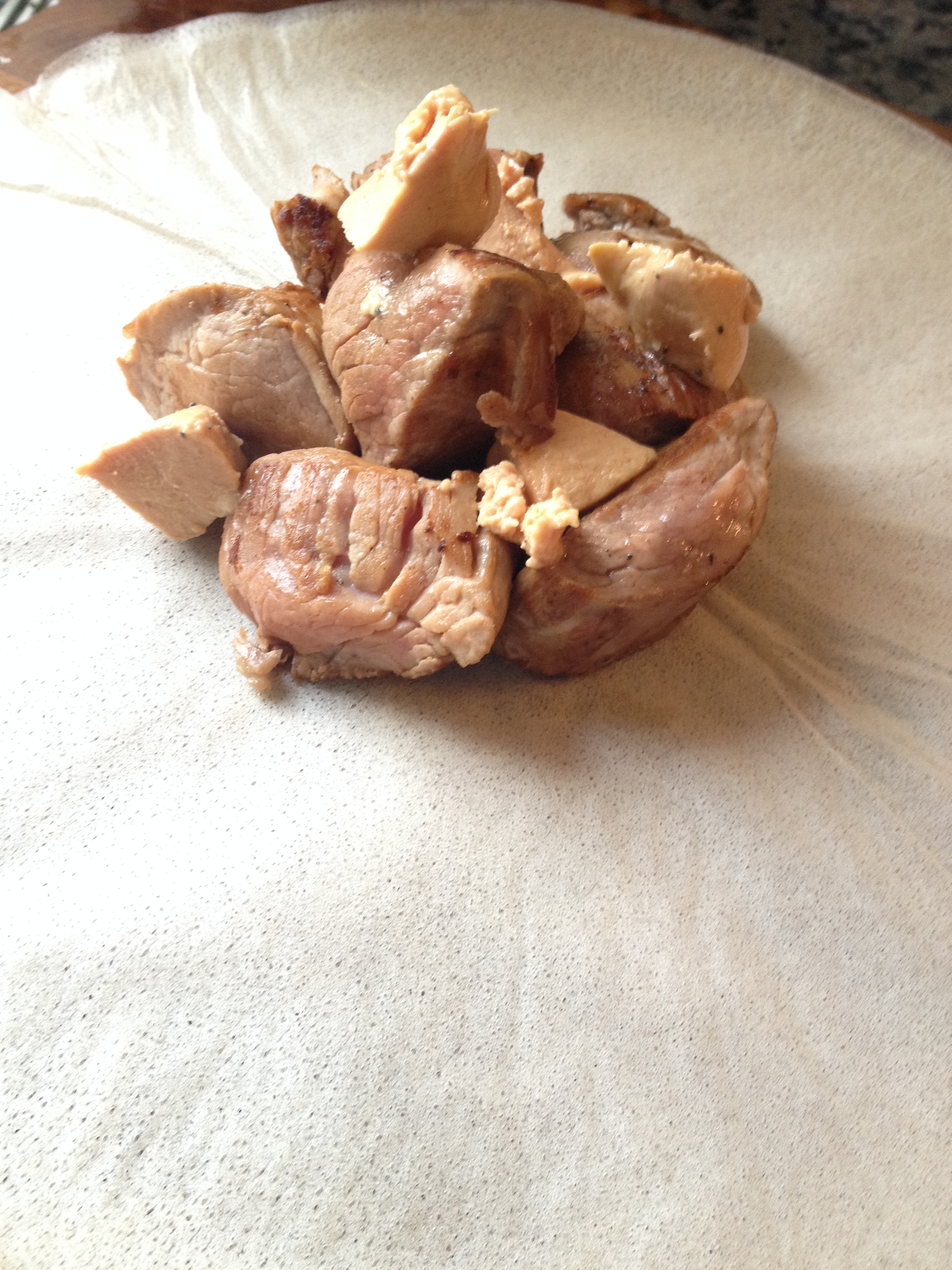 Una vez todo listo, ponemos dos obleas por saquito (una no lo soportaría por sí sola), extendemos y ponemos unos dados de carne junto con unos trozos de foie.