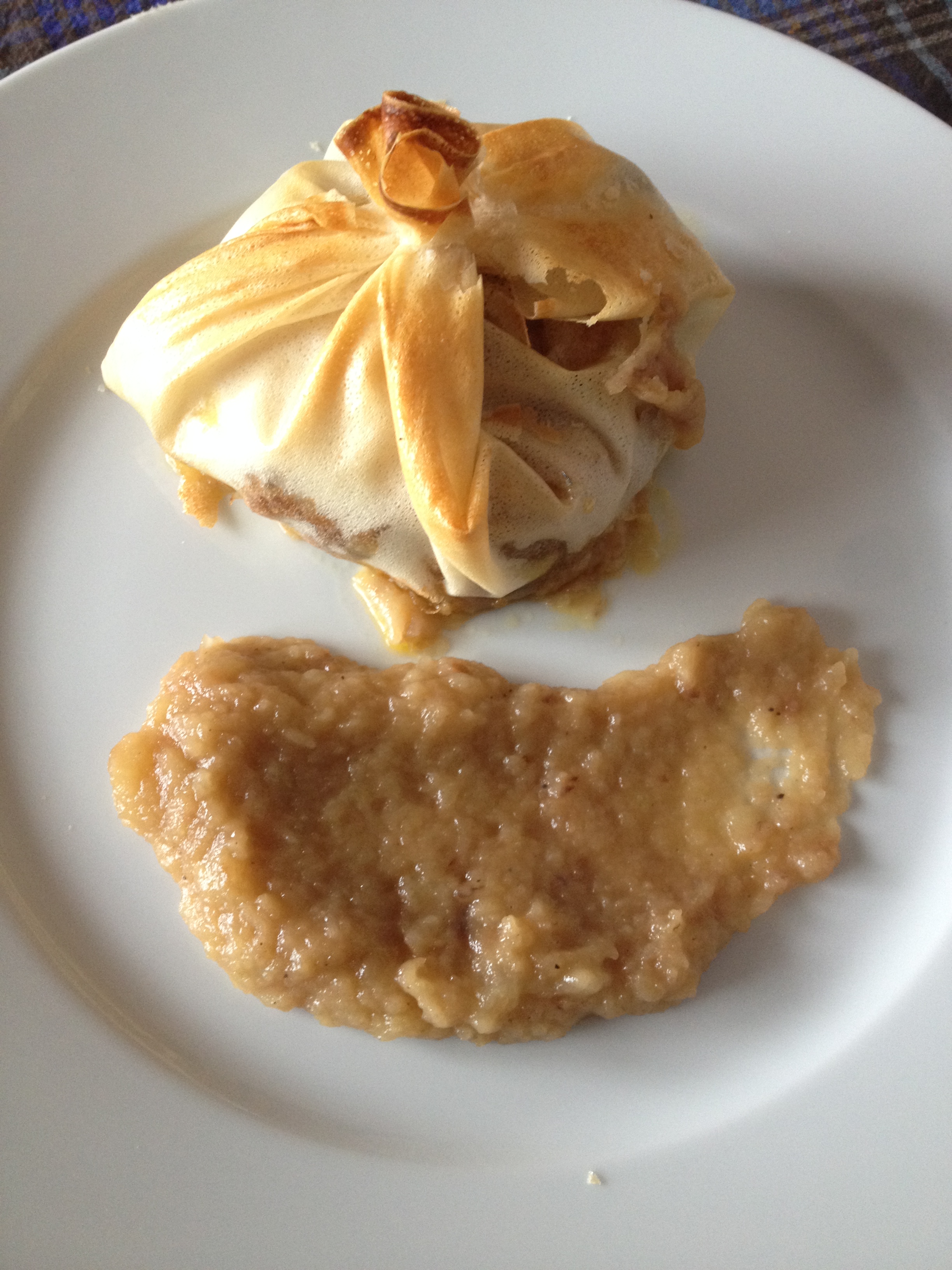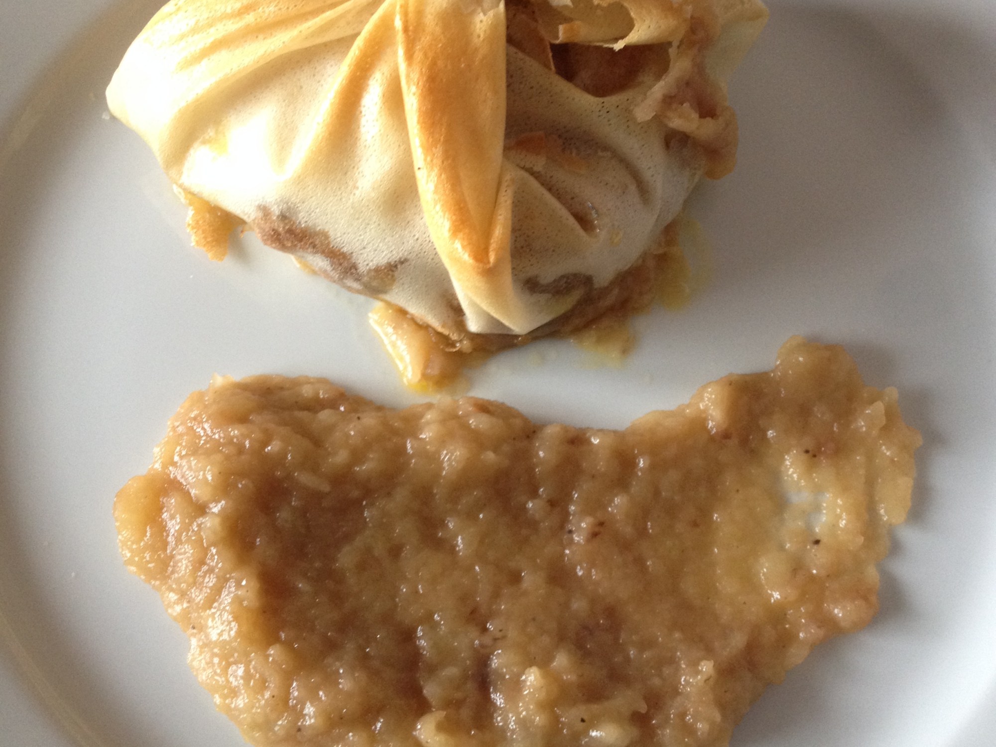 Cuando los tengamos todos, ponemos en una bandeja de horno y metemos (encendido arriba y abajo) a 180º durante 20 minutos. Sacamos, emplatamos un saco con un poco de compota (que habremos rectificado para que esté correcta de sal y pimienta) y a disfrutar.