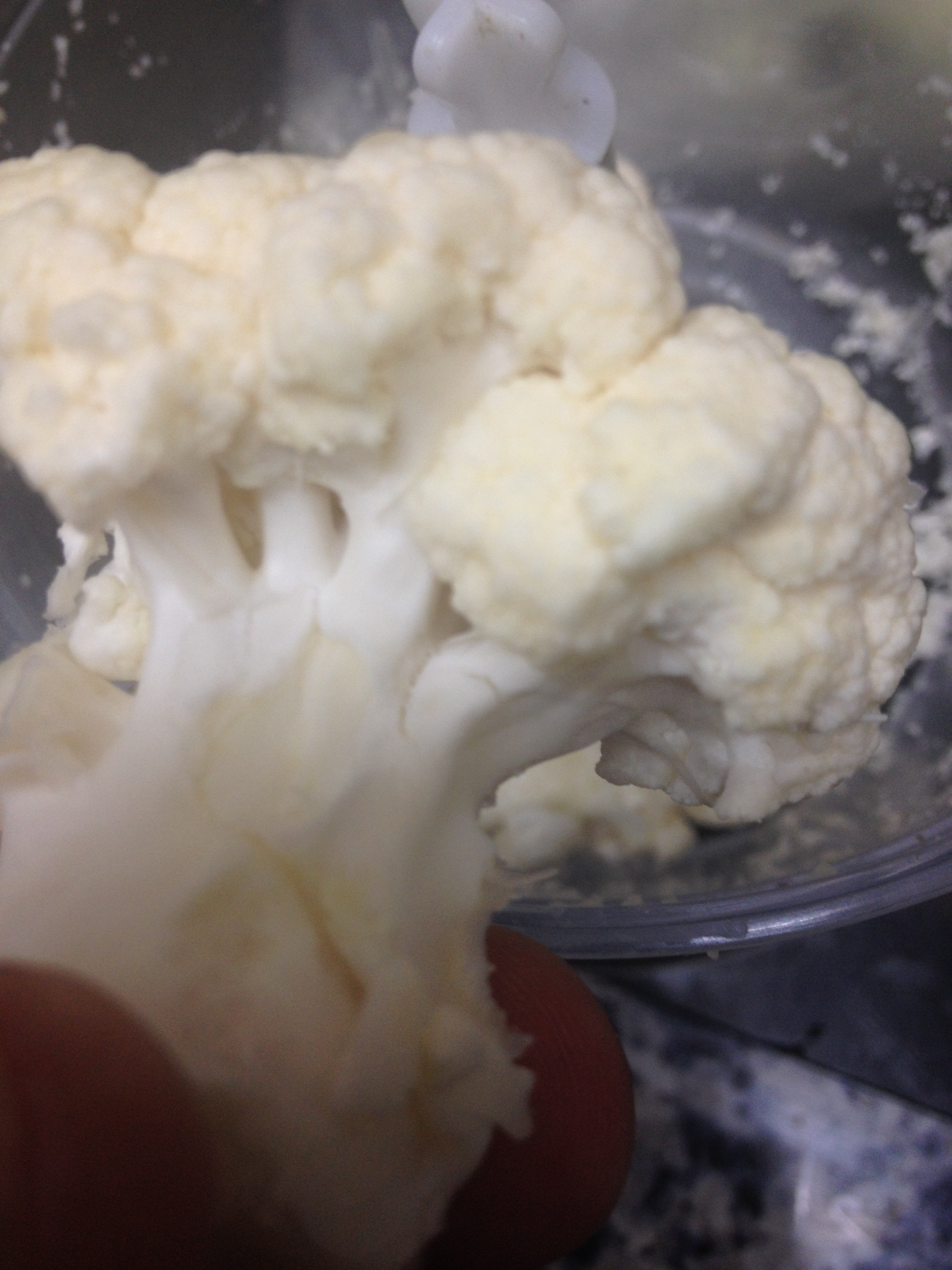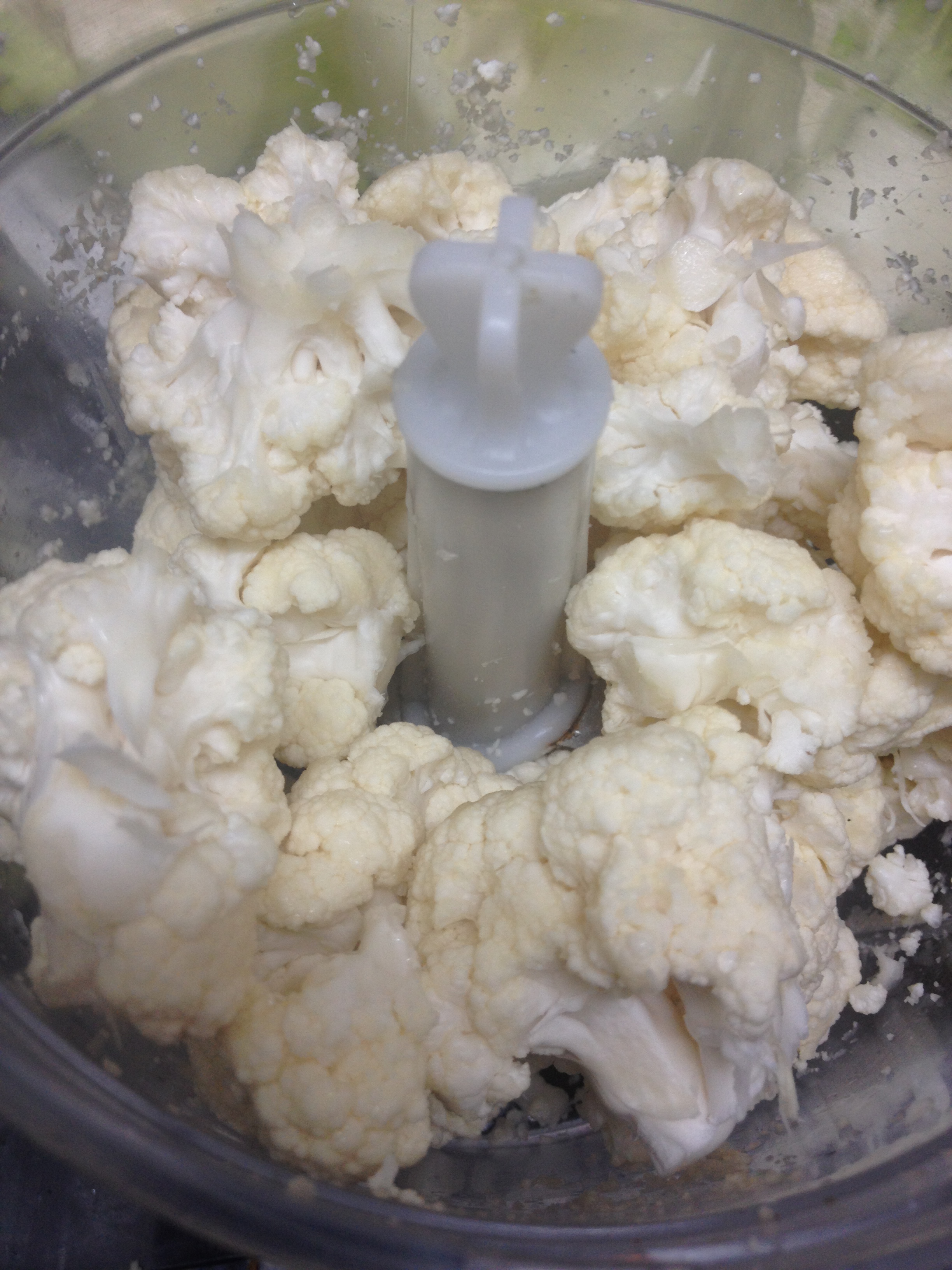 Ahora vamos a poner varios ramilletes en el típico cacharro picador que traen algunas batidoras y trituramos durante 5-6 segundos (más que suficiente). Si no tienes este cacharro, lo siento amiga, vas a tener que picar a mano durante un ratito. Otra opción antes de que te tires de un puente, es rallar la coliflor, aunque esta opción no es tan resultona como picado con la batidora o a mano.
