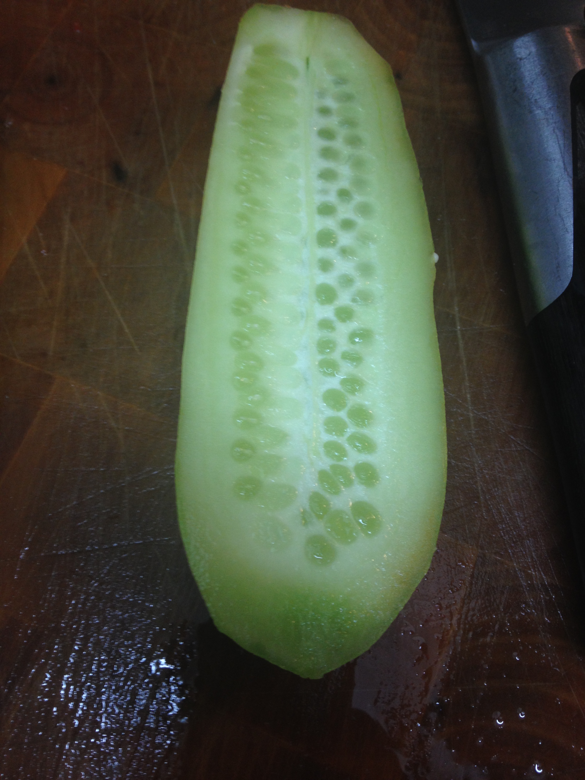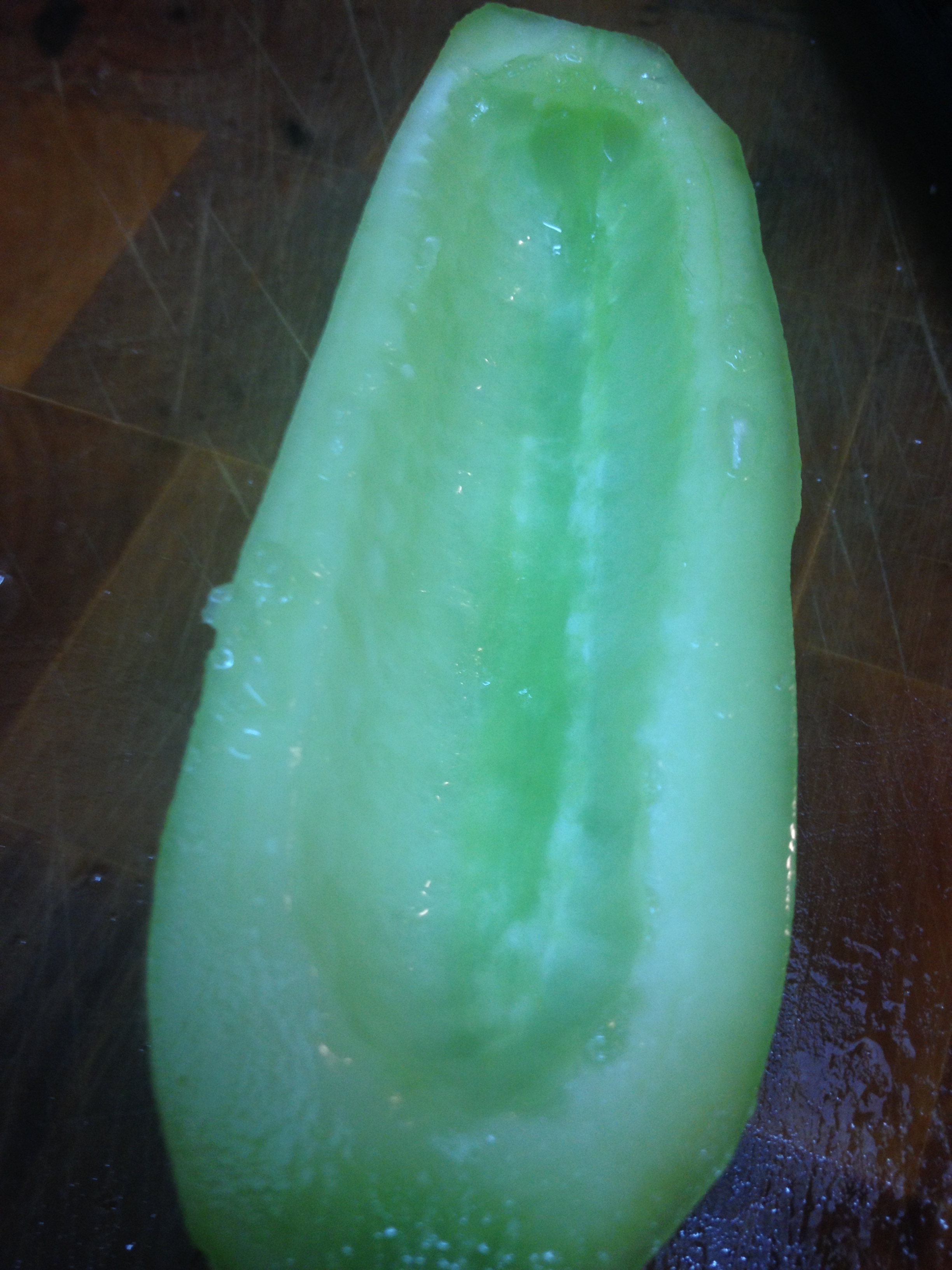 Pelamos el pepino (por favor, calmaos), lo partimos por la mitad y con una cucharilla rascamos la parte interna para eliminar las pepitas, que son la parte indigesta del pepino.