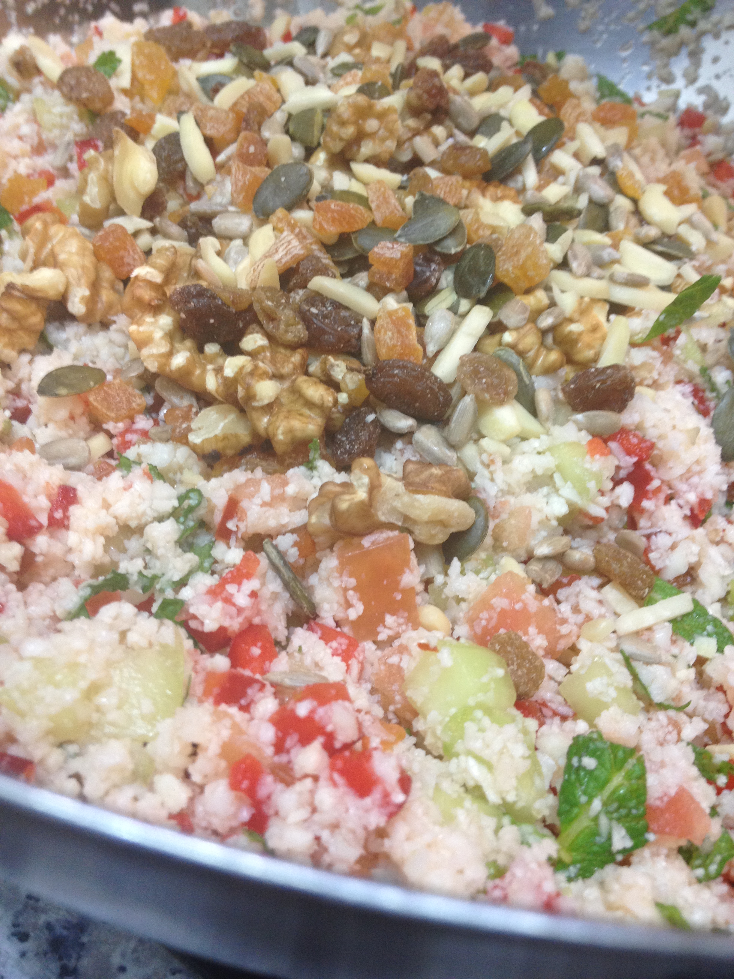 Para acabar, echamos el cuscús de coliflor, los frutos secos, el zumo de medio limón, sal y comino y removemos bien.