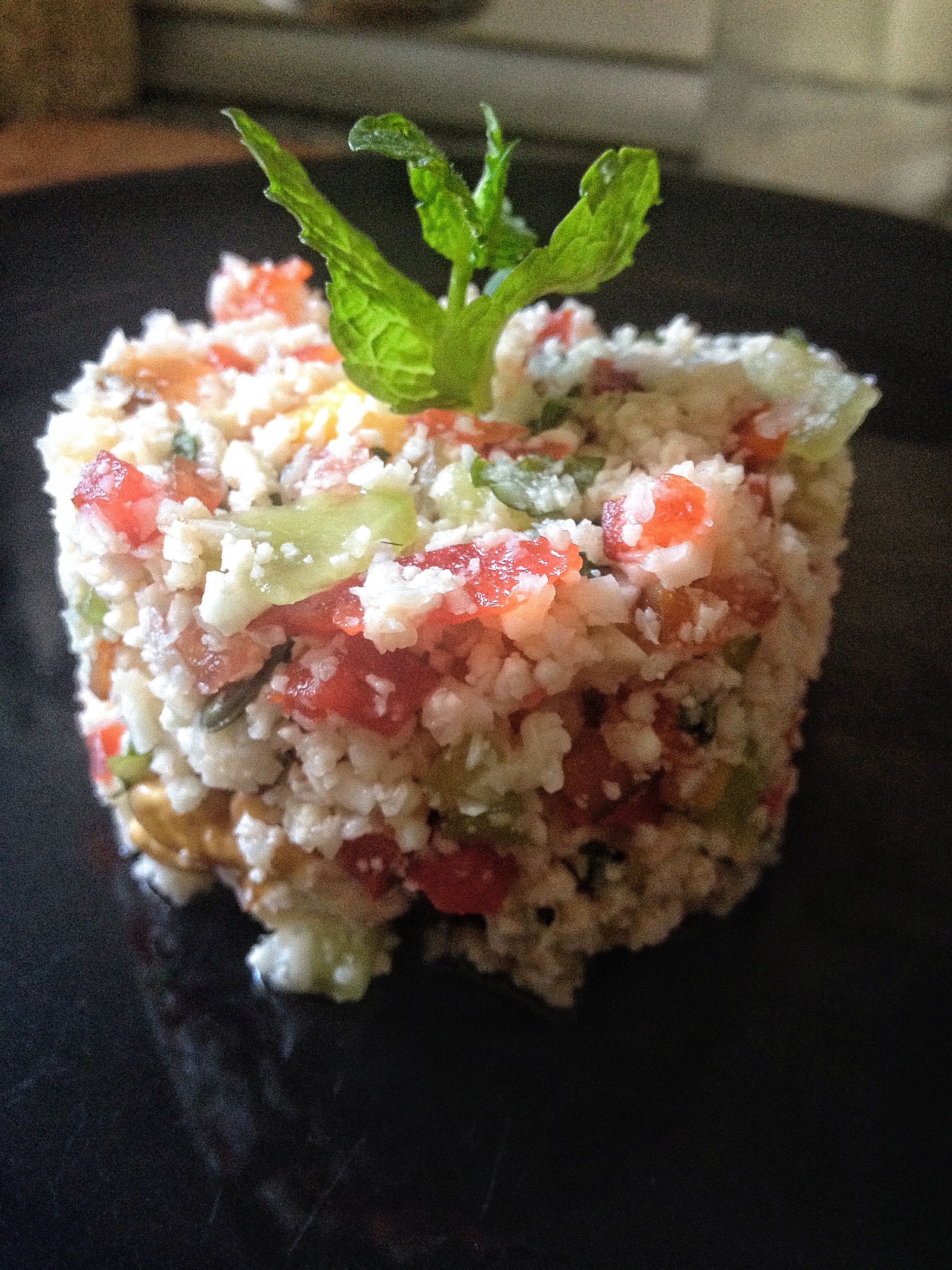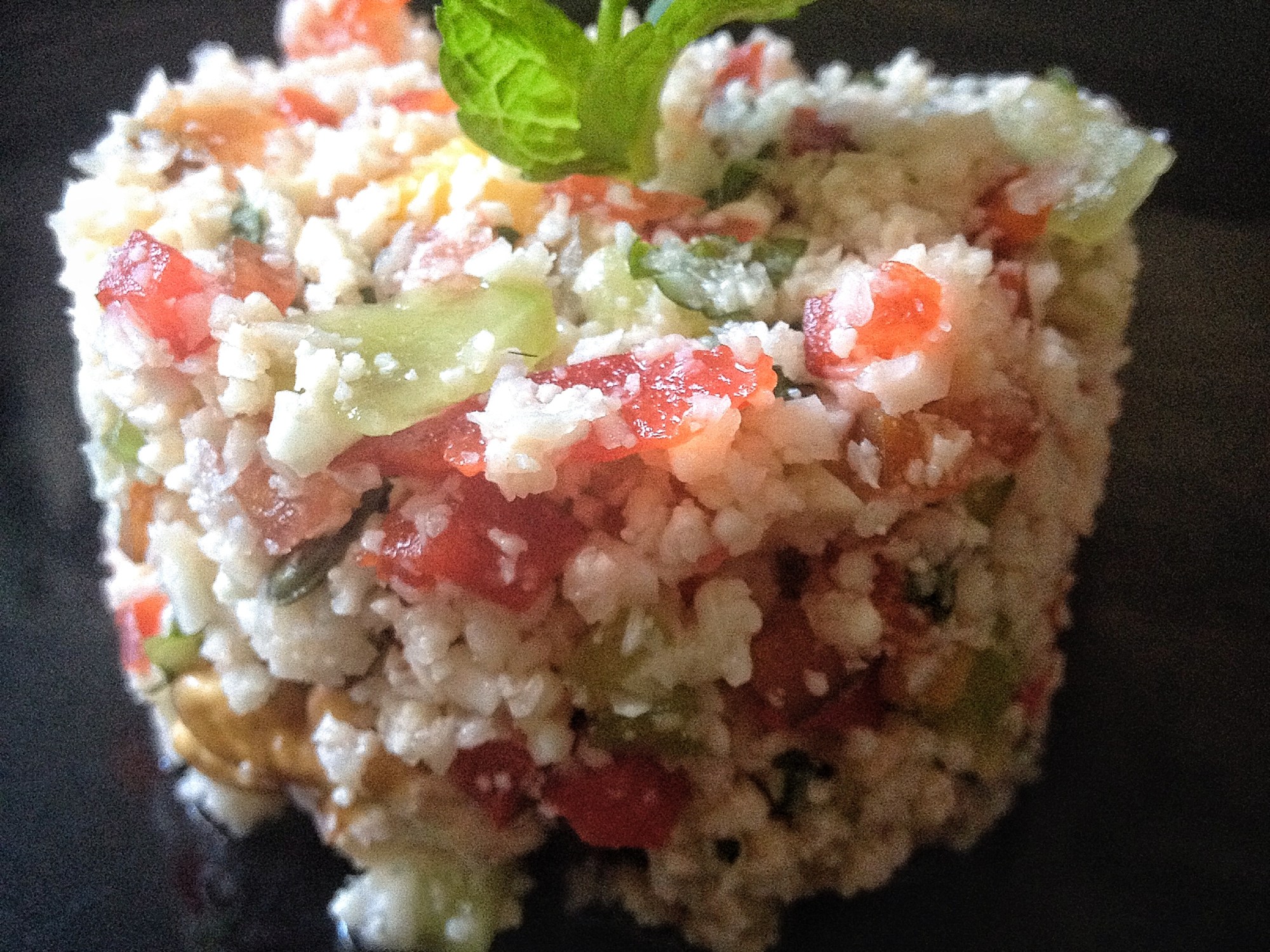 Analizados todos los traumas acepté el reto y después de un rato me vino a la cabeza haber visto en algún programa tipo Monster Chef o similar que alguien usaba la coliflor para hacer cuscús con ella. Mirando en la red encontré varios ejemplos, entre ellos en El Comidista, que explicaba que esta historia se le ocurrió a Ferrán Adrià en una de sus idas de olla habituales. Pensé en recetas que llevaran cuscús y que ayudaran a no convertirnos en las personas-más-obesas-de-Europa, ahora que tenemos ya el verano cerca y por todos tenemos que sacar nuestras chichas al aire, ya sea en la playa, en el supermercado, en el H&M, en las alcantarillas o subidos en la barra del bar cuando te vas a marcar un bar-Coyote y te tiras un cubo de hielos por encima de los pezones.