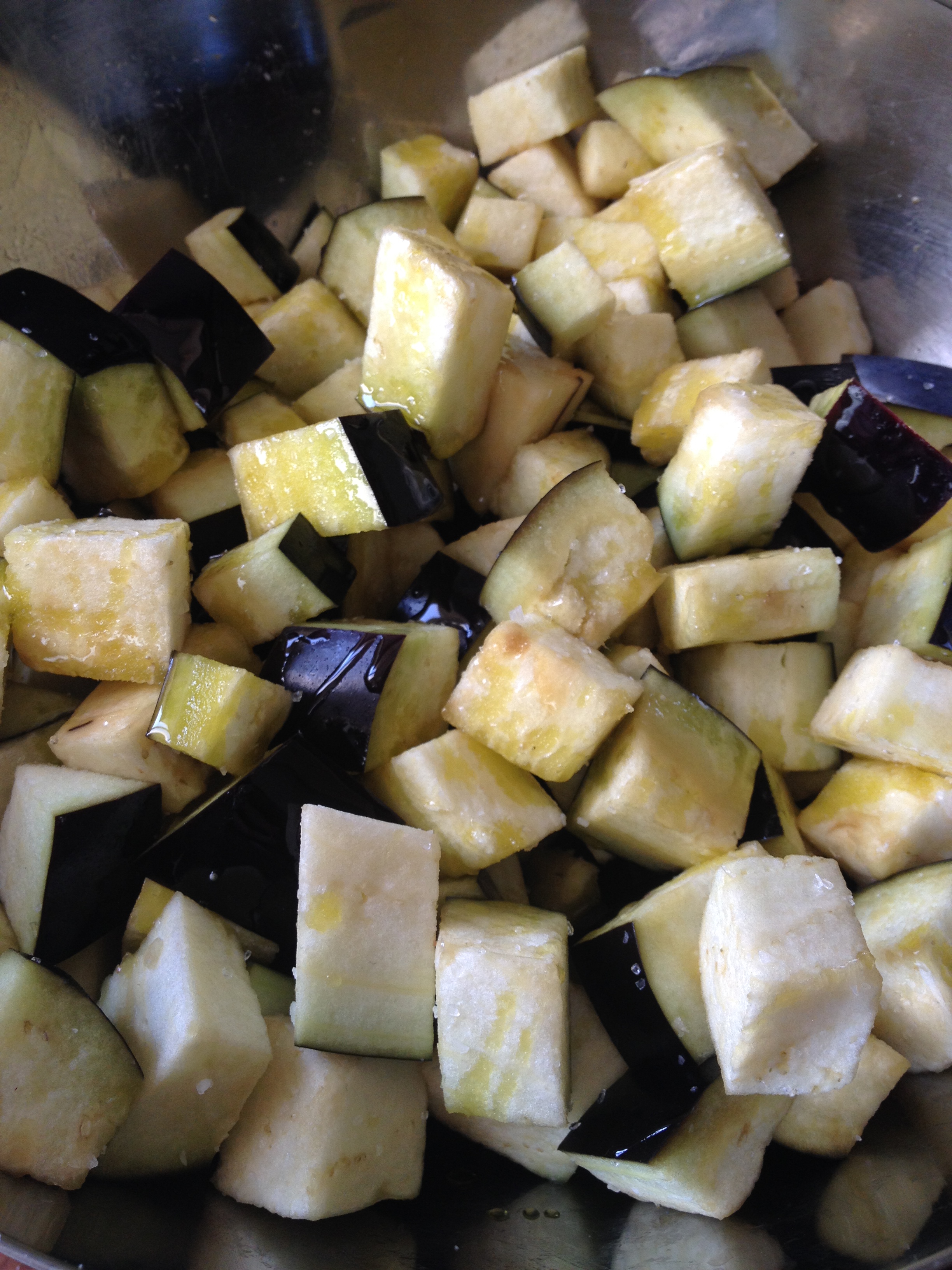 Comenzamos haciéndole un Lorena Bobbit a la berenjena; esto es cortar el rabo, como sabéis. Una vez castrada, partimos la berenjena por la mitad y cada una de estas debemos partirlas en dados de 2×2 cm o un poco más grandes, para que sean majos y no se pierdan del todo en la preparación.