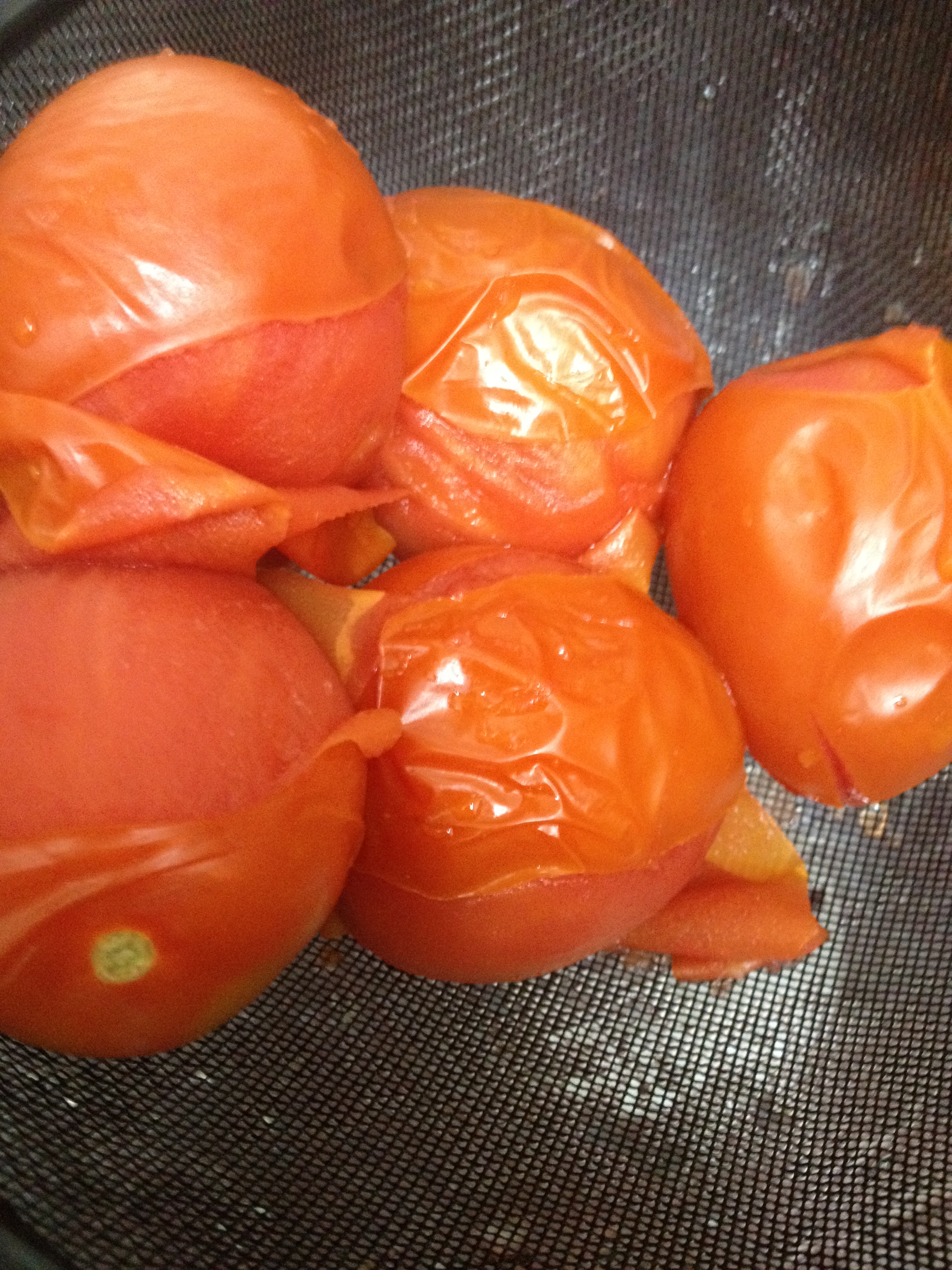 Mientras reposan, puedes observar tu tercera teta, o bien puedes ponerte a adelantar con los tomates. Lavamos bien, hacemos un corte de cruz en el culete del tomate, y los ponemos en abundante agua hirviendo durante 30 segundos aprox. Esto es escaldar, y al sacarlos del agua hirviendo hay que ponerlos en un bol con agua fría. El choque térmico hace que la piel salga muy fácilmente .