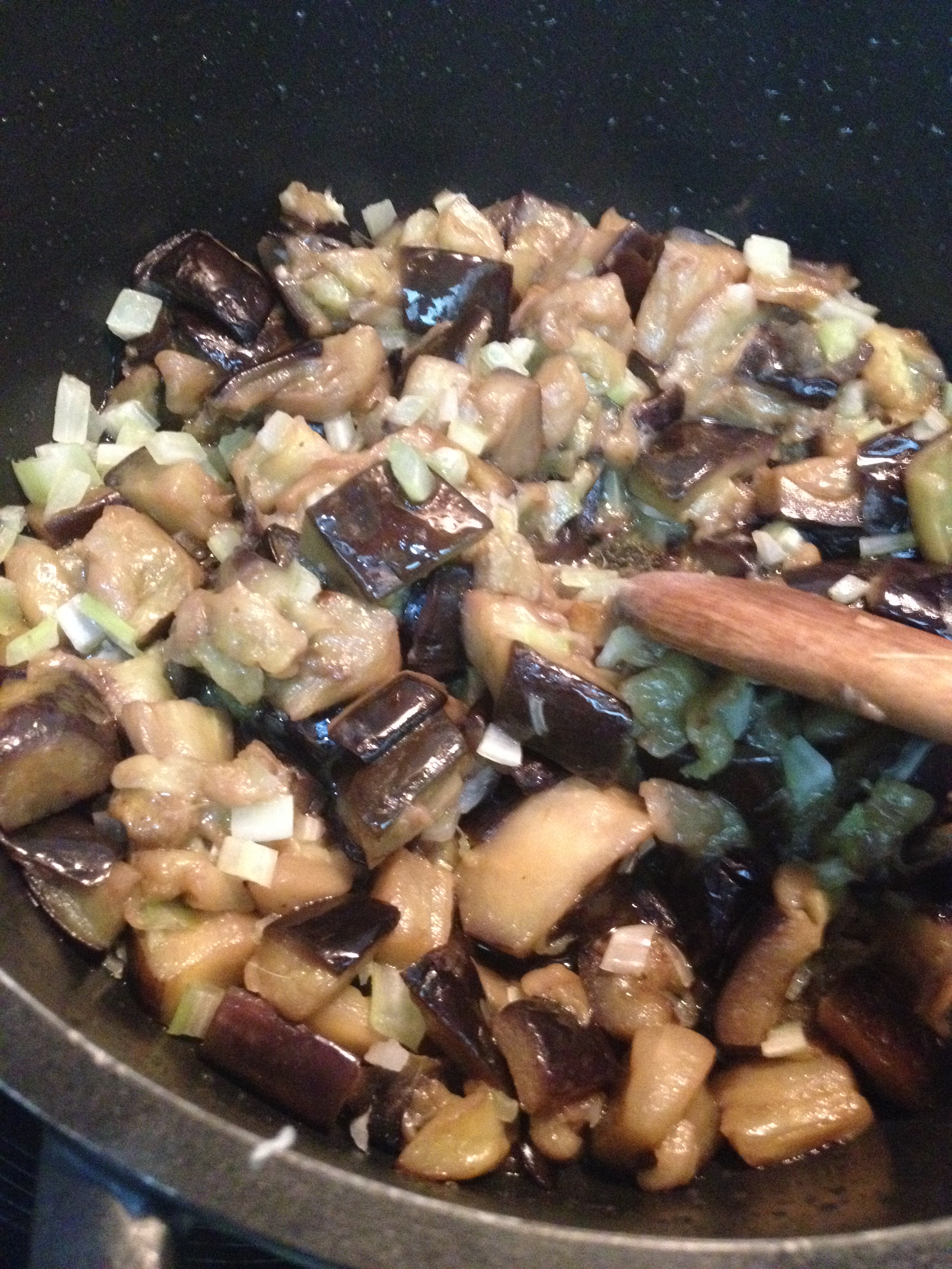Mientras se dora, cogemos las ramas de apio lavadas, y con un pelador, pasamos por las estrías de arriba a abajo hasta dejarlo más o menos plano todo (estamos eliminando fibras que luego son un coñazo en la boca). Ahora cortamos en brunoise o daditos pequeños. Cuando se dore la berenjena, ponemos el apio y le damos unos 5-10 minutos a fuego medio.