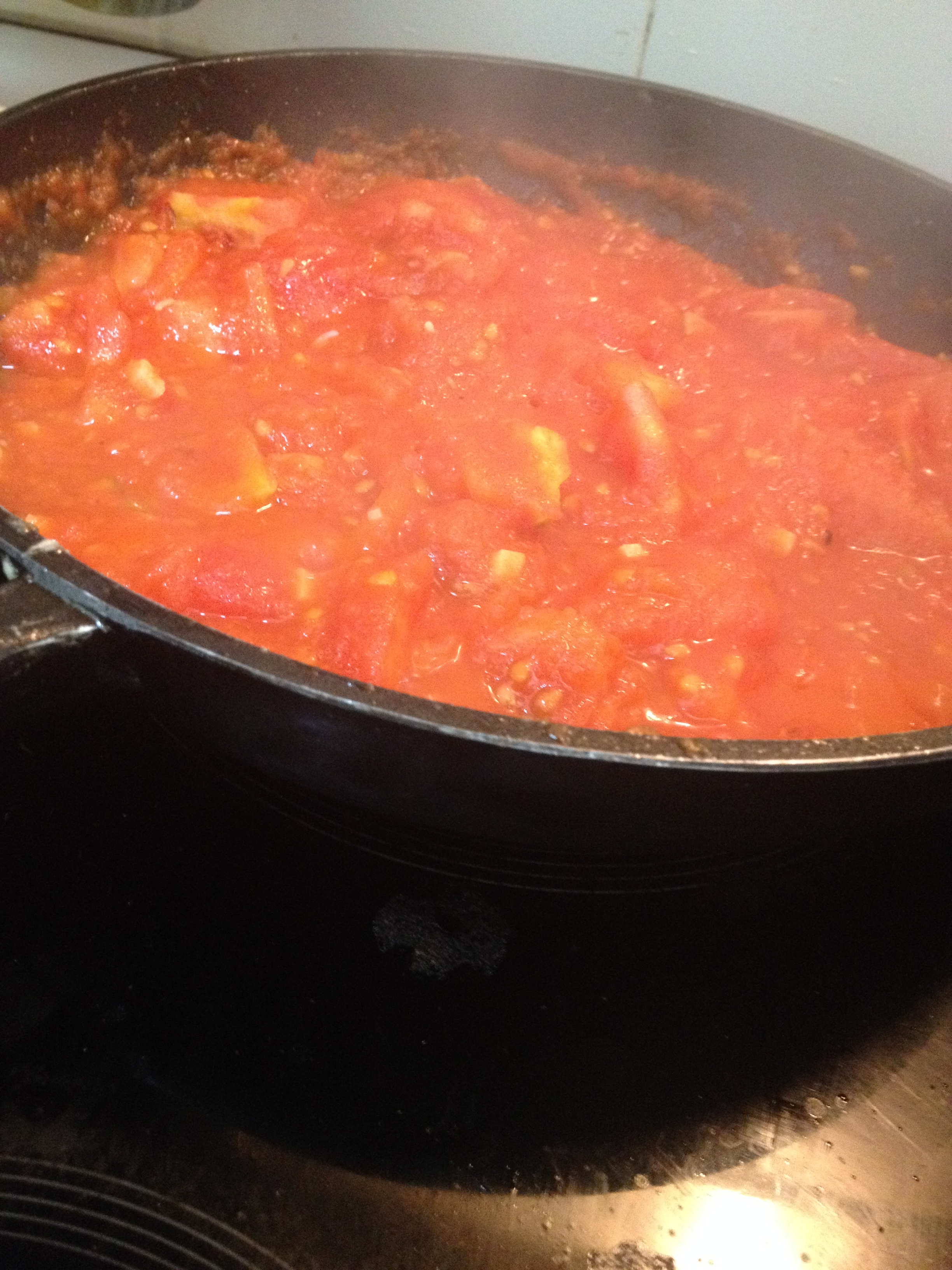 Pasado ese tiempo, empieza el sexo duro. Añadimos los tomates a la cazuela grande, removemos todo bien y mantenemos a fuego medio-bajo durante 3 minutos, apartando ya del fuego para que se termine con el calor residual.
