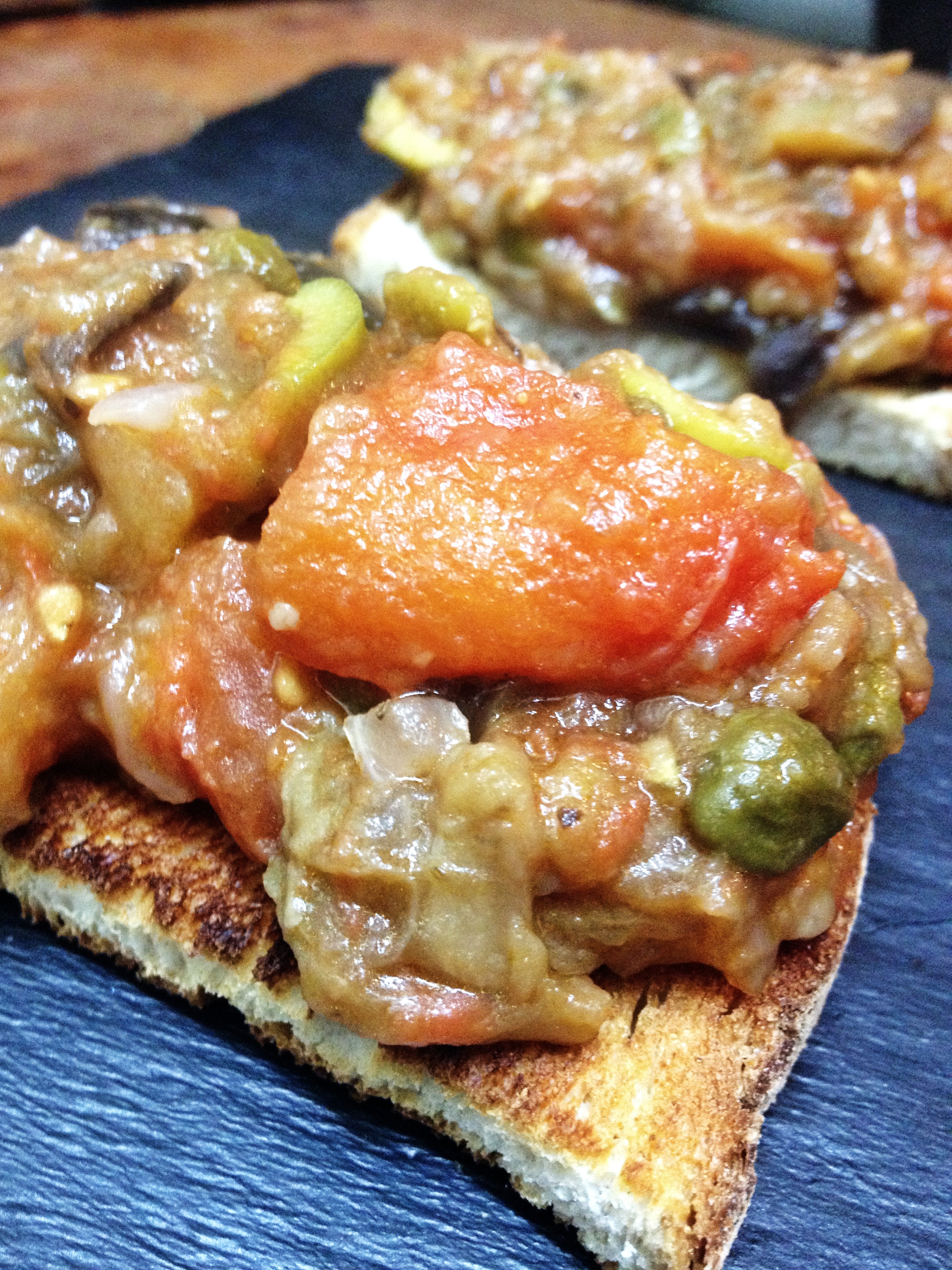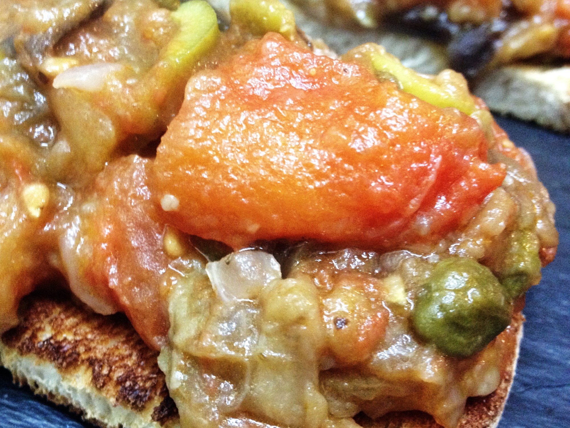 Para acabar, coged el mejor pan que tengáis a mano, haced un par de rebanadas por persona, tostar bien, y poner la cantidad que queráis de caponata por encima. A mí me gusta ser salvaje y ponerle cantidades imposibles de comer con un mínimo de dignidad (mola que todo se caiga porque hay mucho).