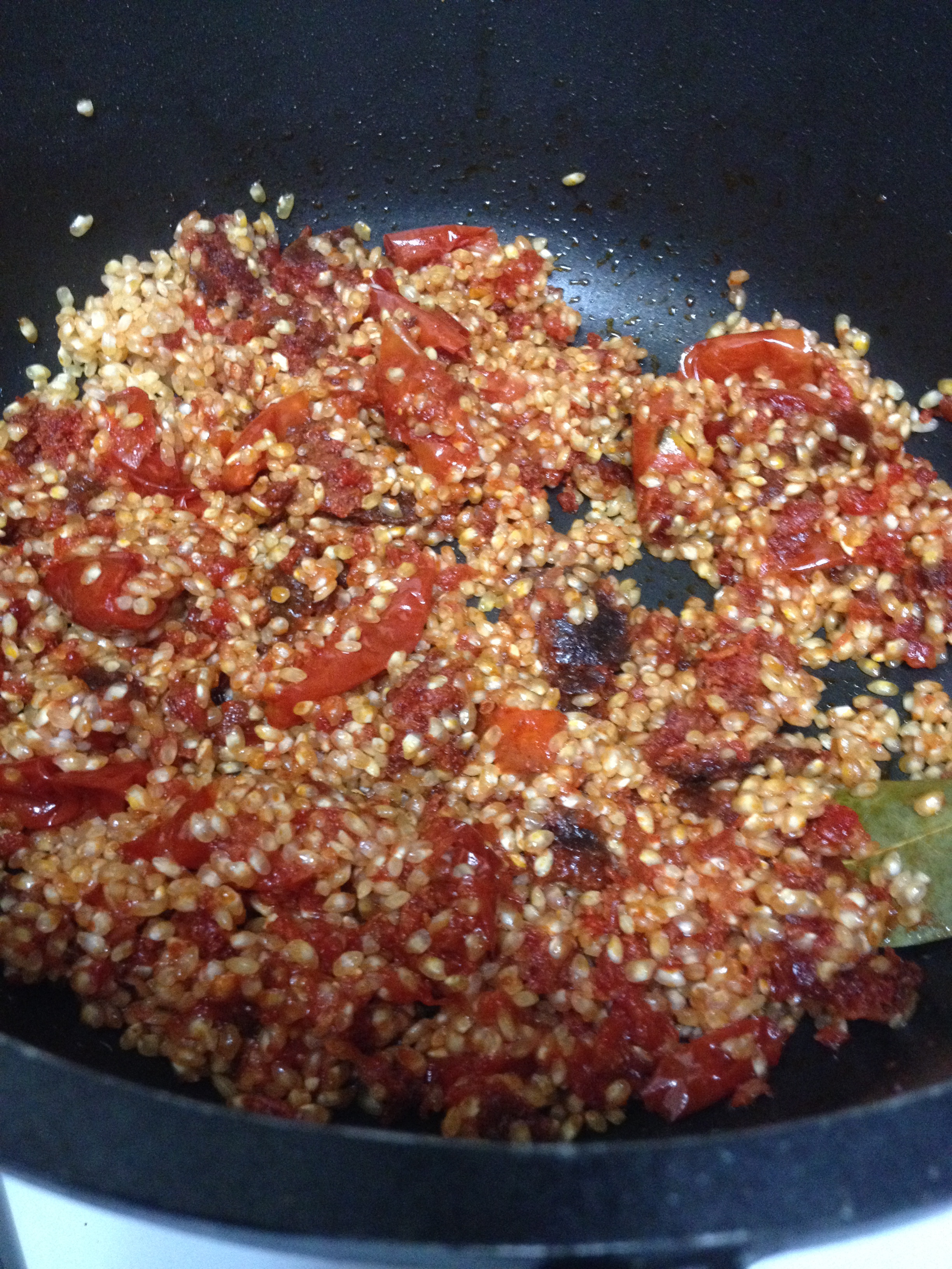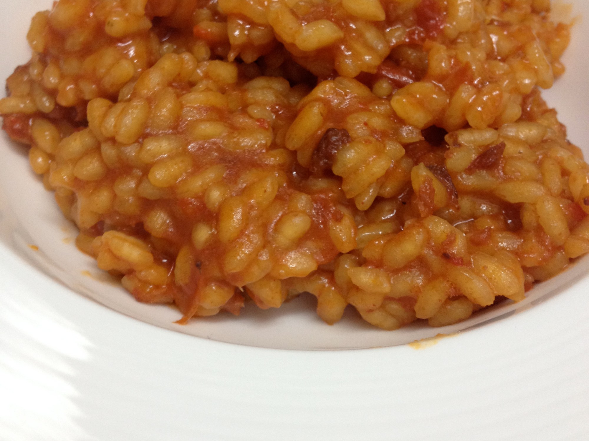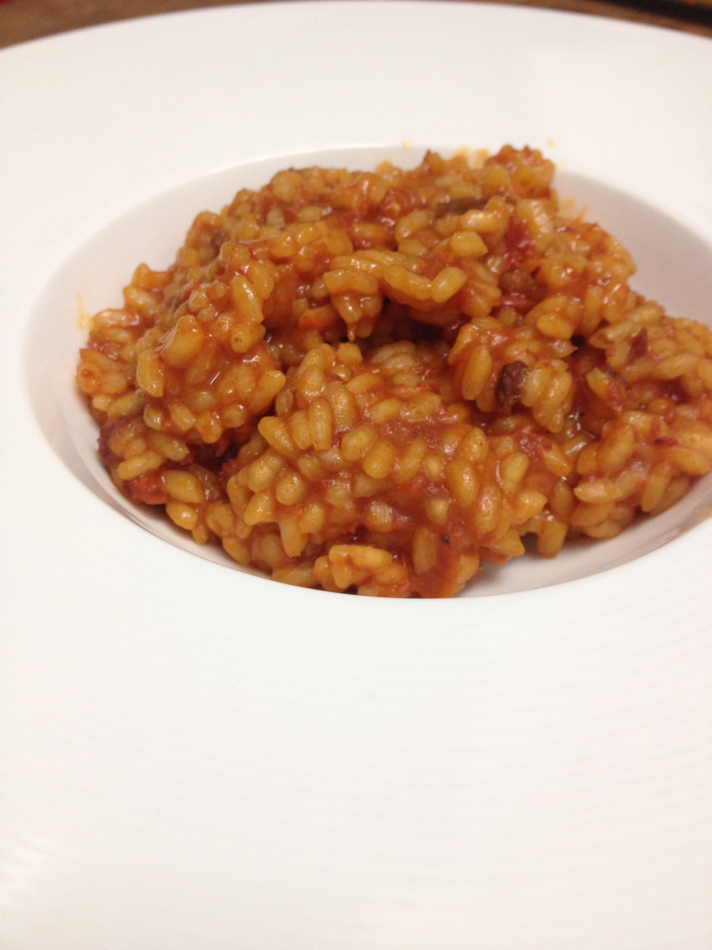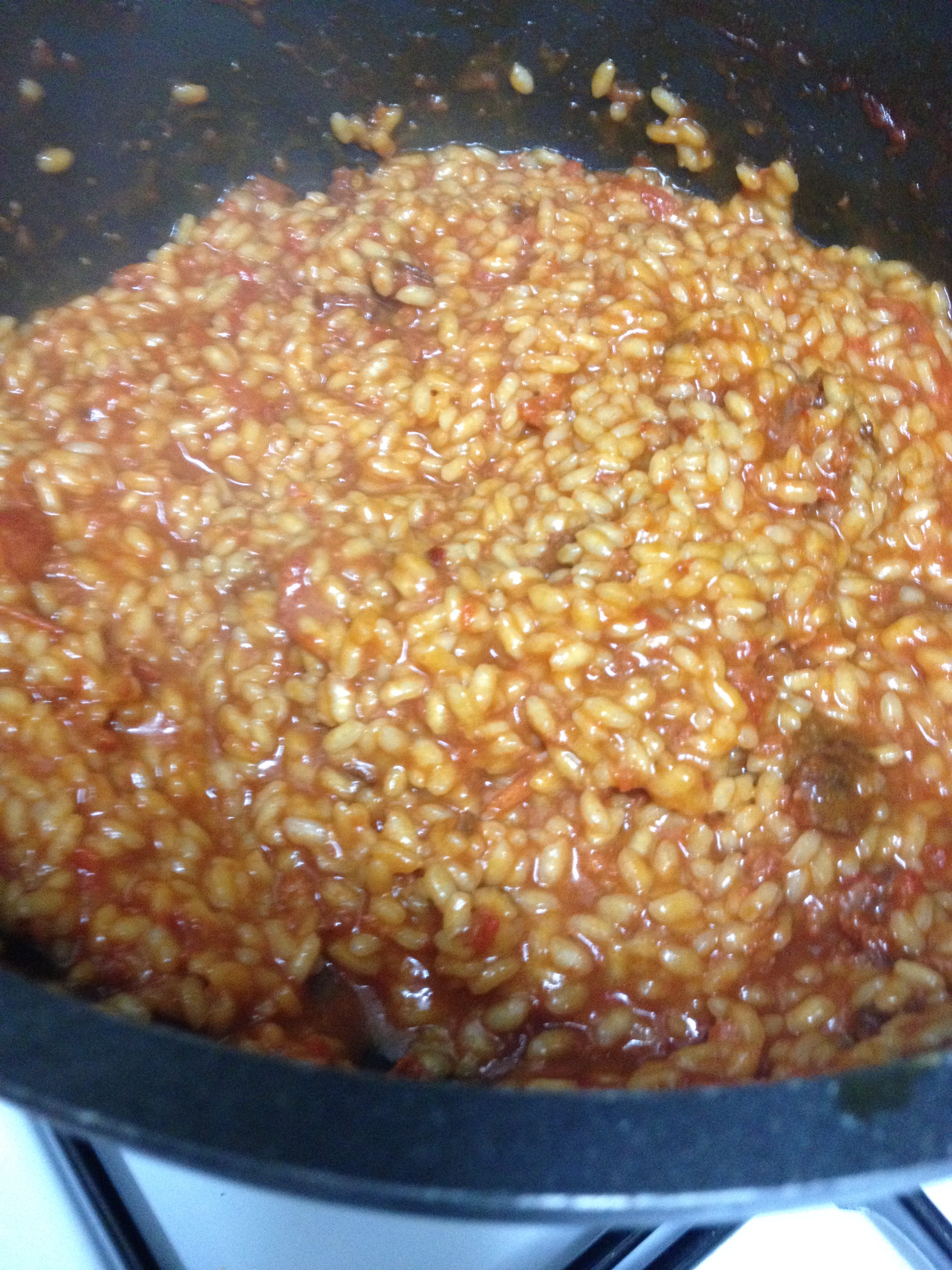 Queridas amigos, queridos amigas, hoy tenemos receta sencilla, EXTRABARATA, y con un sabor que te tira de espaldas. Esta es la receta que tendría que haber presentado al concurso de Canal Cocina de recetas por menos de 5€, pero que mi divertidíiiiiiiiiiiiiisima mudanza no me permitió colgar a tiempo. En principo quería hacer otra receta para el concurso, pero por la manera en la que se me ocurrió esta, merecía acceder a este tipo de recetas. Básicamente la situación fue la siguiente: día de la mudanza, ocho horas de traslado (muebles, electrodomésticos y un perro); llegan las 22 de la noche y no tenemos una basura que echarnos a la boca. Tiendas cerradas; drama extremo. Abro la caja de comida que había trasladado y encuentro un montón de historias inconexas a priori, junto con 38 botes de melocotón en puto almíbar obtenidos en las maravillosas cestas de navidad. Para llorar. Pero como la necesidad agudiza el ingenio, de pronto se me ocurrió hacer un risotto con una sobrasada de mallorca que tenía por empezar, unos tomates que estaban pidiendo a gritos la muerte, y un poco de arroz que tenía abierto en un paquetillo. El resultado final os aseguro que es la bomba saboril. No os doy más la chapa con mis habilidades mentales para montar un sarao con cuatro cosas y vamos ya a hacer la fucking receta! Preparación. Comenzamos partiendo los tomates y poniéndolos en una olla o cazuela con una hoja de laurel, sal y un chorrín de aceite, previamente precalentado…