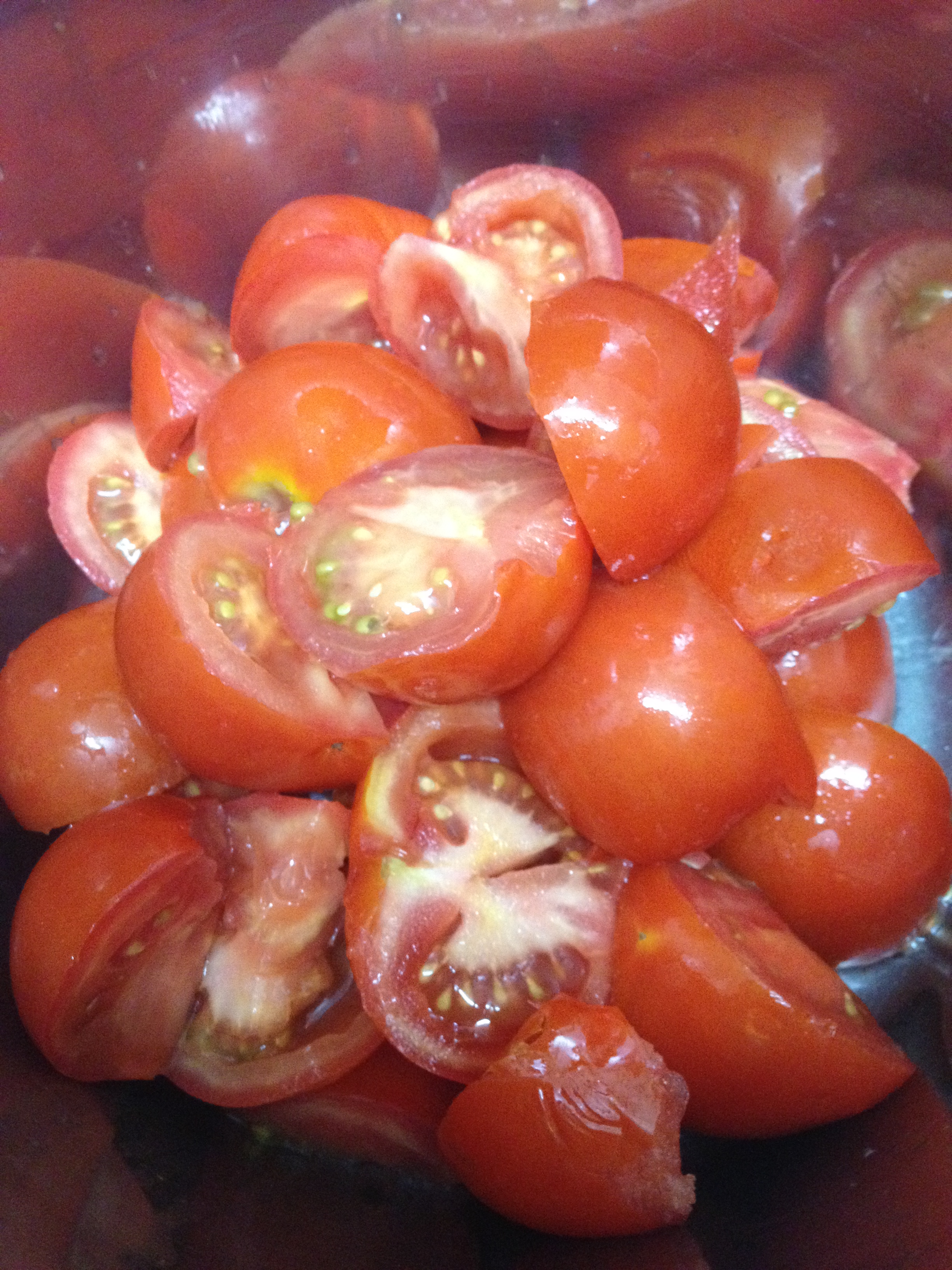 Cortamos los tomates en 2-3 trozos y a la zona de batido. No hace falta cortar más porque vamos a darles lo suyo con la batidora. Eso sí, haced un Lorena Bobbit y quitad los rabos.