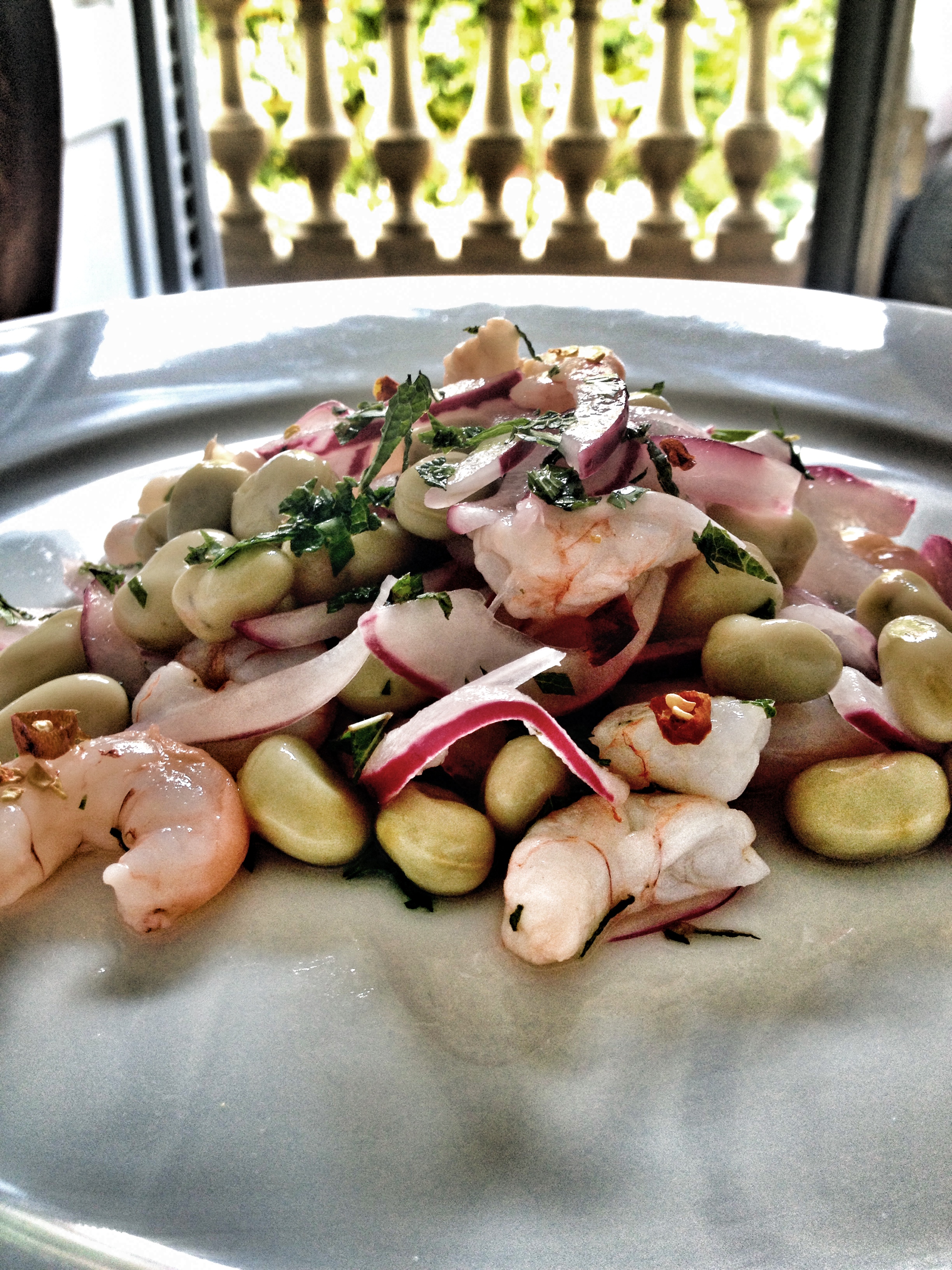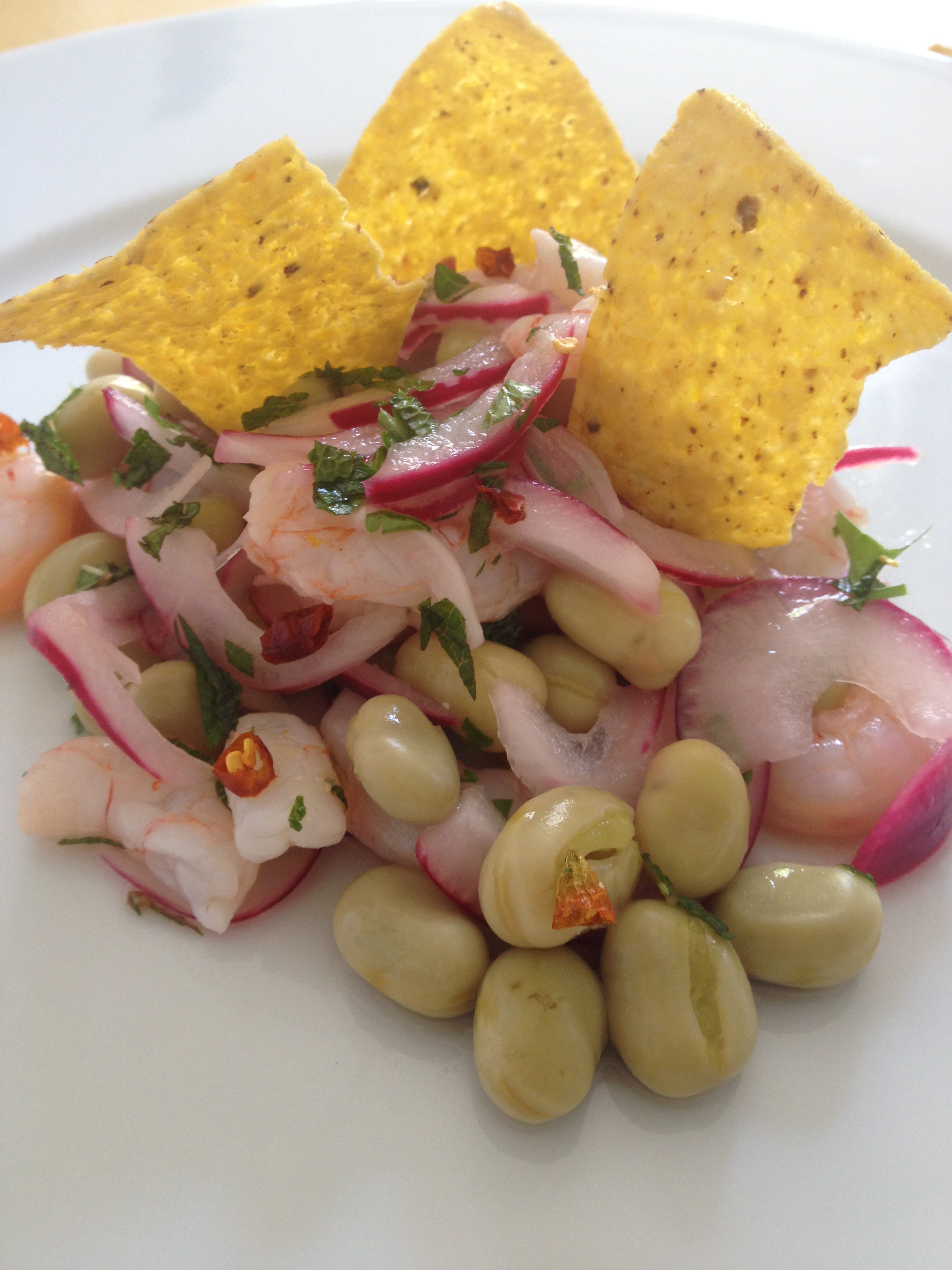 Pasado el tiempo, escurrimos las gambas (no tiréis el líquido guardadlo para aprovechar, guiño-guiño/codo-codo) y las mezclamos con las habitas, la sal, la cayena cortada a tiras , la cebolla bien escurrida y el cilantro y la menta picaditos. Dejamos que el ceviche coja frío en la nevera (2 horitas sería perfecto).