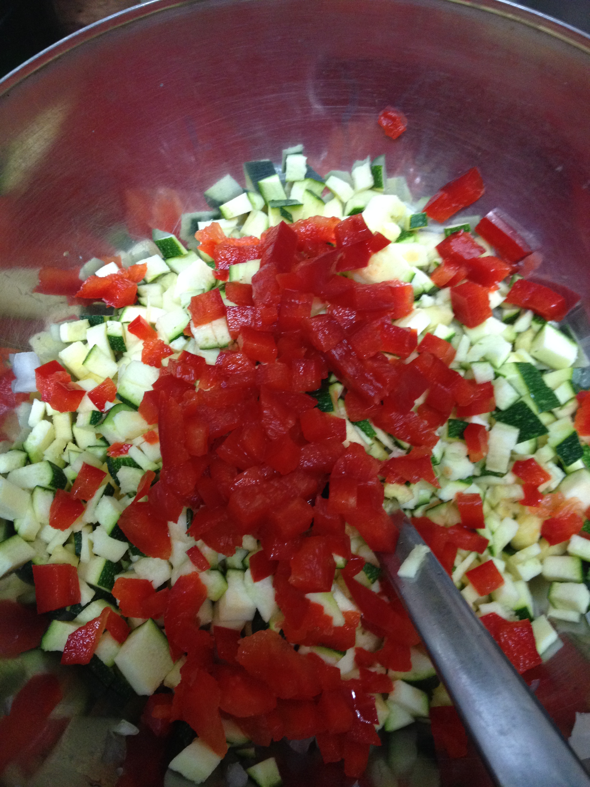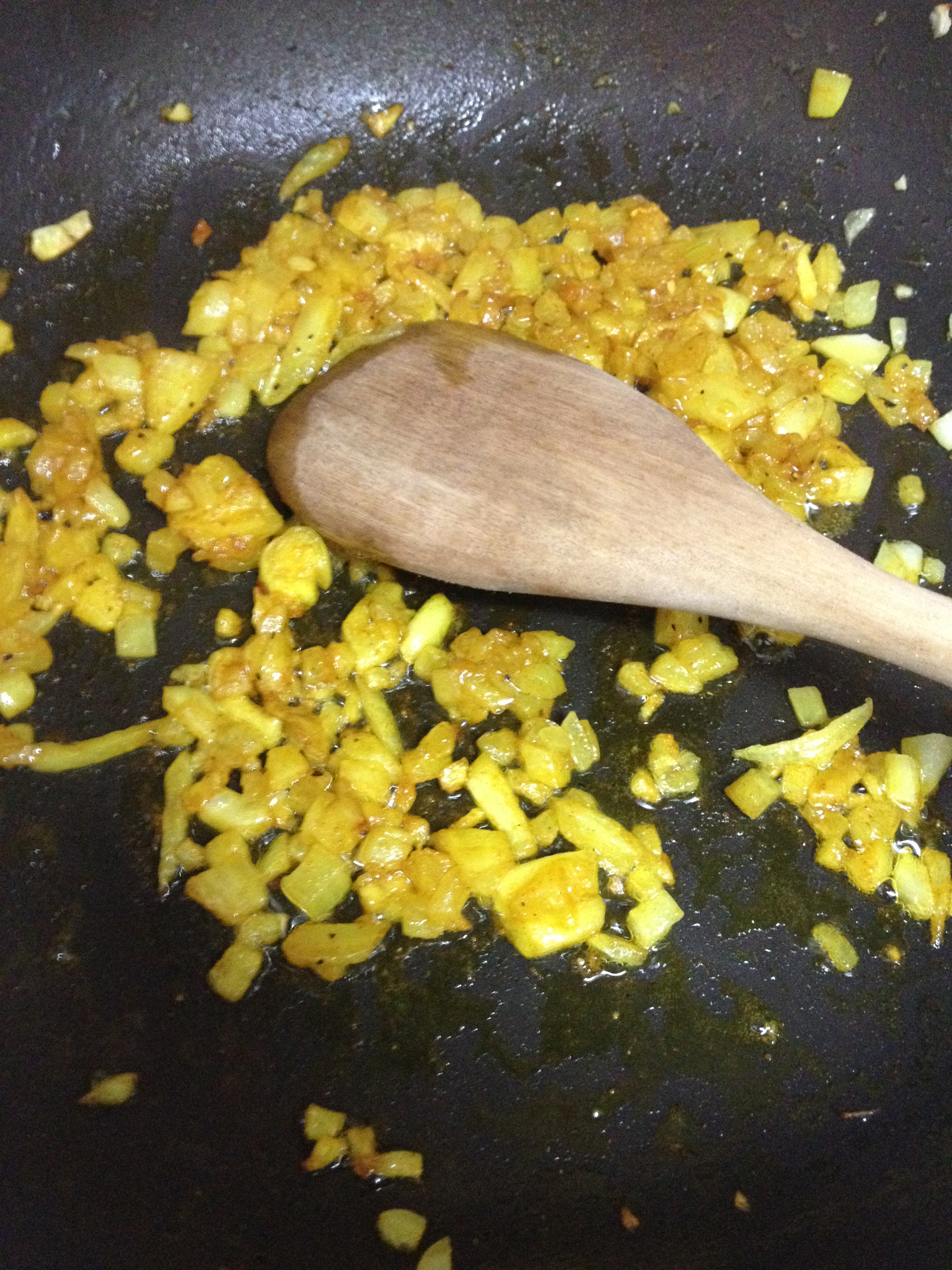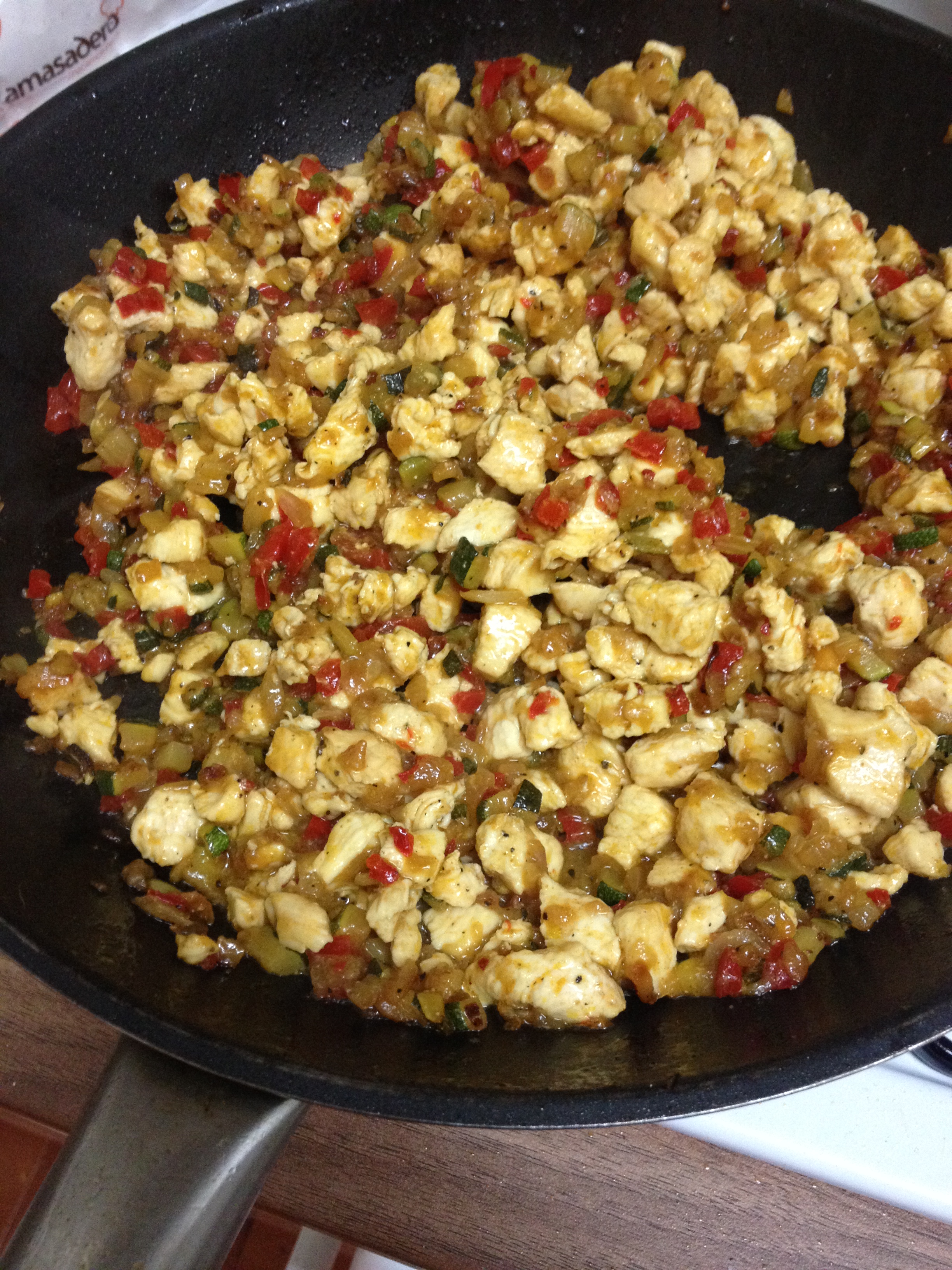 Preparación. No es una receta para ingenieros aeropetrolíferos nucleares, pero sí que tiene sus pasitos, por lo que hay que organizarse bien. En este caso, yo os recomendaría empezar cortando todos los ingredientes y dejarlos listos para luego ir cocinándolos. Empezamos cortando la cebolla, el pimiento y el calabacín en brunoise pequeñita (daditos). Reservamos juntos el pimiento y el calabacín, y la cebolla a parte. IMG_3300 Preparamos cerca todas las especias que vamos a necesitar. Por último, partimos el pollo en tiras como el dedo meñique, y luego estas tiras a daditos como la yema del dedo, o un poco más pequeñas. IMG_3306   Una vez listos todos los ingredientes, ponemos dos sartenes a calentar, una de ellas más grande para toda la preparación de la enchilada, y la otra más pequeñita porque es para la salsa. Cuando estén calientes, ponemos un chorrito de aceite en cada una de ellas (un par de cucharadas como mucho o tres). En la sartén grande ponemos 3/4 partes de la cebolla en brunoise y en la pequeña el 1/4 sobrante. A fuego medio alto en ambas sartenes, vamos a poner en la sartén grande sal, pimienta, el comino y el curry para que empiecen a subir los aromas como la espuma. En la pequeña, ponemos sal, pimienta, el curry, comino y la cúrcuma. Removemos ambas sartenes y vamos dejando que la cebolla poche poco a poco.