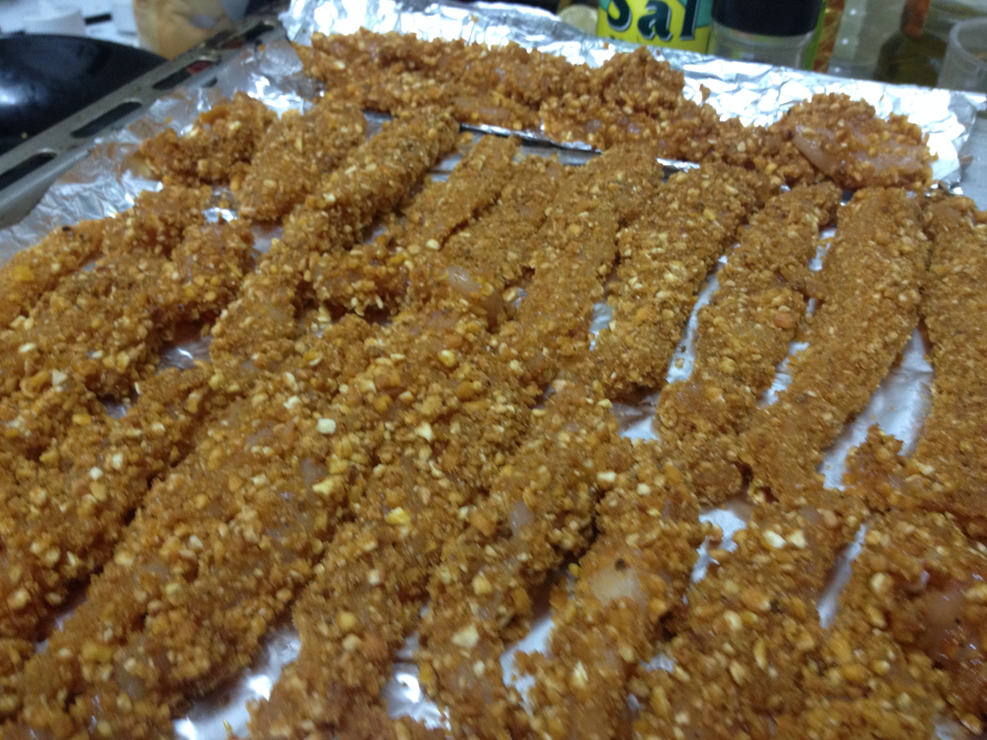 Ahora batimos los huevos, pasamos los fingers por ahí, empanamos con los kikos y vamos dejando en una bandeja de horno forrada con papel de aluminio mientras calentamos el horno a 180º arriba y abajo. Cuando los tengamos todos empanados, rociamos con el spray de aceite o si no tenéis, ponemos un hilillo muy fino por encima de los fingers. Metemos al horno y los cocinaremos en 20 min (10 minutos por una cara, sacar, dar la vuelta y otros 10).