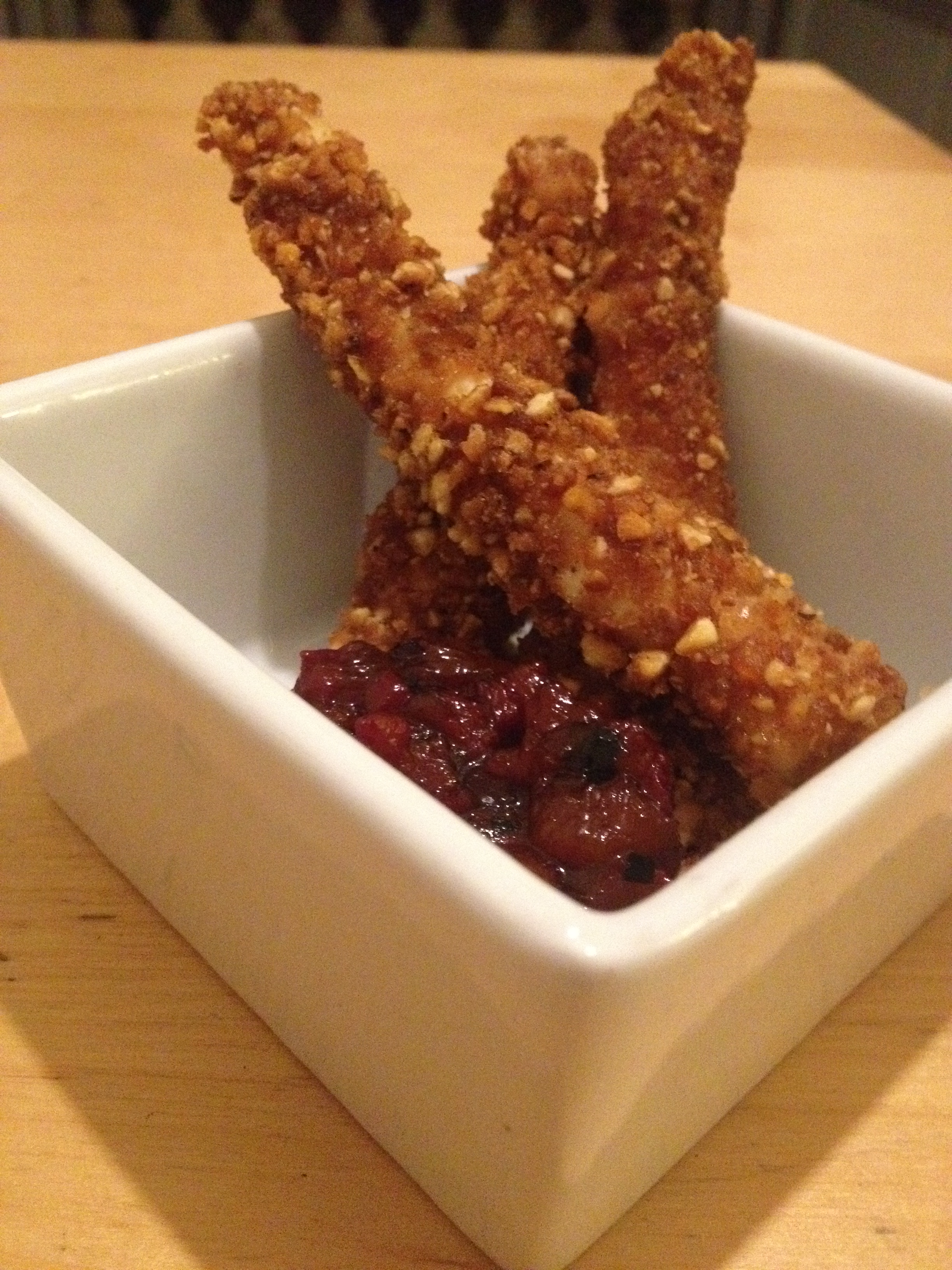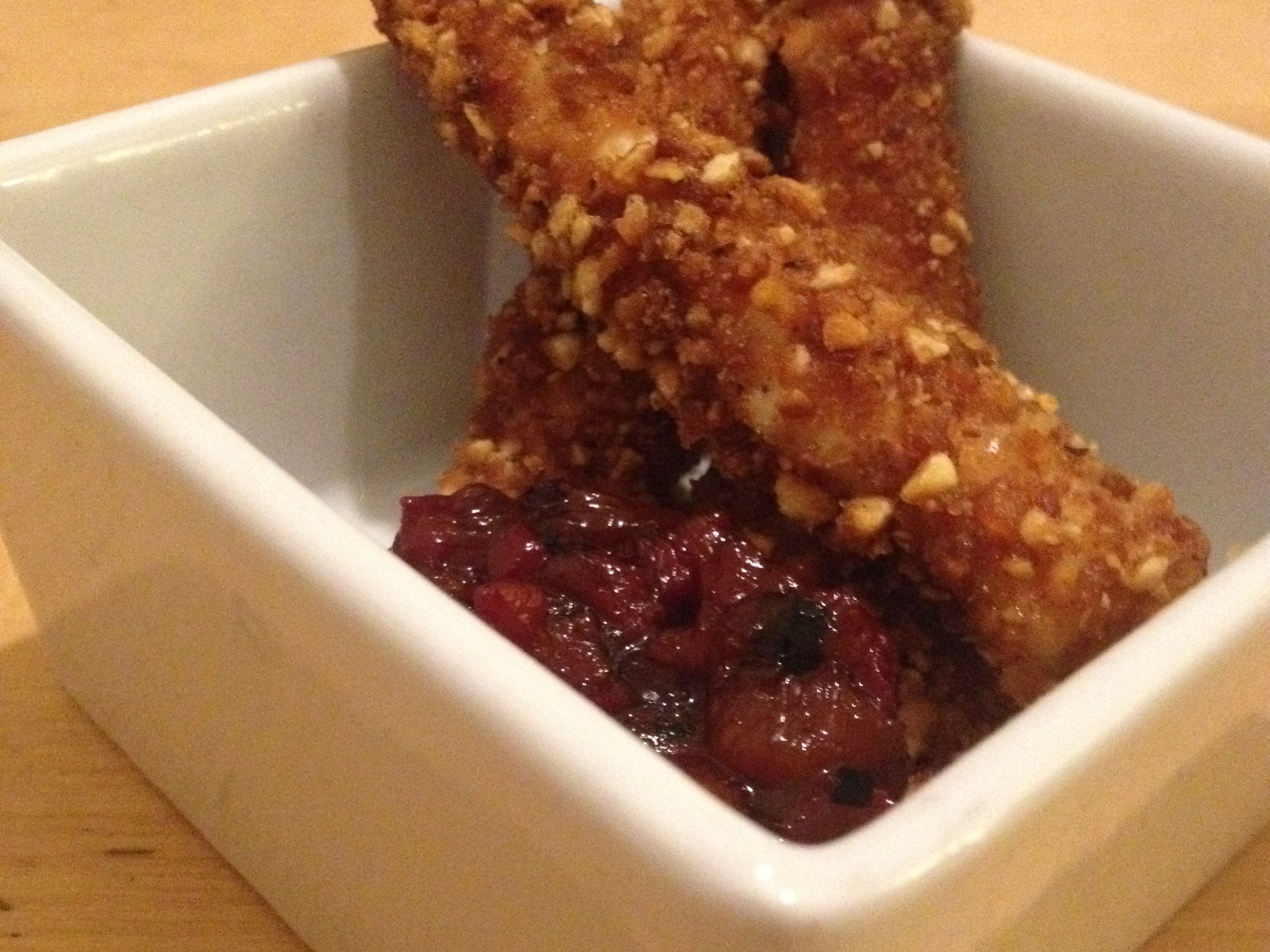 Mientras se enfría la mermelada, vamos con los fingers. Si has decidido marinarlos, lo mejor es que lo hagas antes de la mermelada, para aprovechar tiempos. Para marinarlos, filetea las pechugas con un centímetro de grosor y luego fileteas a lo largo haciéndolos de un par de centímetros de ancho o tres cm; a tu gusto.