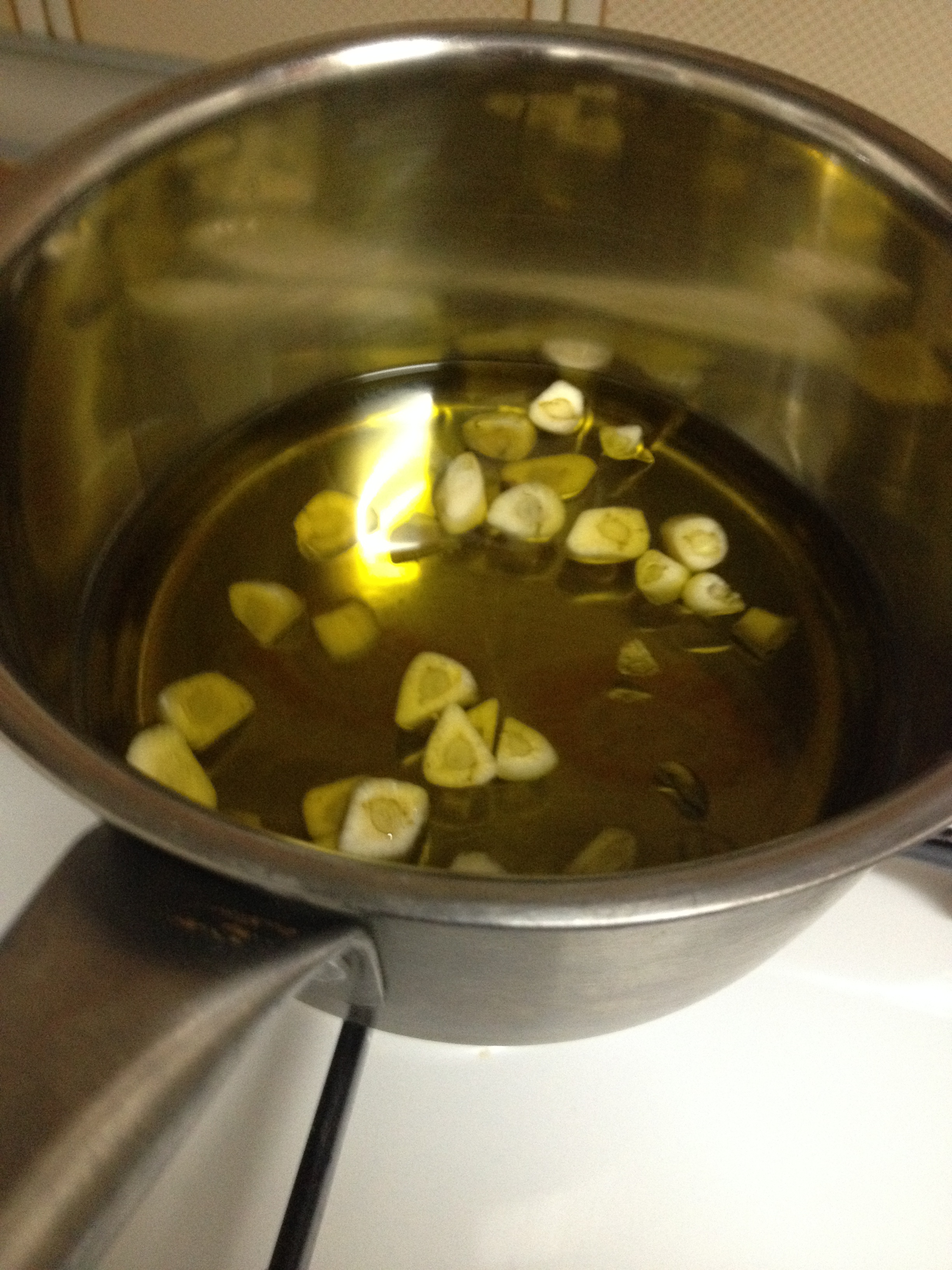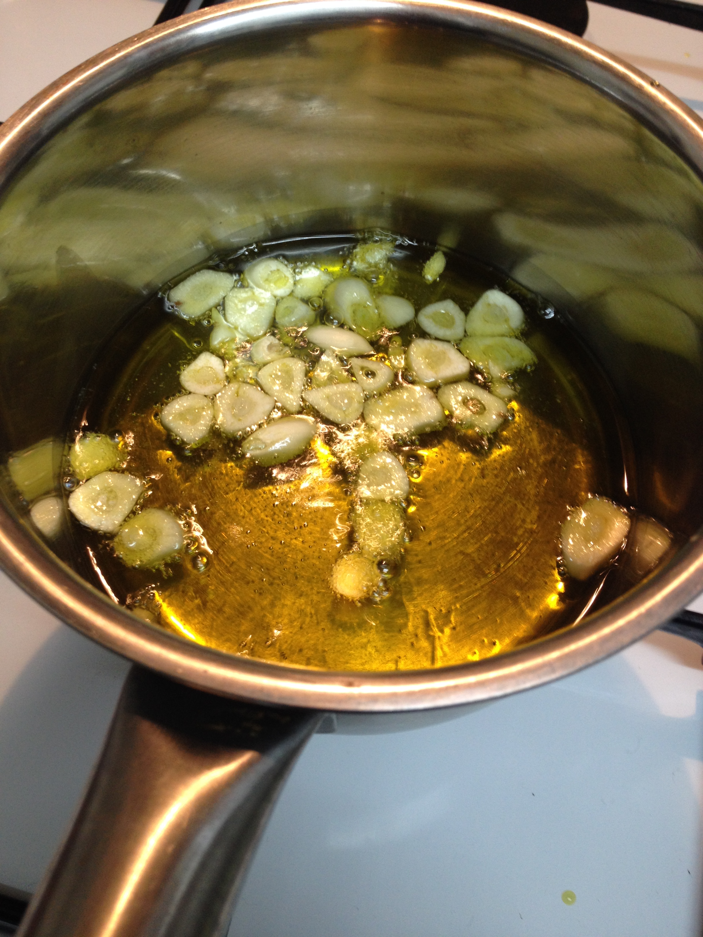 Mientras, nos ponemos con el alioli suave de ajos confitados. Pelamos los dientes de ajo, fileteamos y ponemos en un cazo donde cubriremos con aceite de oliva virgen. Un par de dedos es suficiente. No sufras por el aceite, porque luego lo usaremos para el alioli. Confitar significa que la temperatura del aceite debe permitirte meter un dedo en él y que no te peles hasta el hueso. Ponemos el fuego al mínimo y tenemos que controlar que el producto no burbujee. Si lo hace, tenemos que bajar la temperatura o ir apartando del fuego. En unos 10-15 min tendremos los ajos perfectos y el aceite infusionado de maravilla. Para los que sois sufridores del ajo, confitándolos pierden bastante mala hostia, así que es una buena idea para suavizar el alioli.
