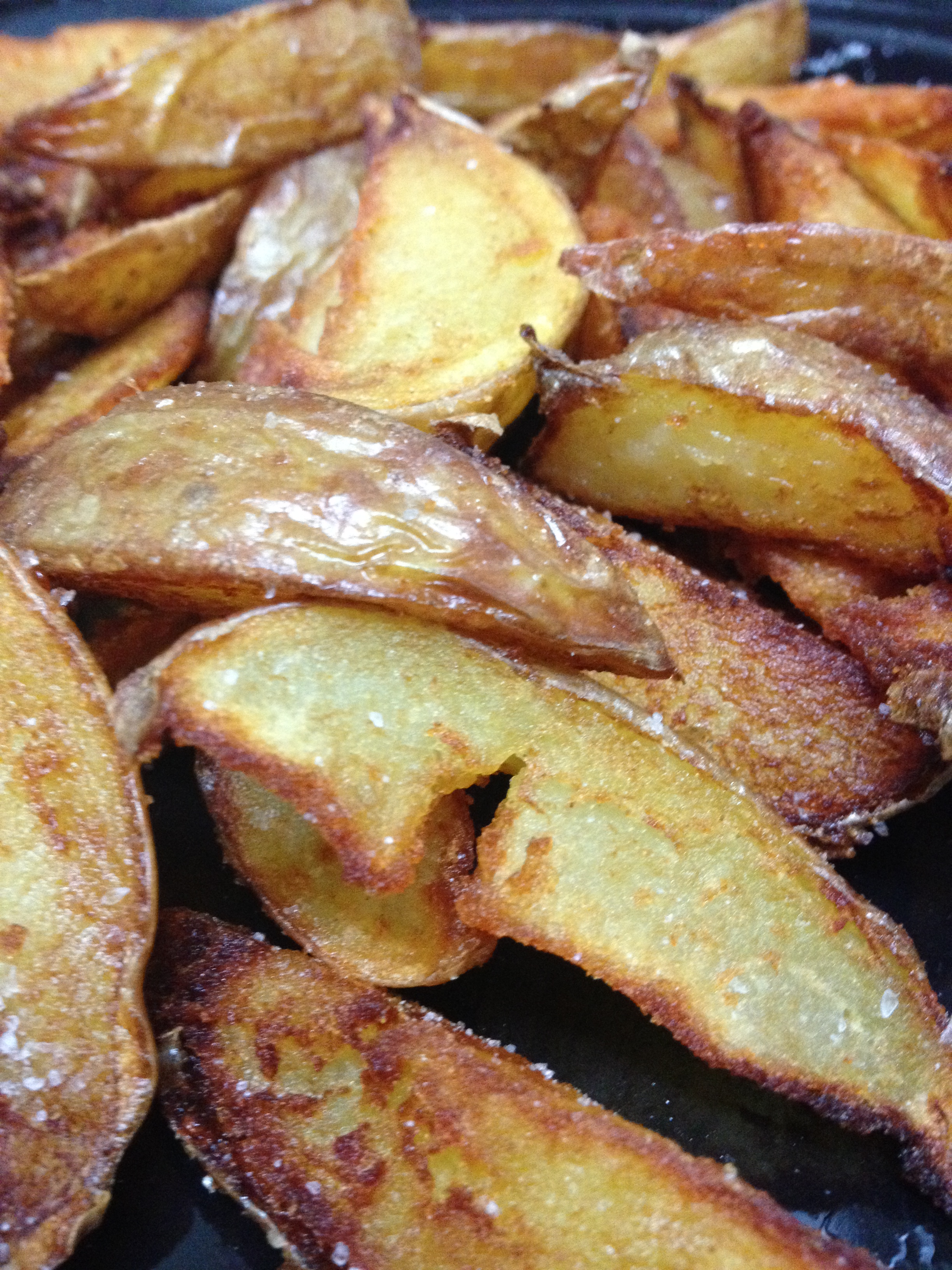 Ahora vamos a partir las patatas (las hemos puesto en el micro con piel, collares y todo) en gajos y ponemos bastante aceite a calentar en una sartén. Cuando esté a punto de humear, ponemos las patatas bien secas y cocinamos hasta que se doren. Como antes las hemos cocido, ahora sólo necesitan coger un punto crunchi y tostado por fuera. Vamos friendo por tandas para no bajar mucho la temperatura y que la patata se impregne repugnantemente de aceite. Cuando las tengamos, sacamos a un papel secante para quitar los restos de aceite y espolvoreamos sal.